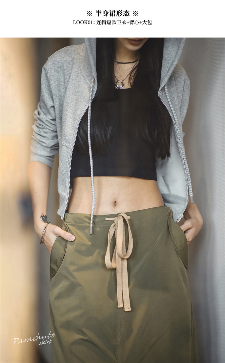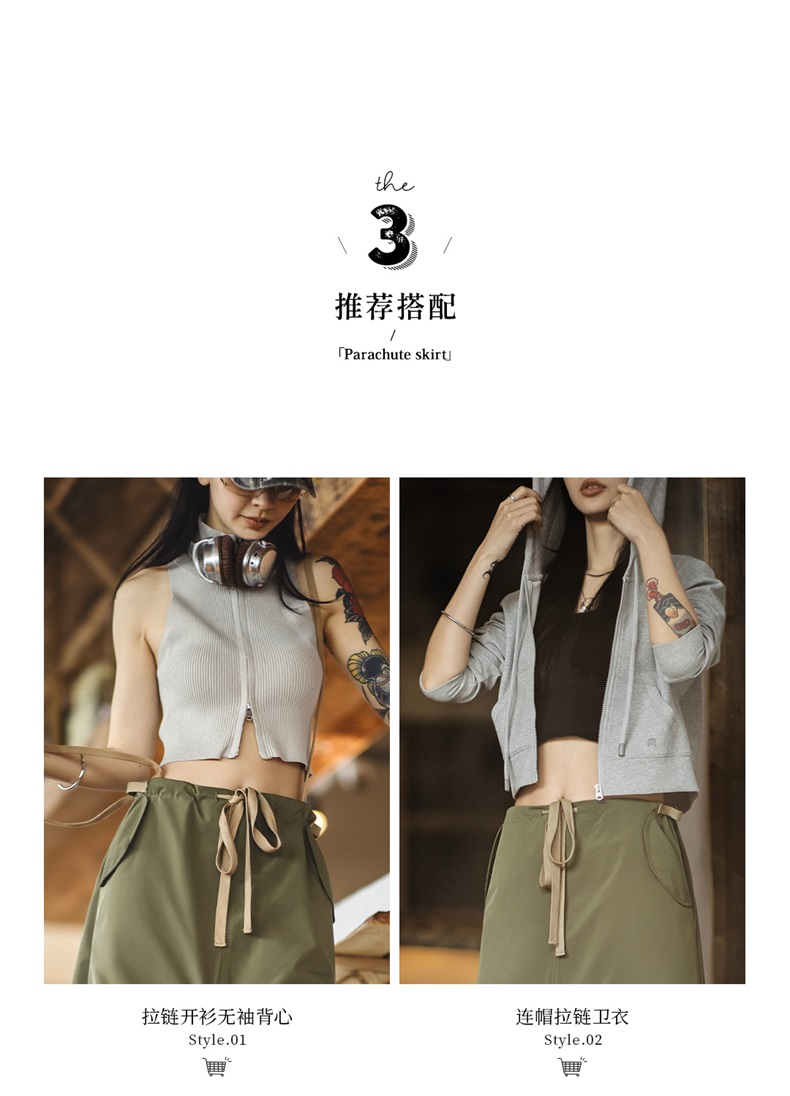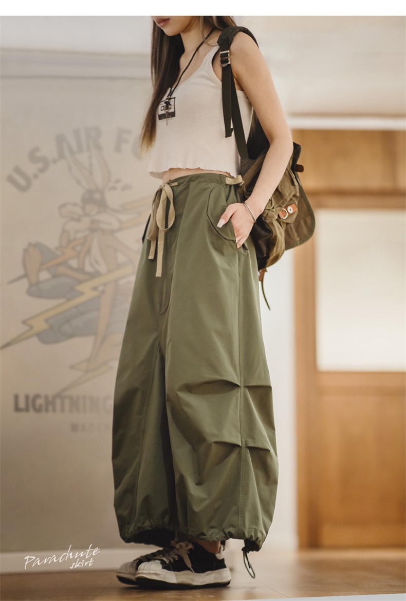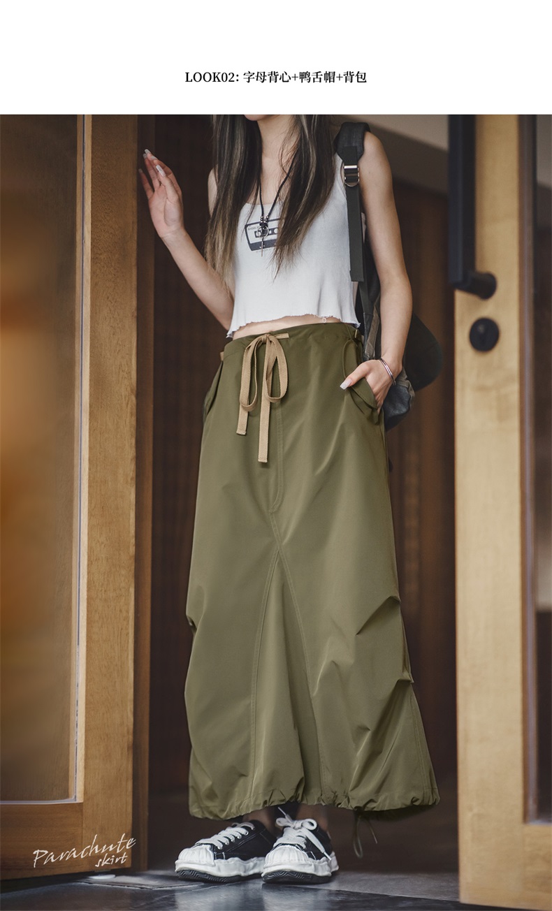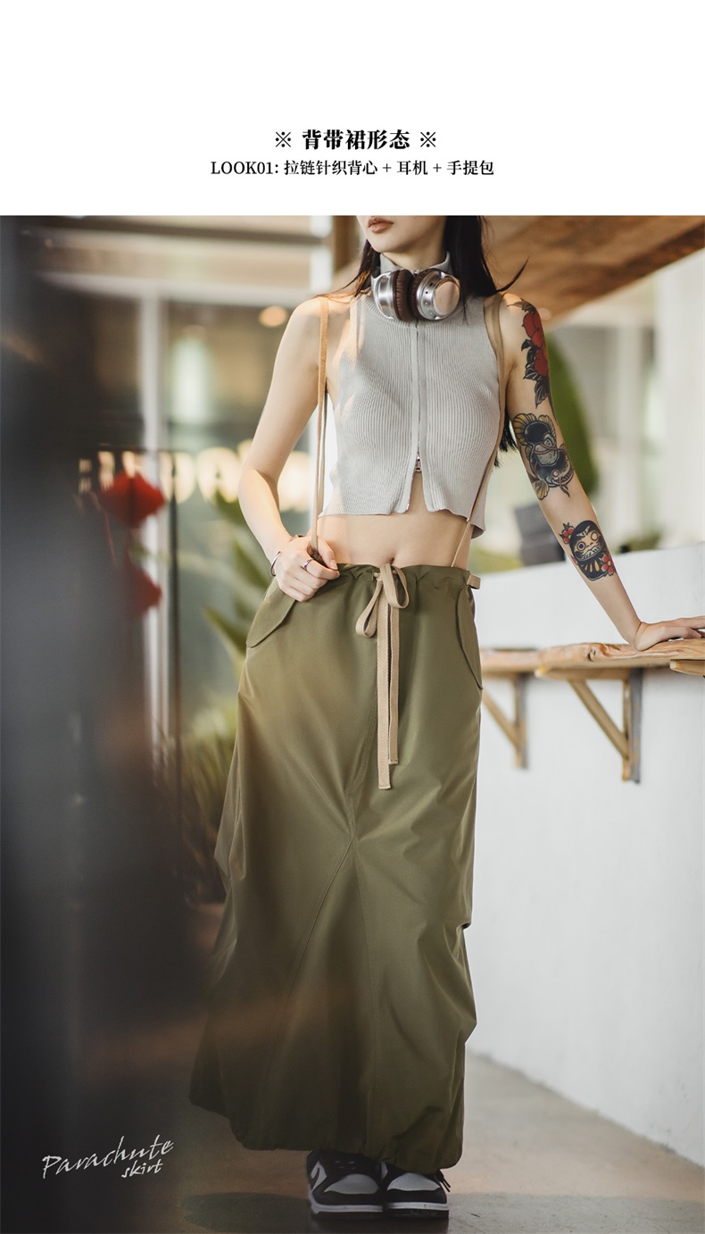 马登女装复古抽绳工装背带裙显瘦半身长裙子不规则设计感军绿伞裙