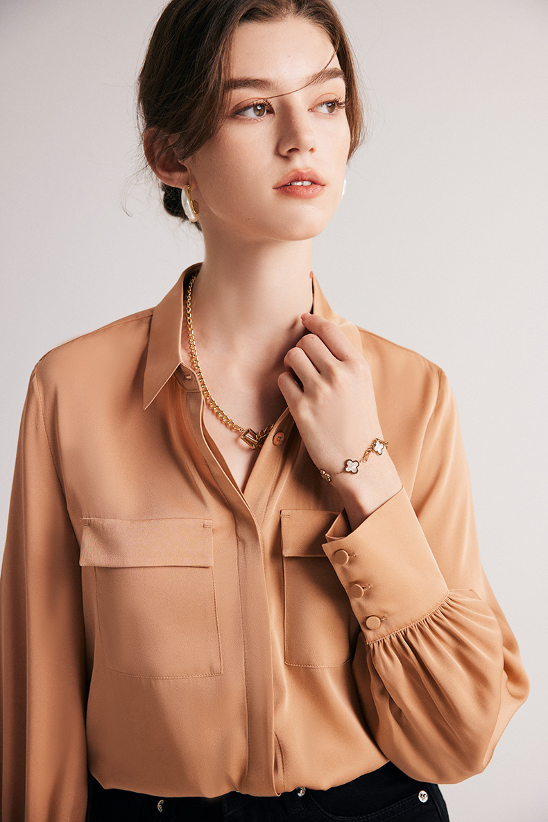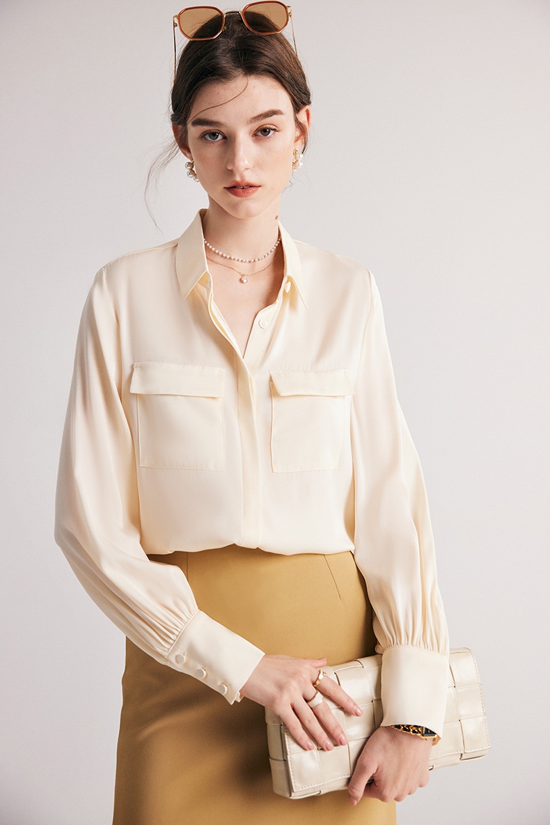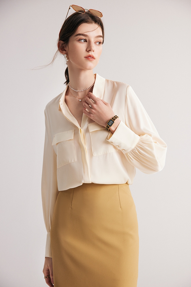 高品真丝衫,加了氨纶使得面料更有张力回弹力,不易勾丝好打理。