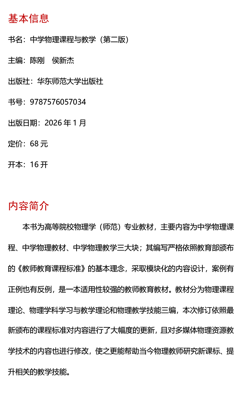 中学物理课程与教学 第二版 新标准学科教育系列教材 高等院校物理学师范专业教材