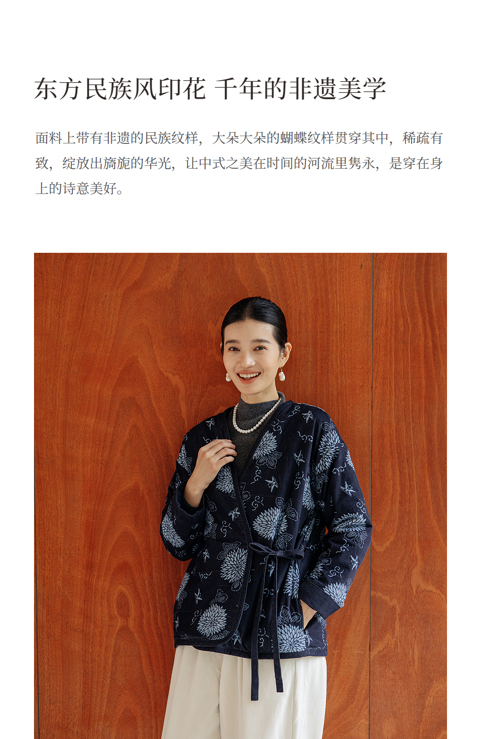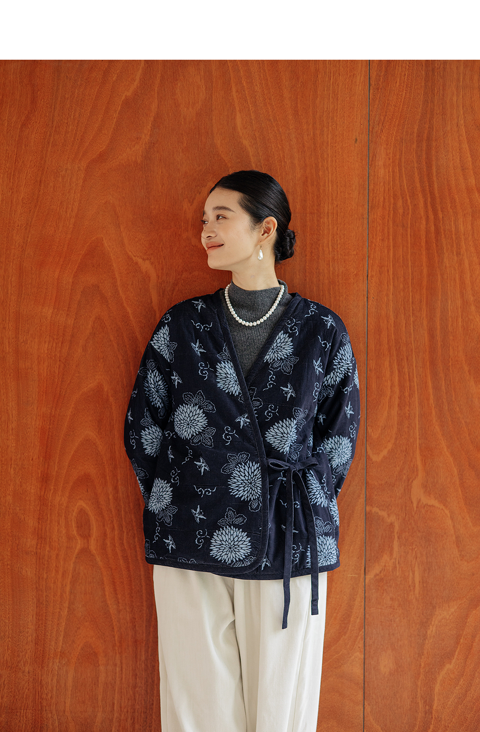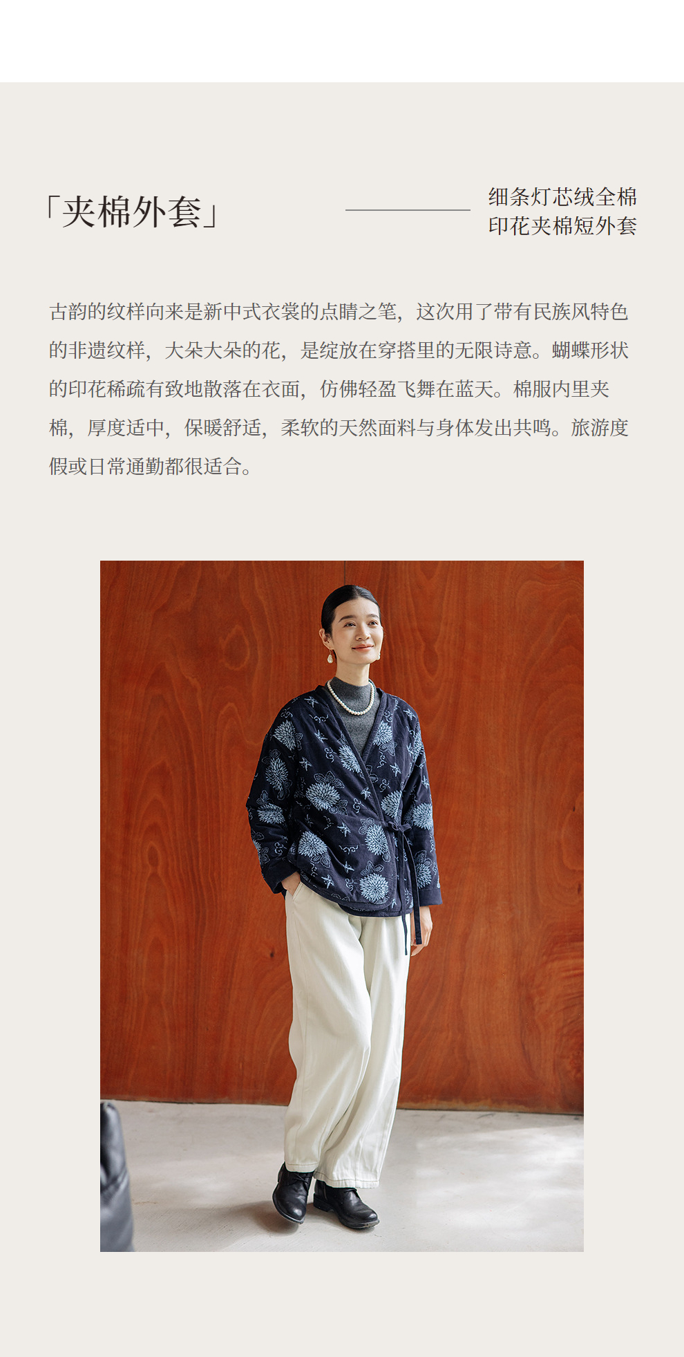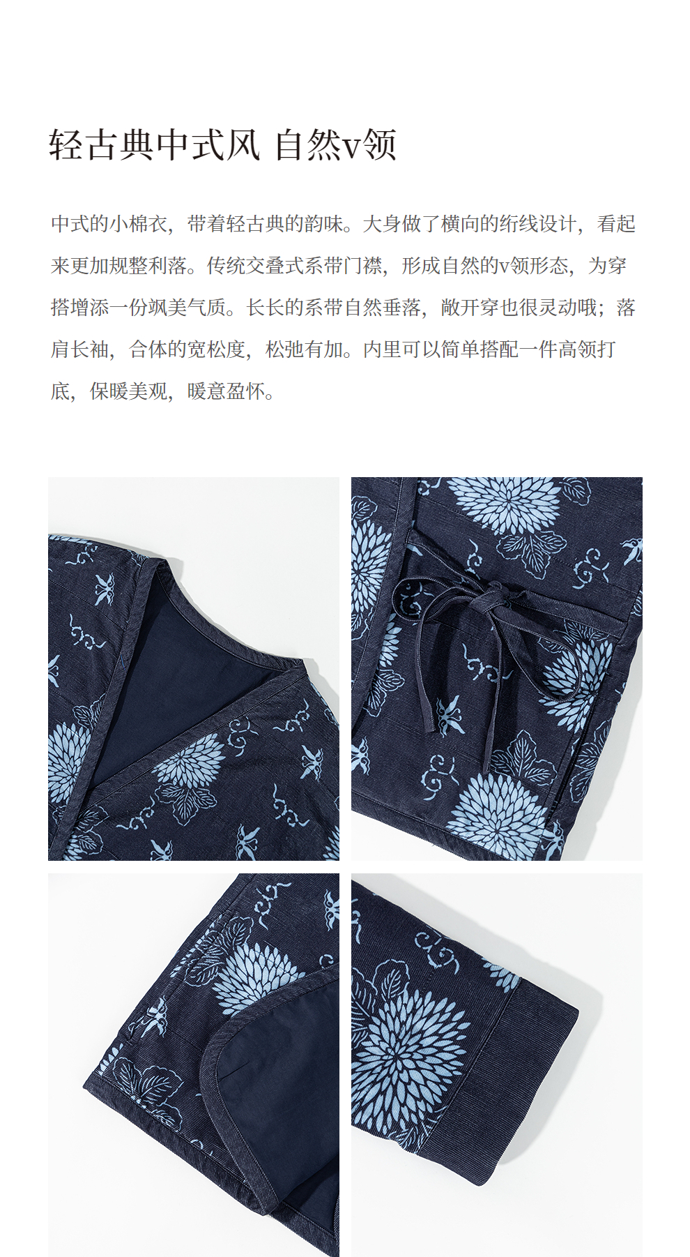 绽放850朵/轻古典中式风细条灯芯绒全棉印花v领夹棉短外套棉袄