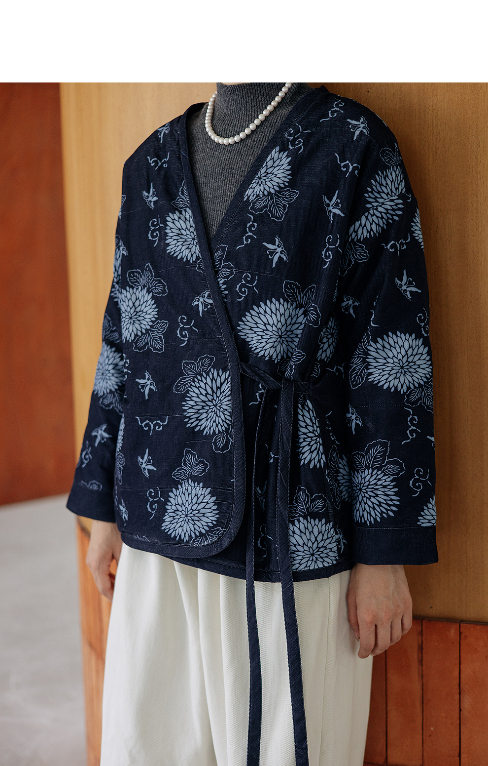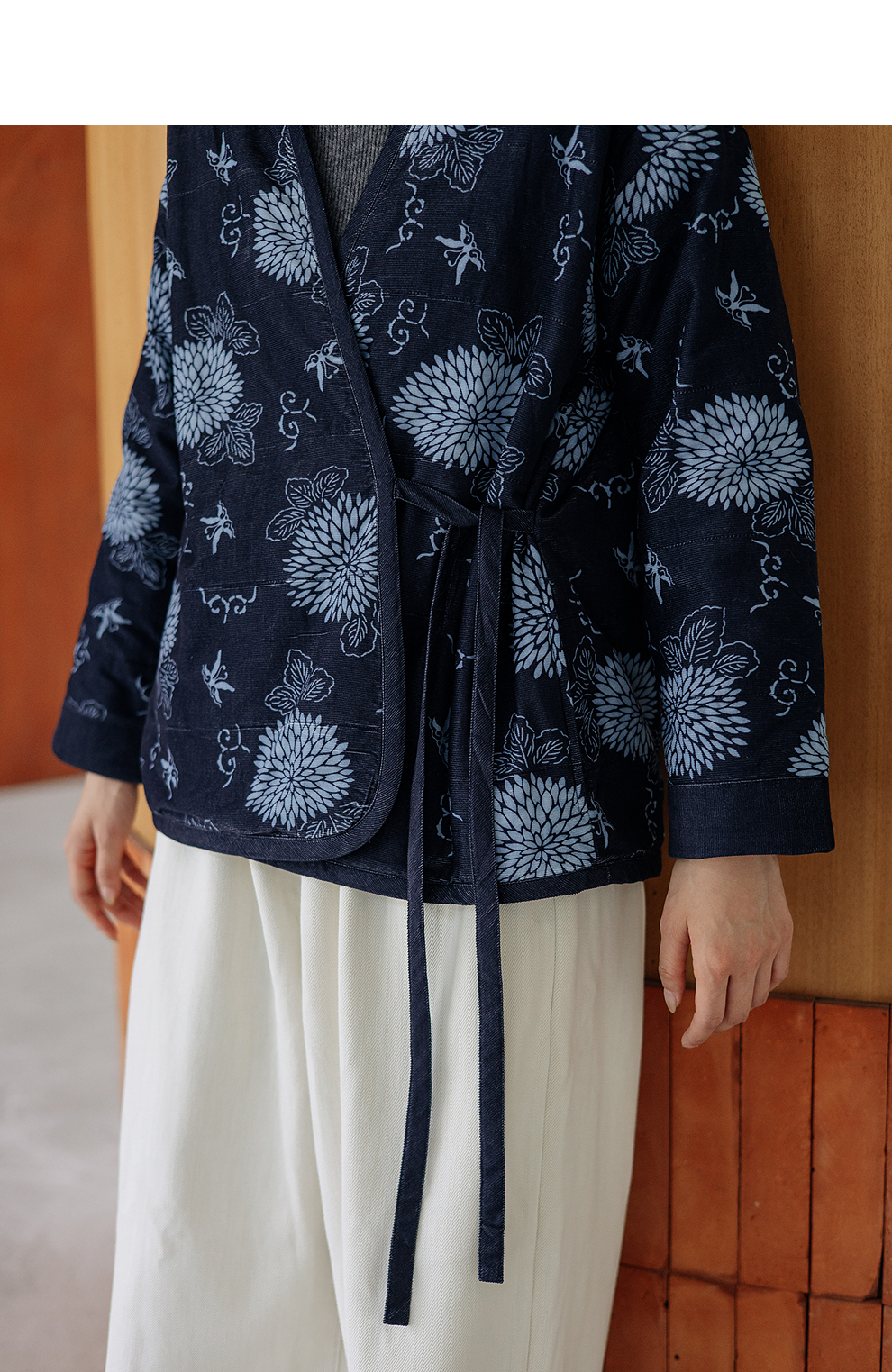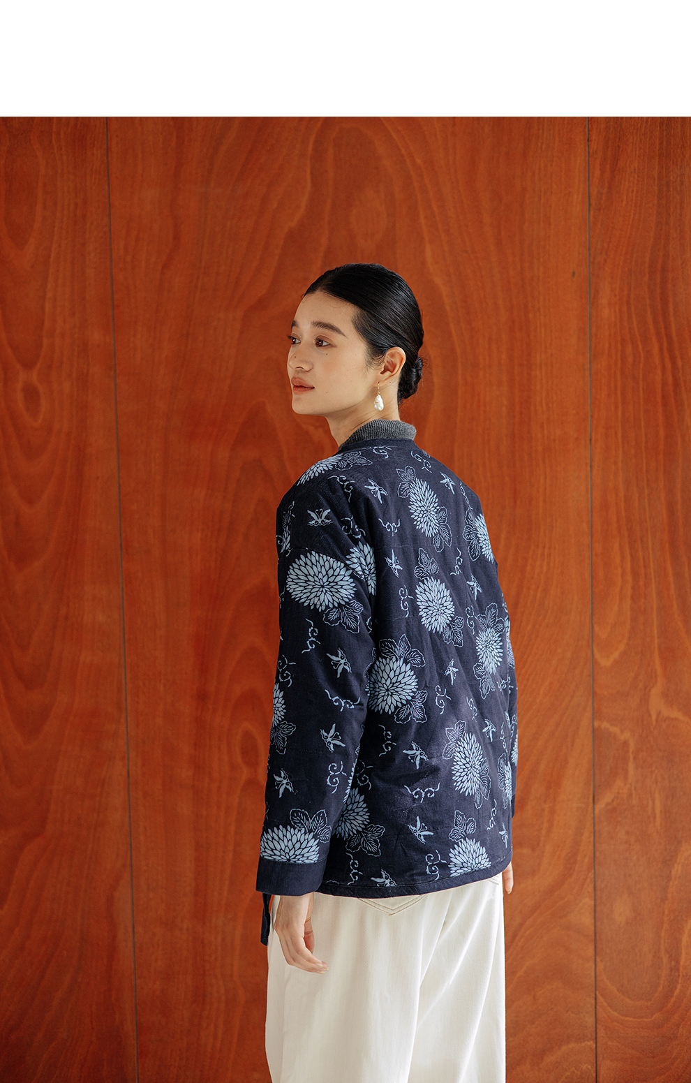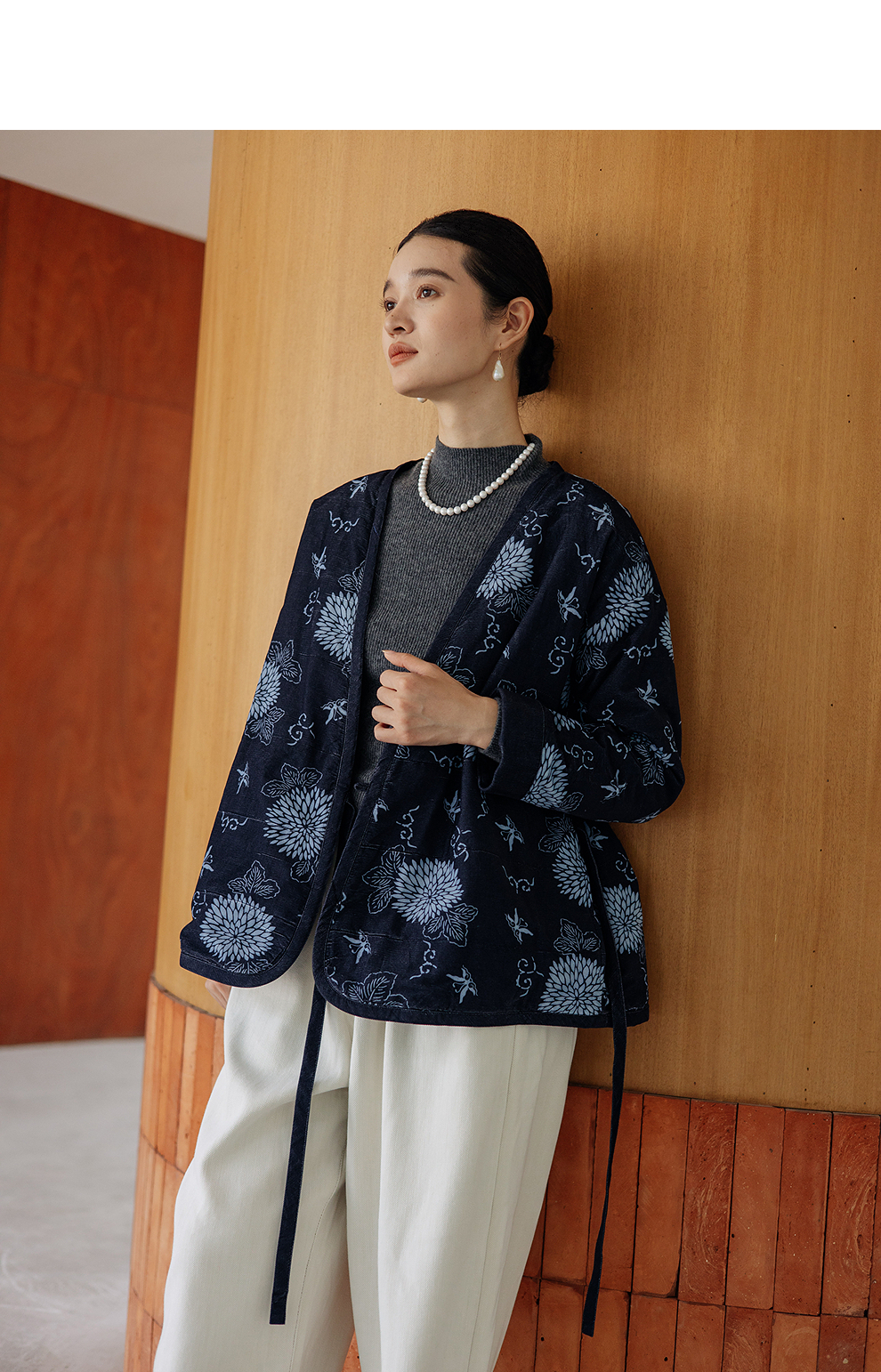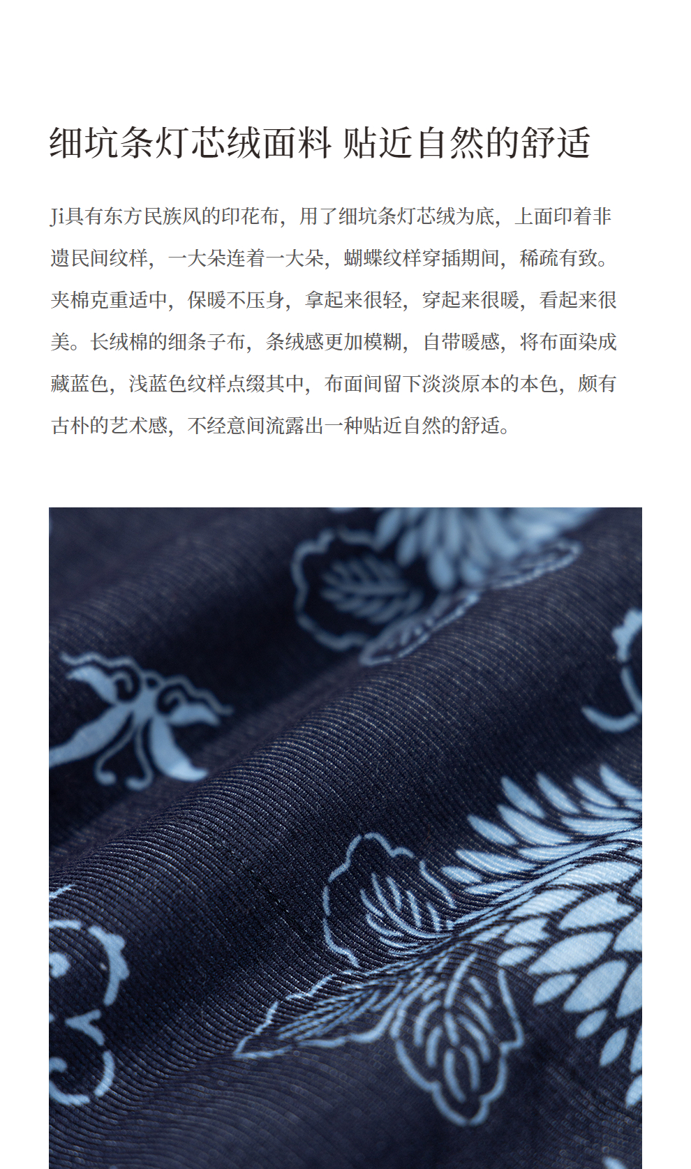 绽放850朵/轻古典中式风细条灯芯绒全棉印花v领夹棉短外套棉袄