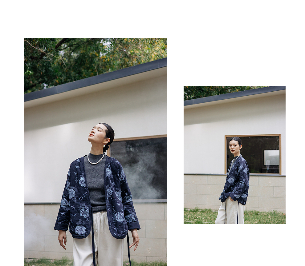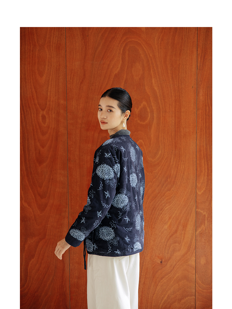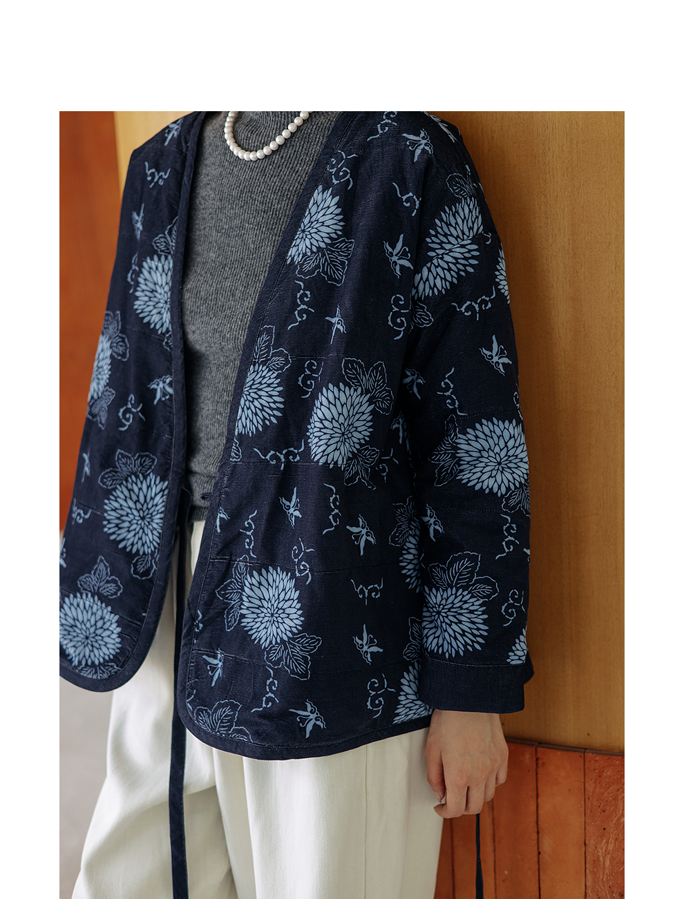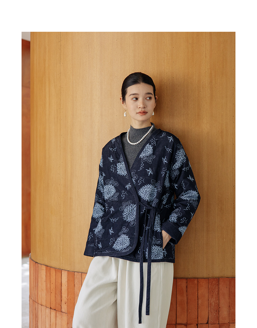 绽放850朵/轻古典中式风细条灯芯绒全棉印花v领夹棉短外套棉袄