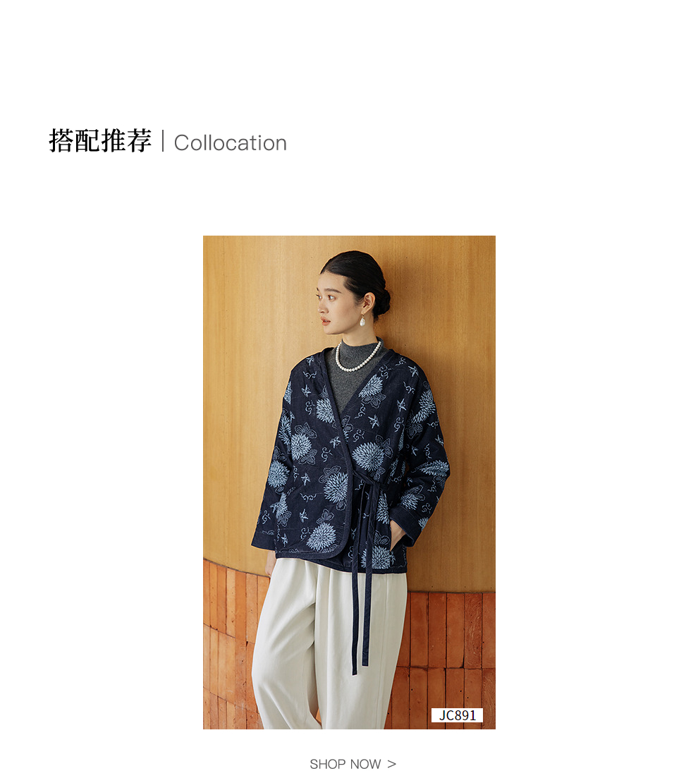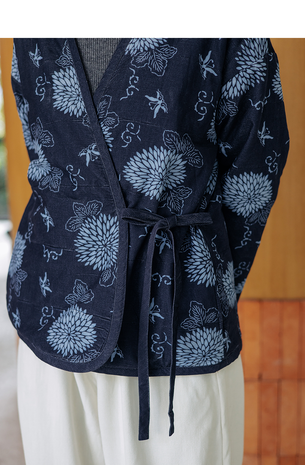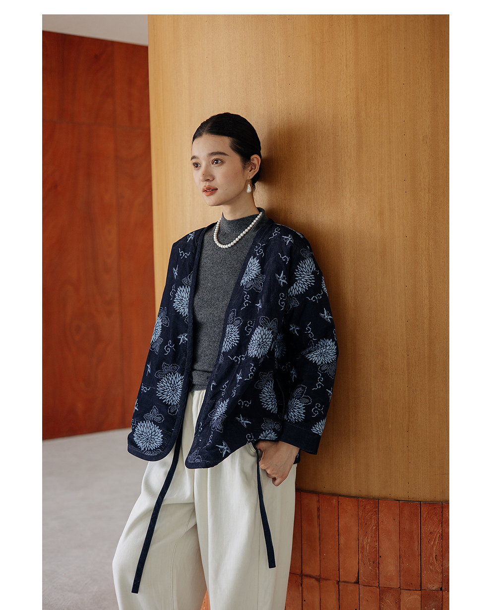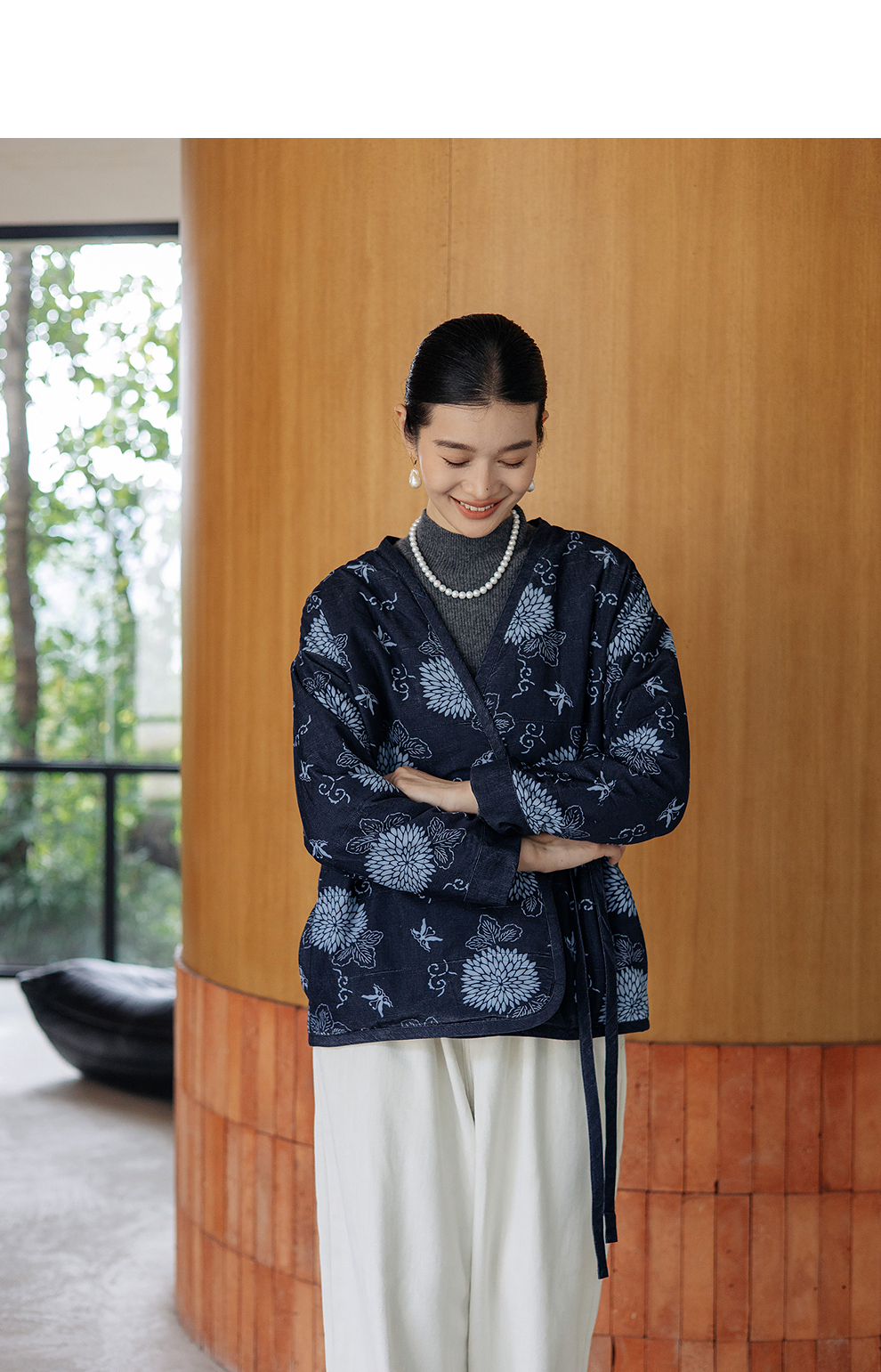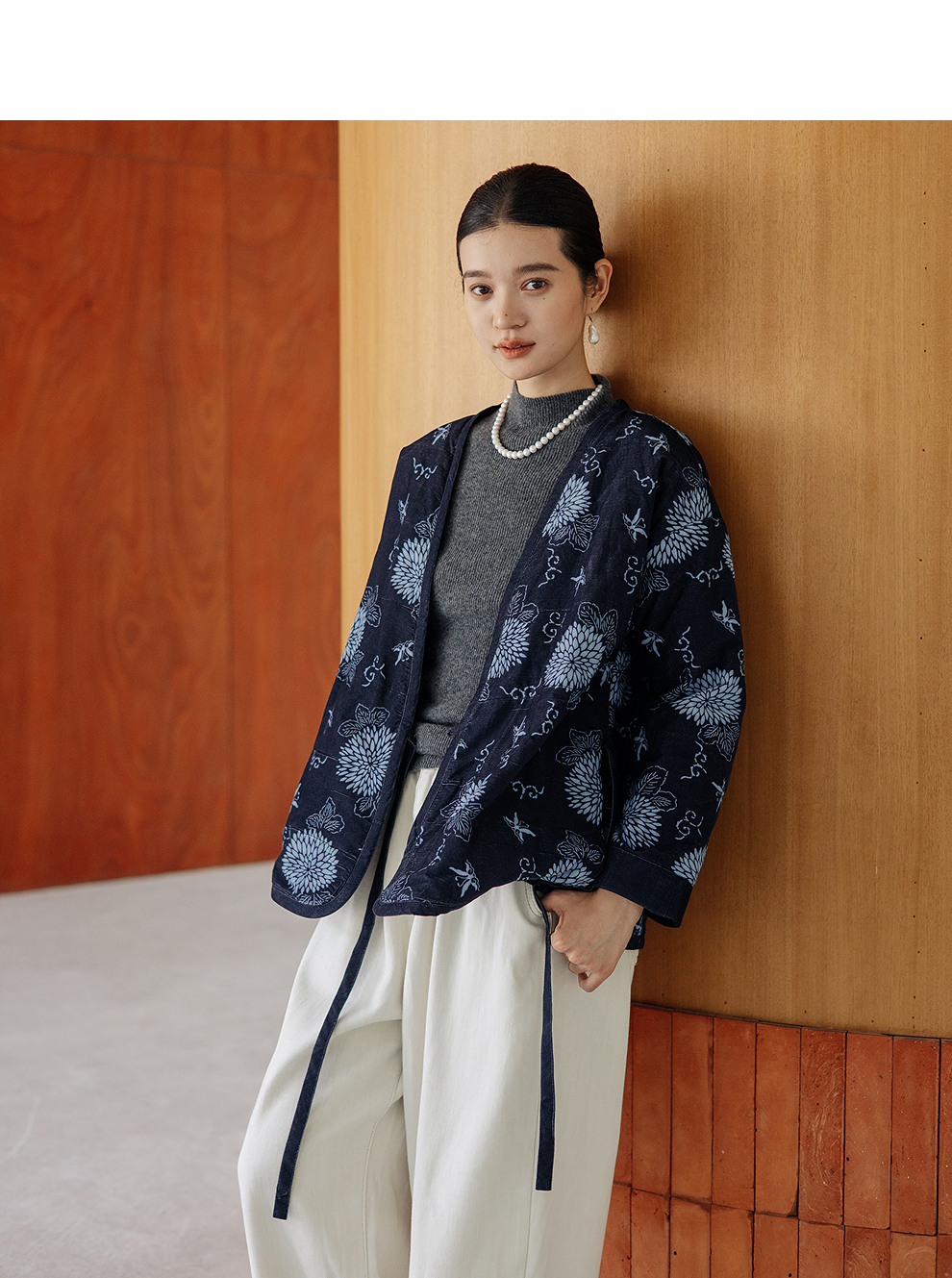 绽放850朵/轻古典中式风细条灯芯绒全棉印花v领夹棉短外套棉袄