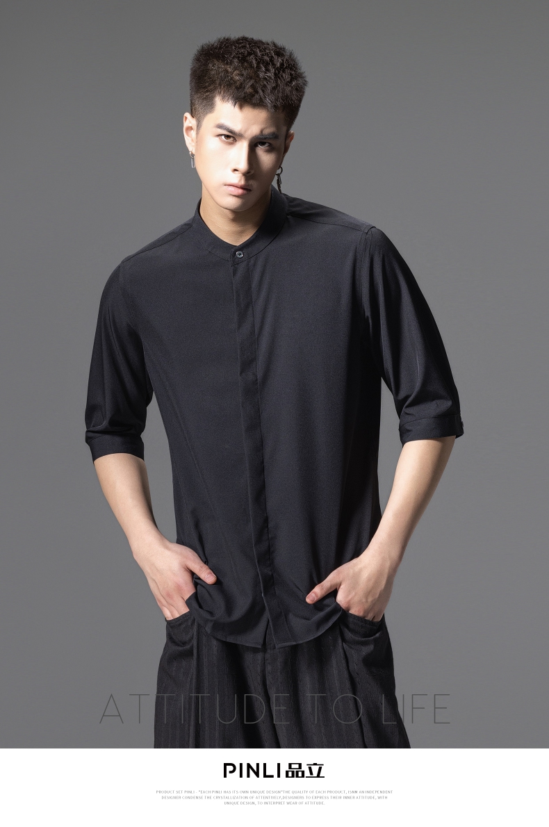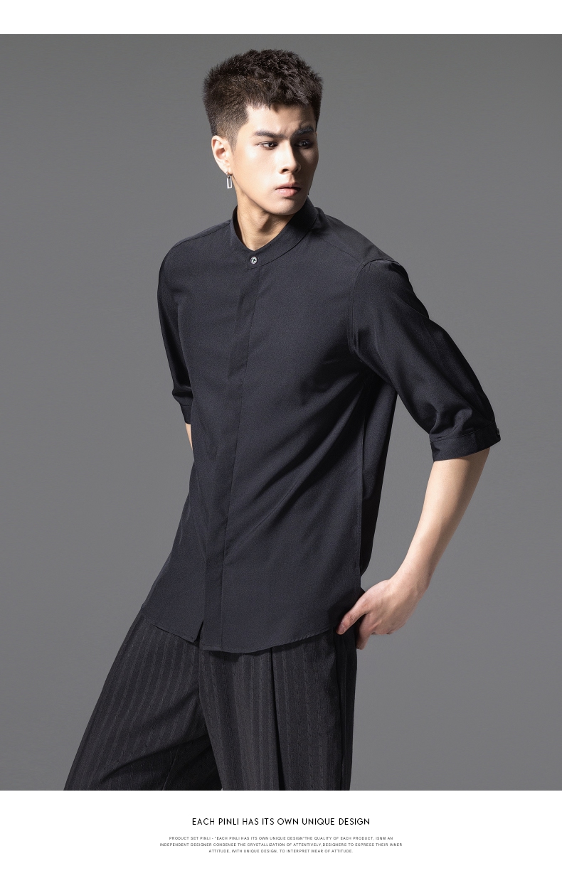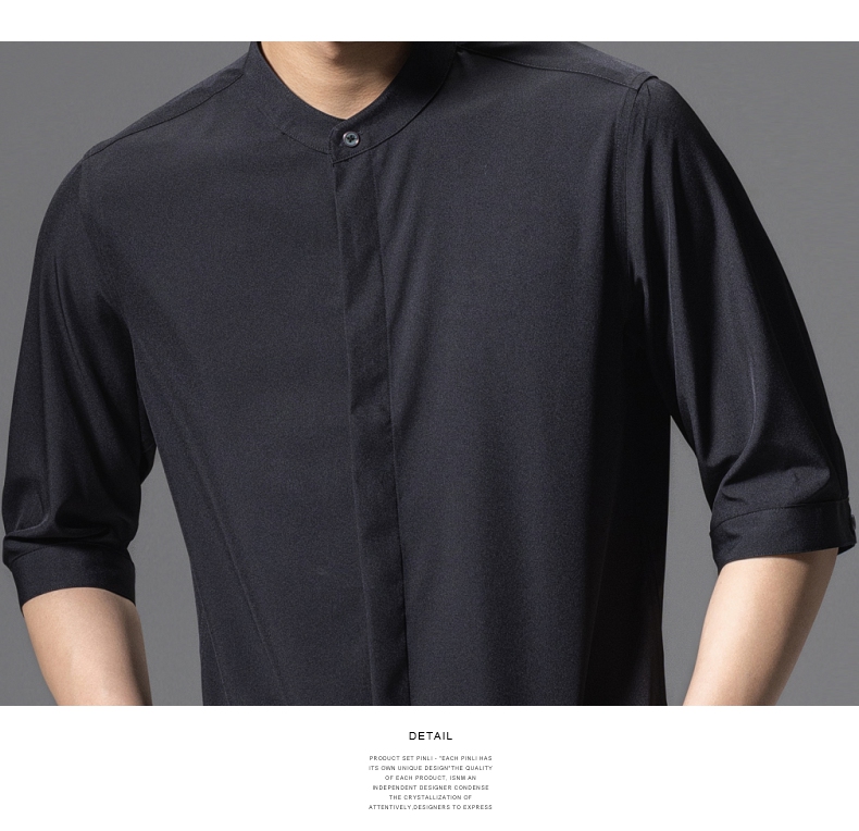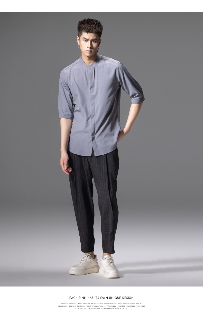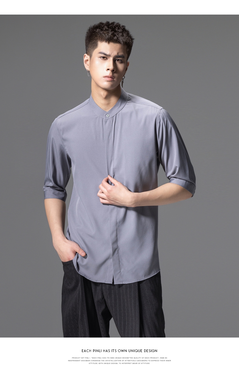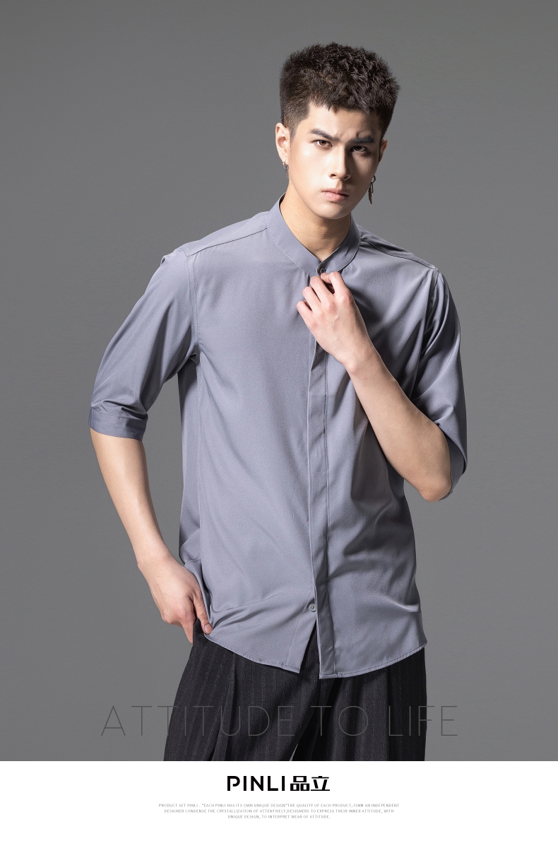 PINLI品立秋季新款纯色立领中袖衬衫男士免烫休闲五分袖衬衣GD242213296
