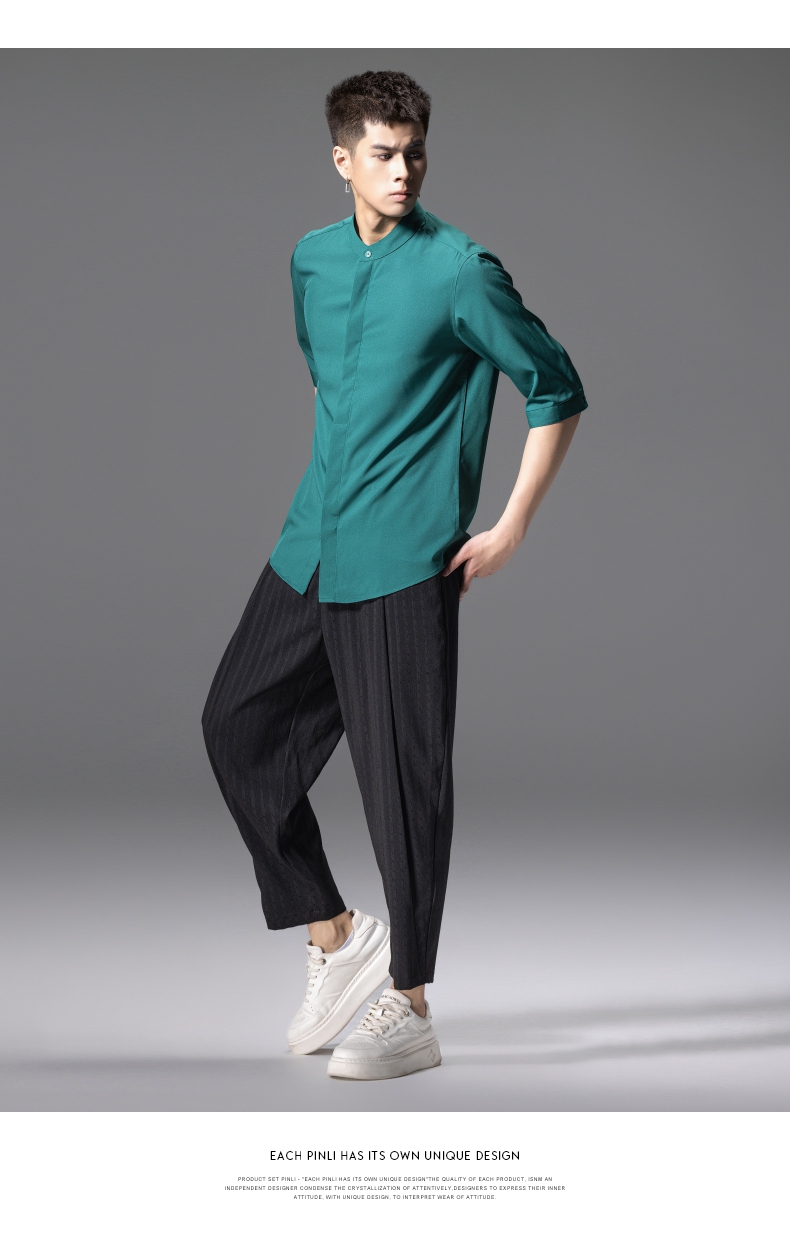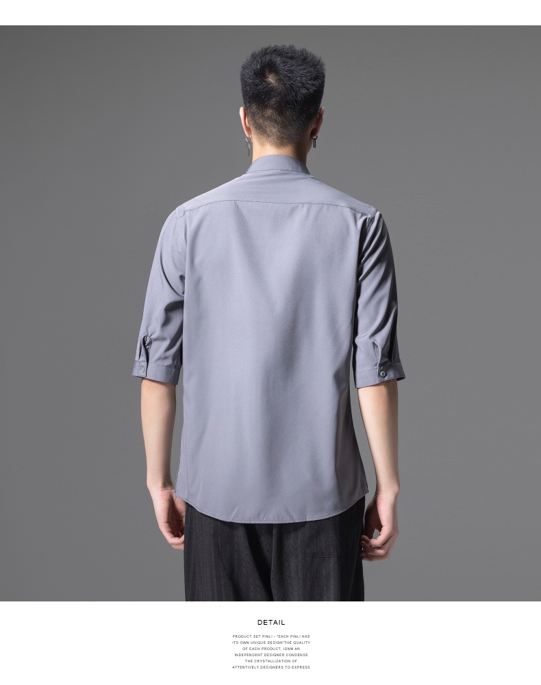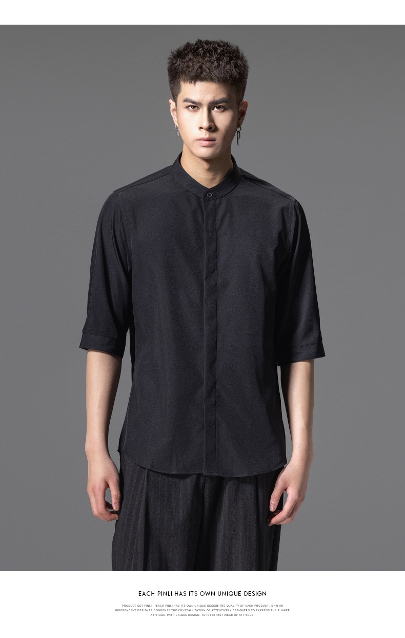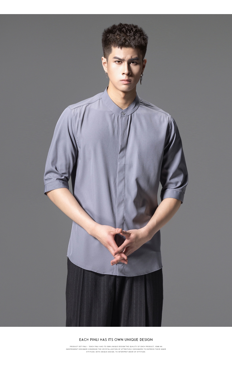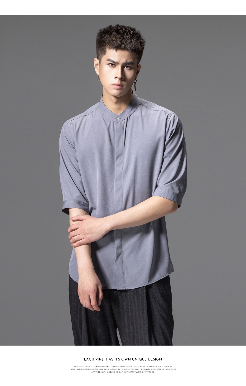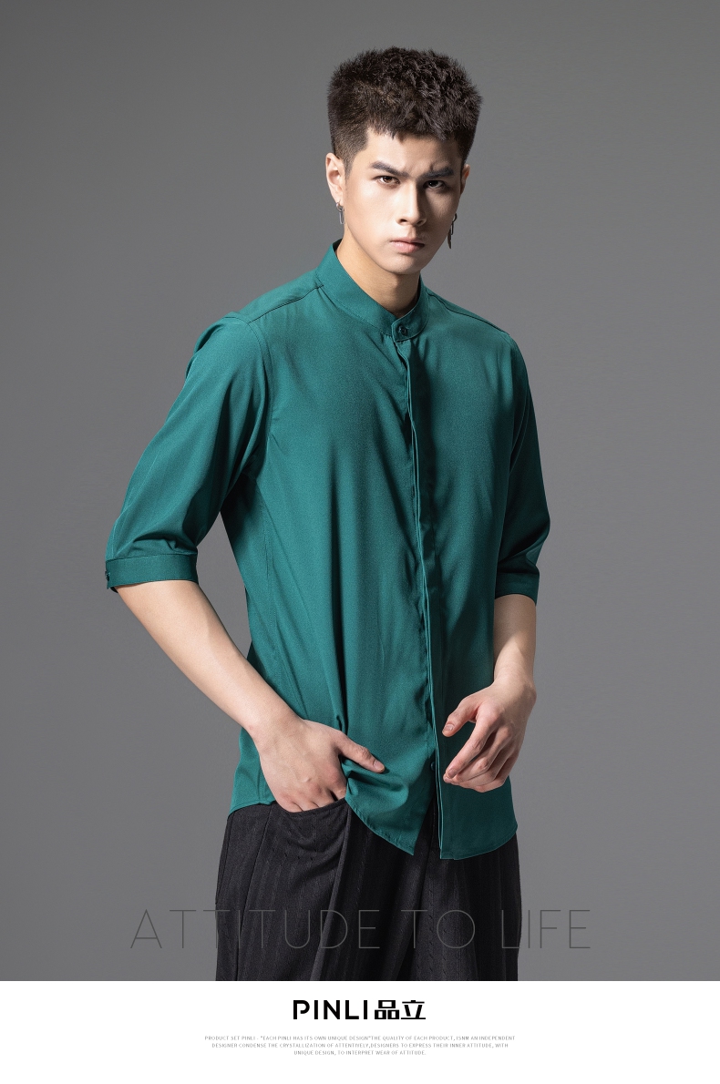 PINLI品立秋季新款纯色立领中袖衬衫男士免烫休闲五分袖衬衣GD242213296