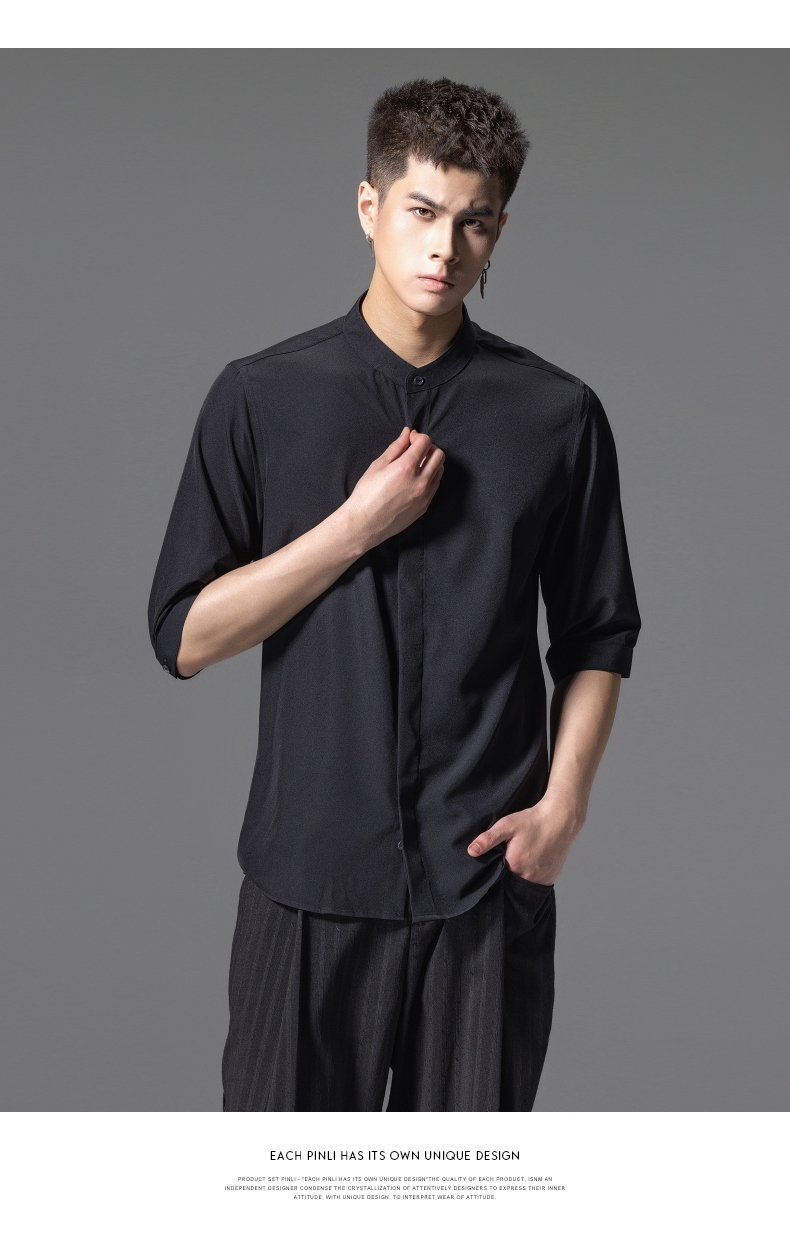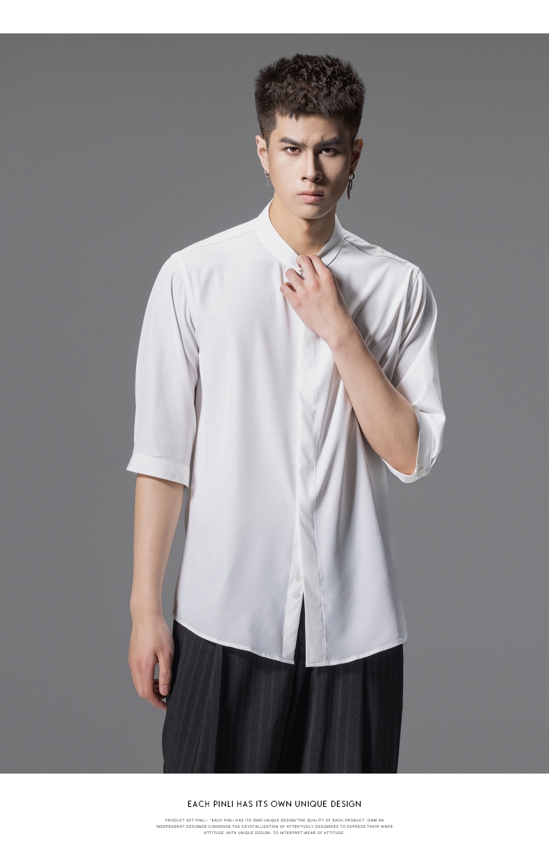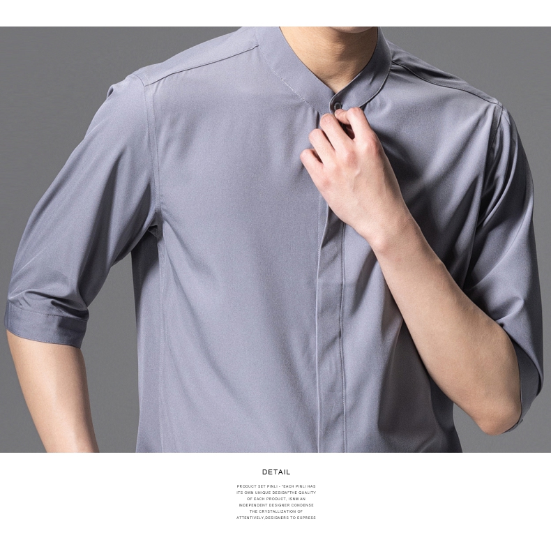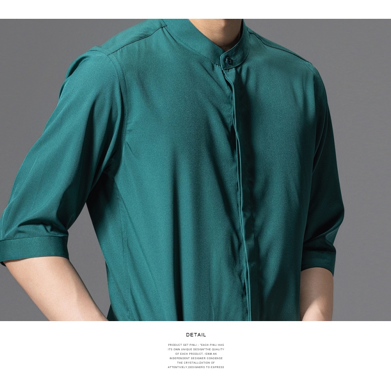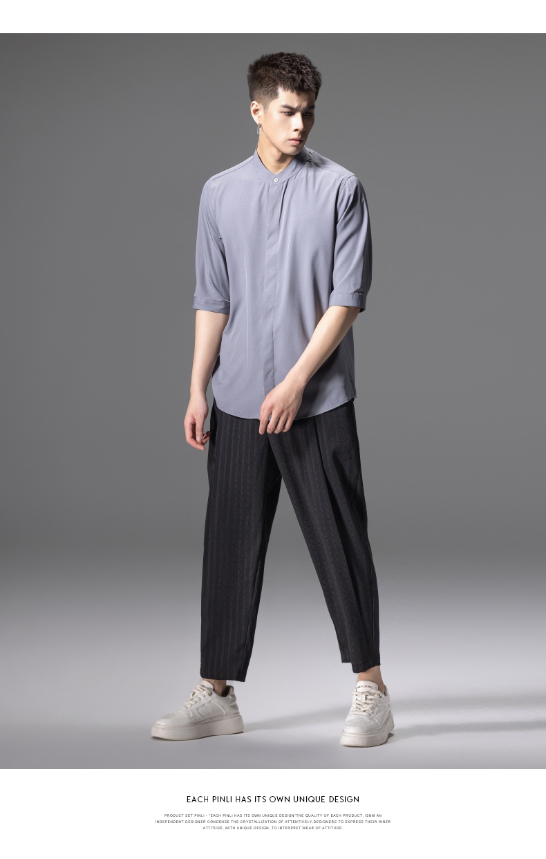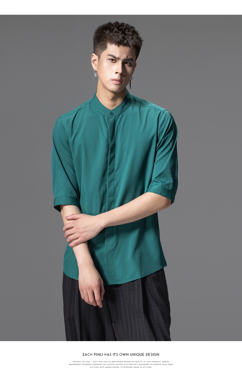 PINLI品立秋季新款纯色立领中袖衬衫男士免烫休闲五分袖衬衣GD242213296