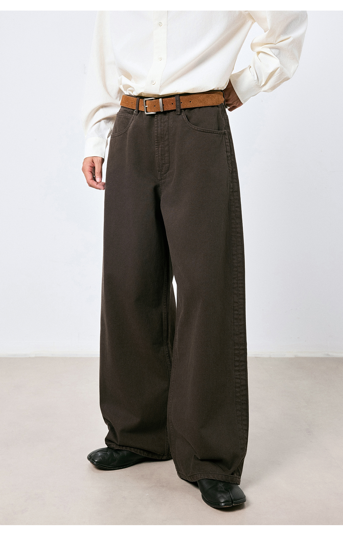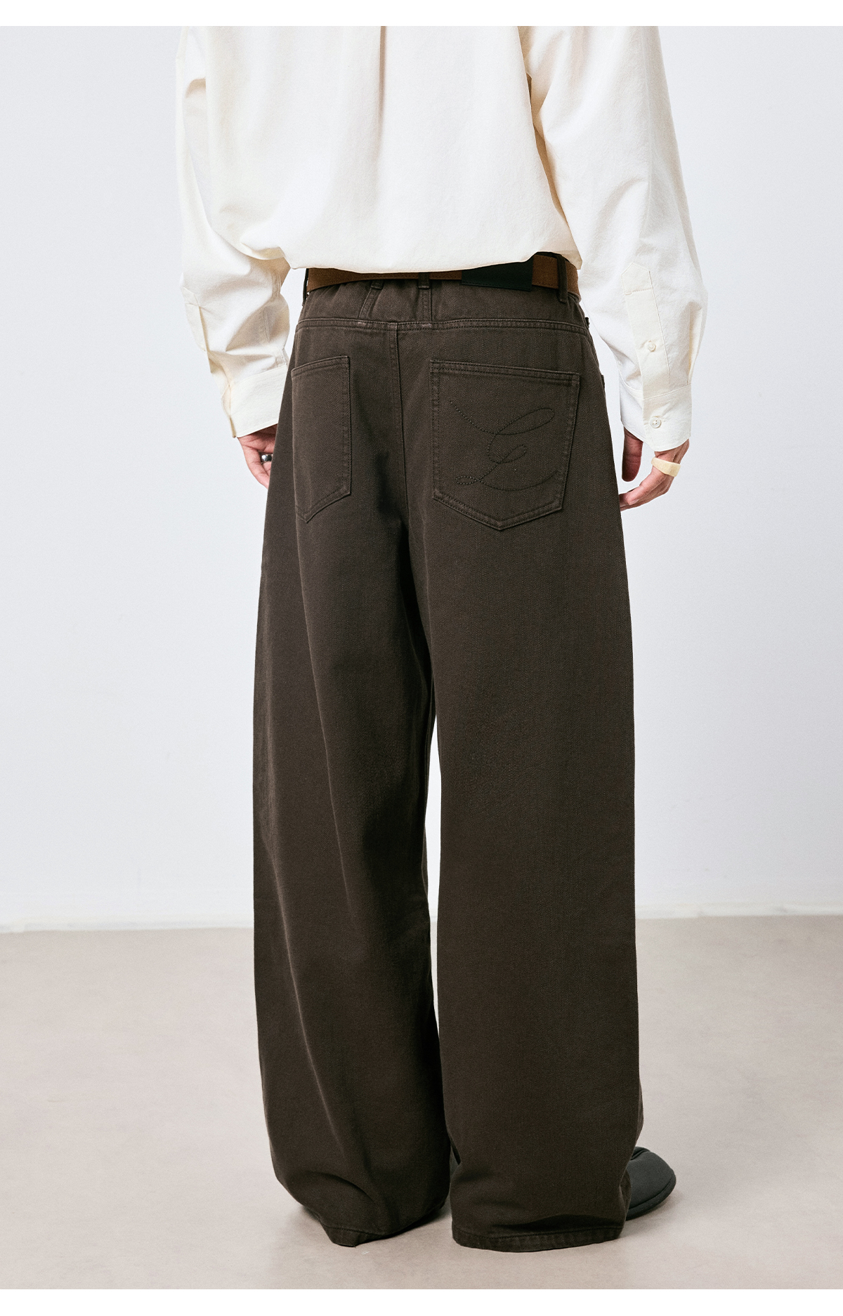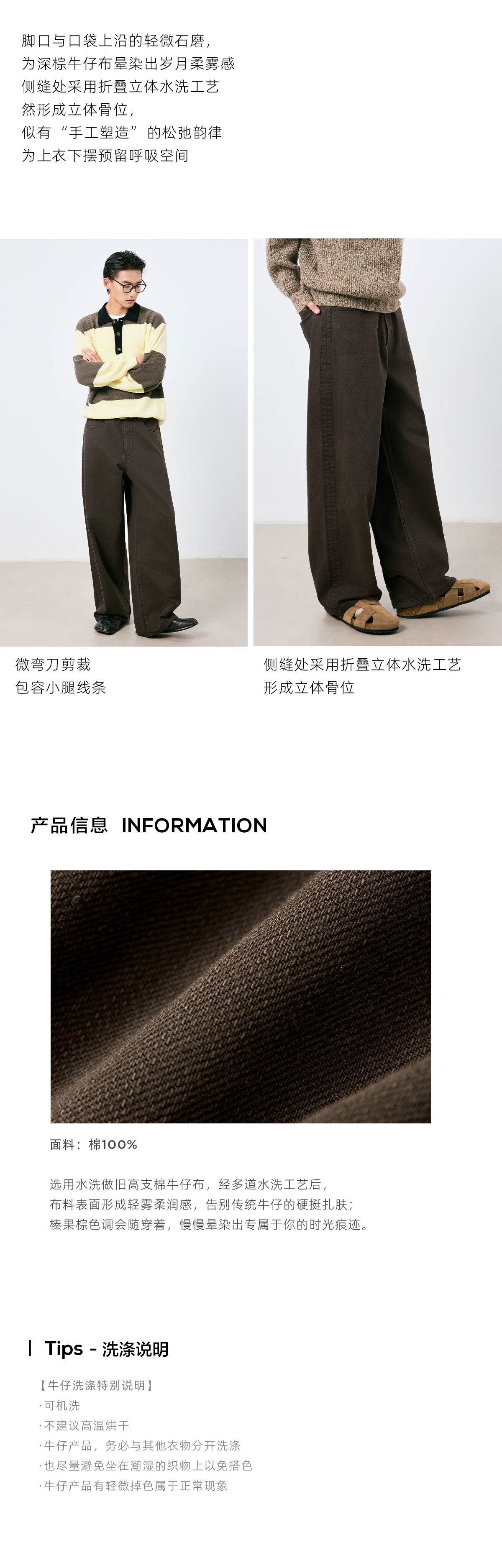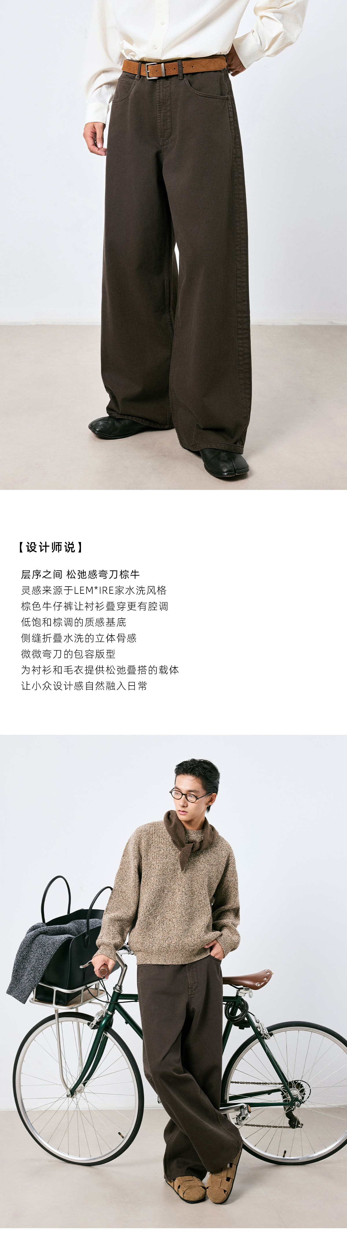 棉仓3661019001-【层序之间】复古棕色水洗宽松牛仔裤阔腿微弯刀版型