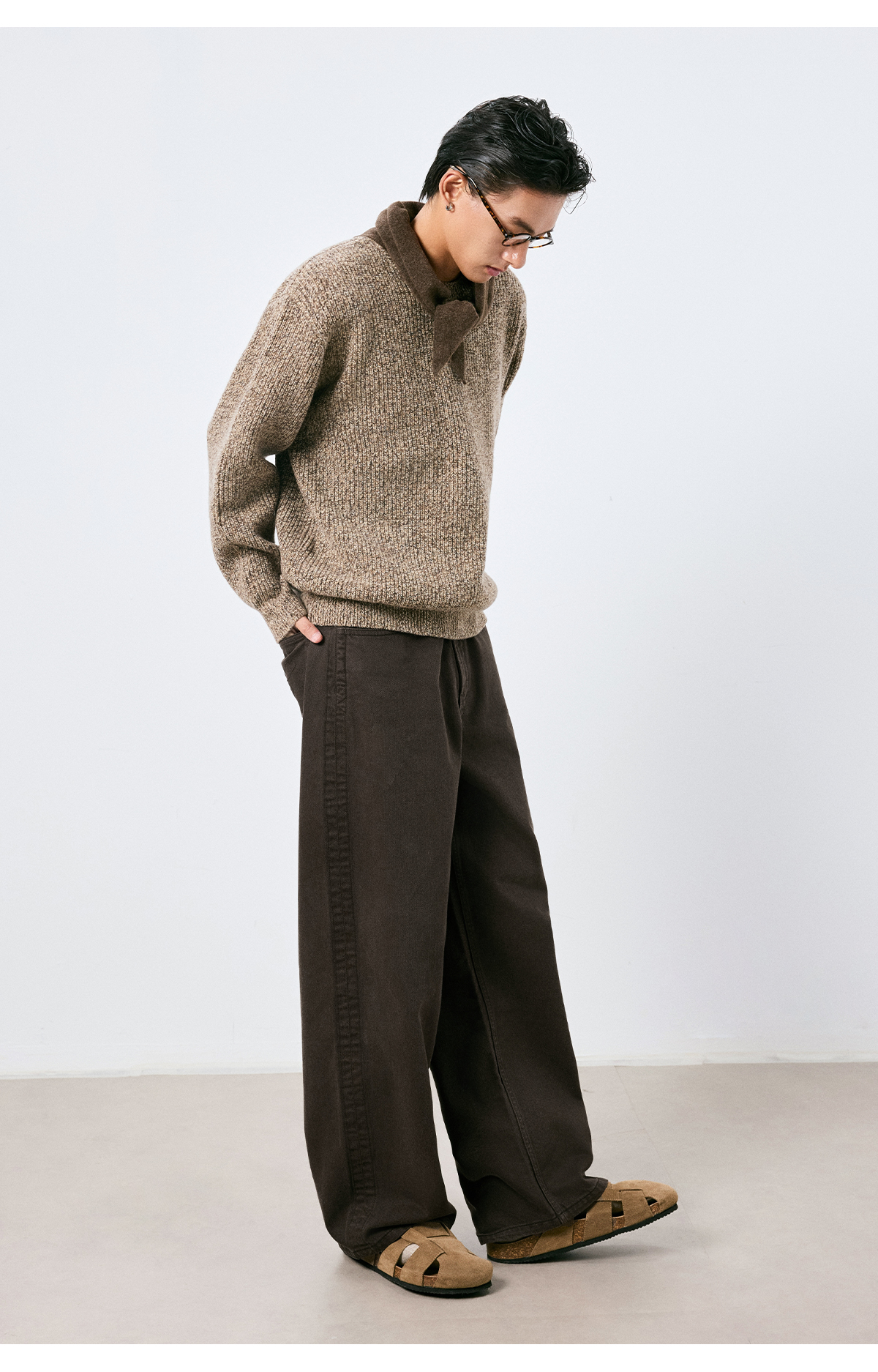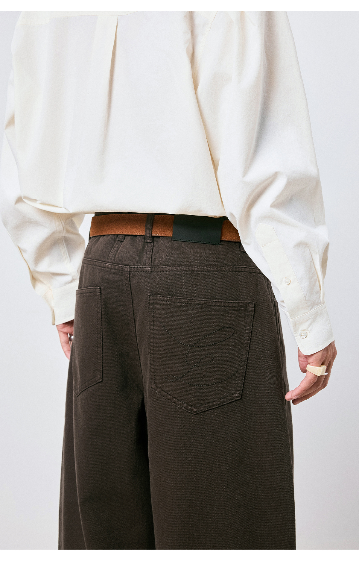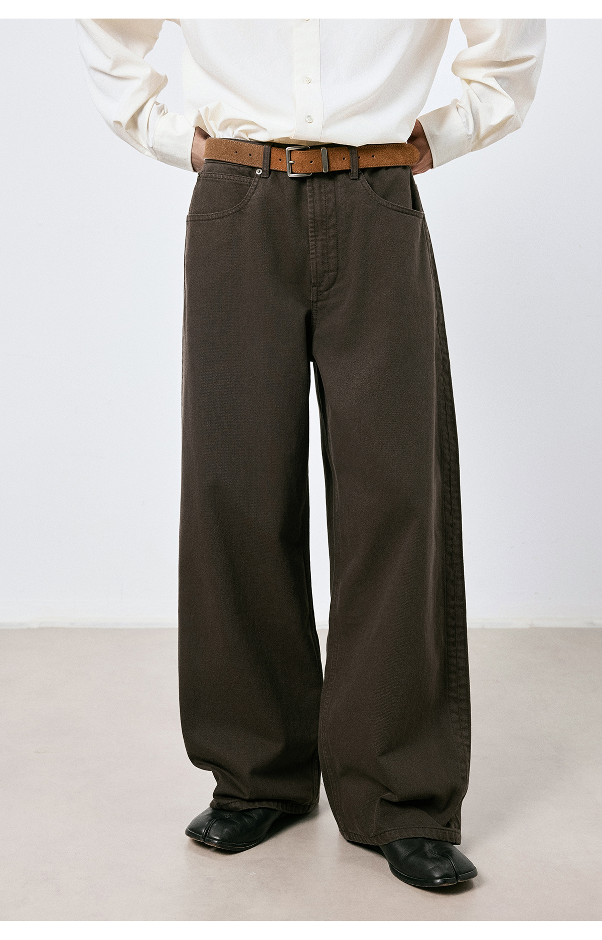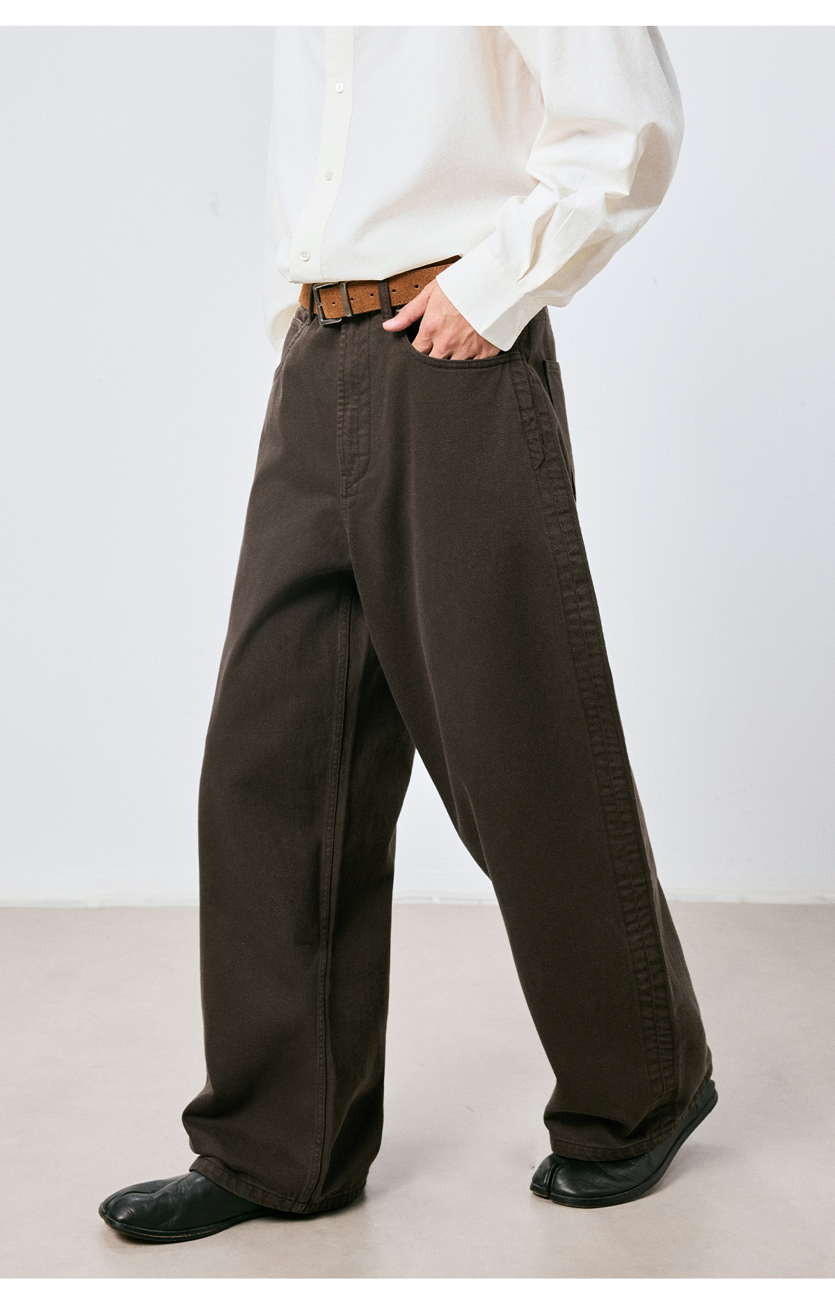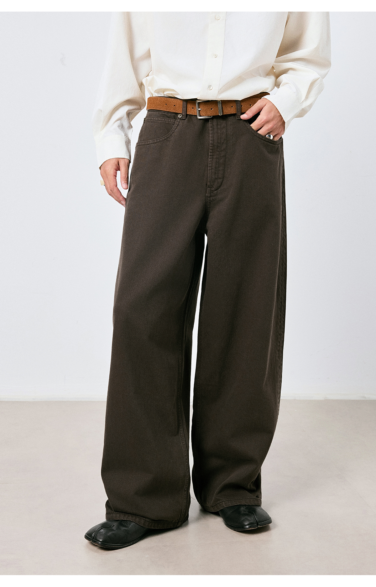 棉仓3661019001-【层序之间】复古棕色水洗宽松牛仔裤阔腿微弯刀版型