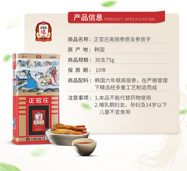 75g正官庄牌高丽红参(良参30支) 健康生活 温和滋补