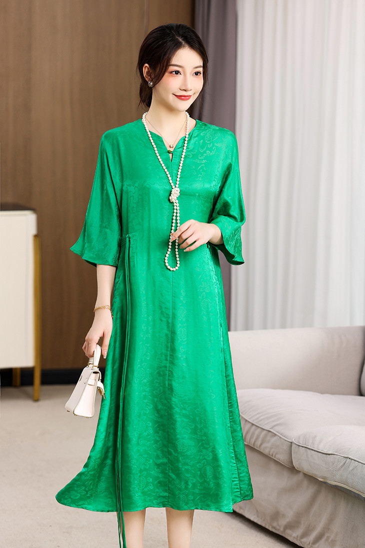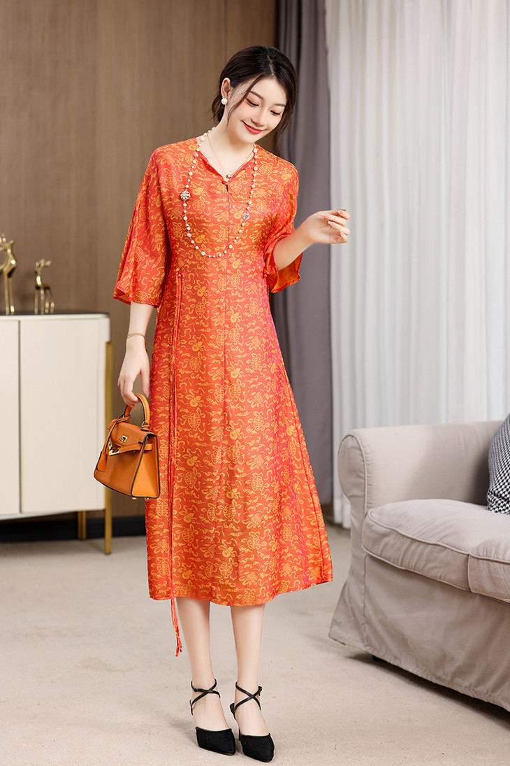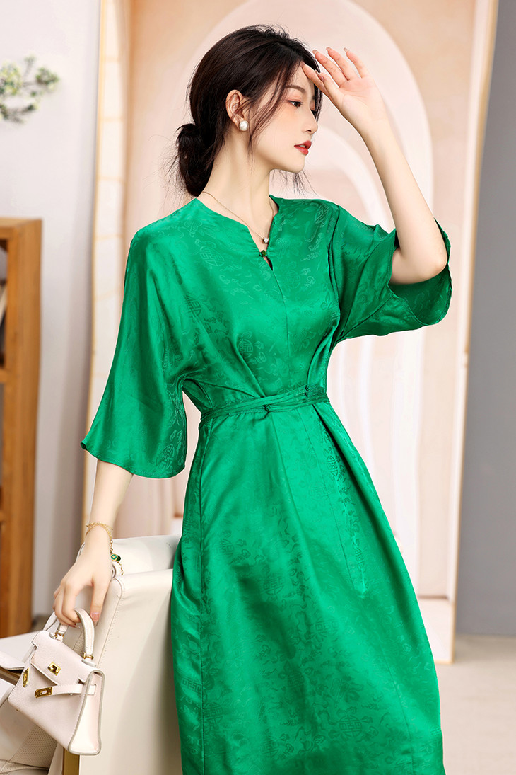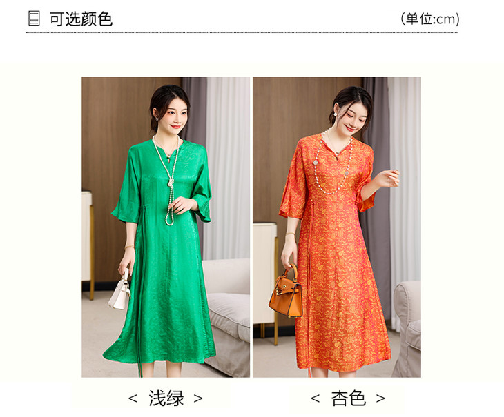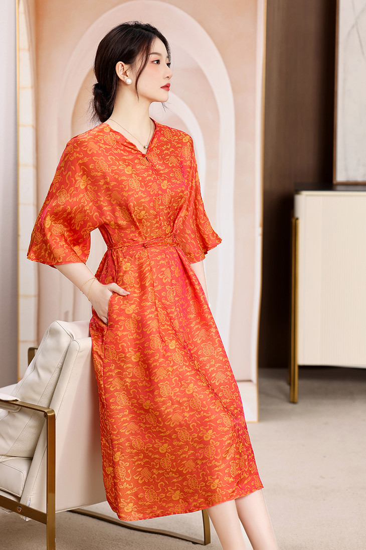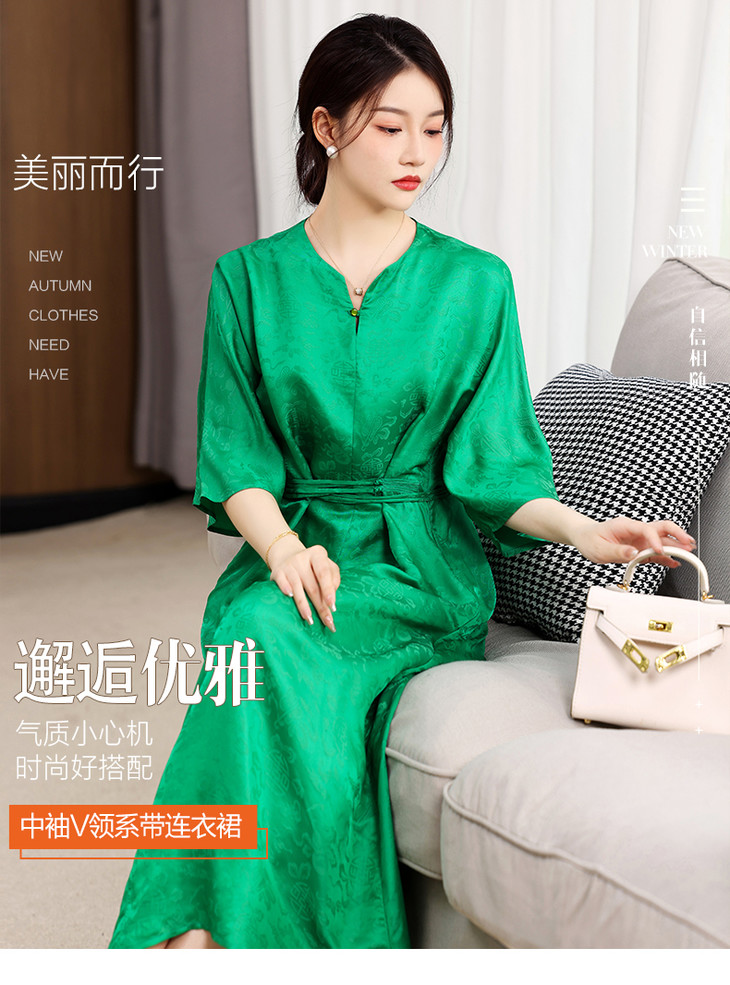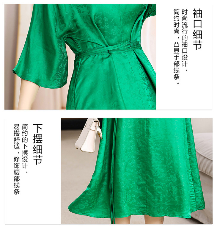 LX22033 2022夏季新款时尚新中式中袖V领系带葫芦(福禄)真丝提花连衣裙