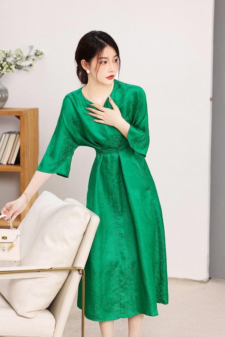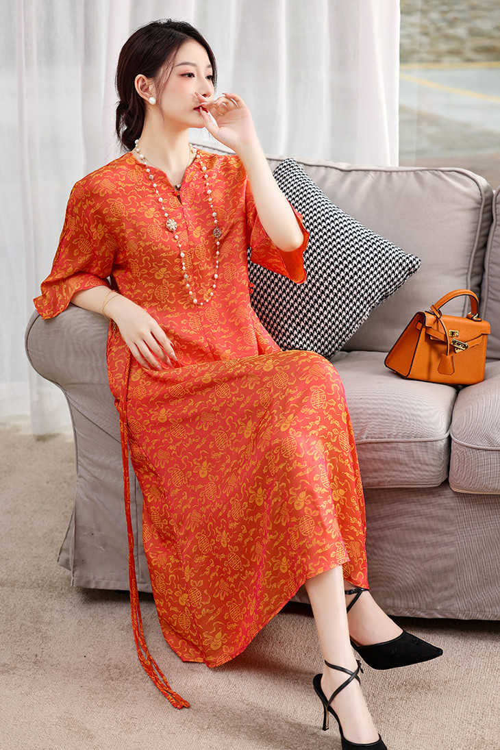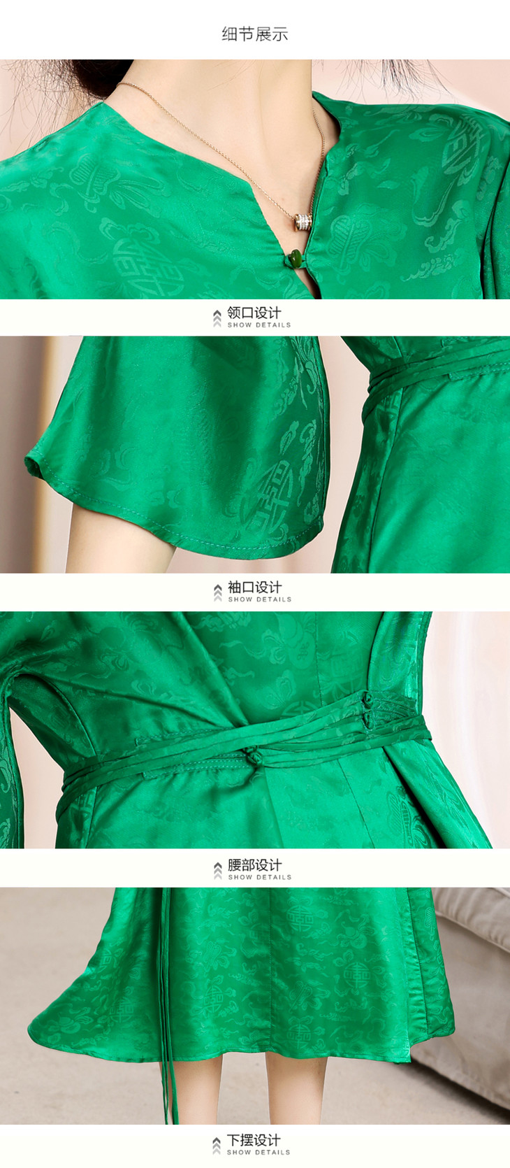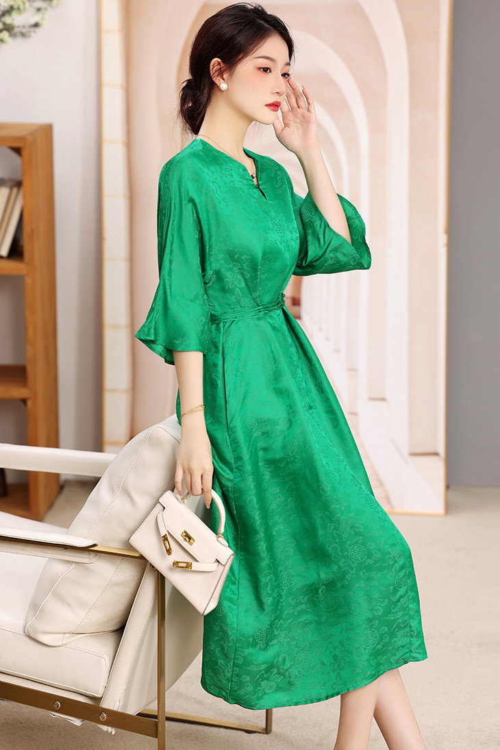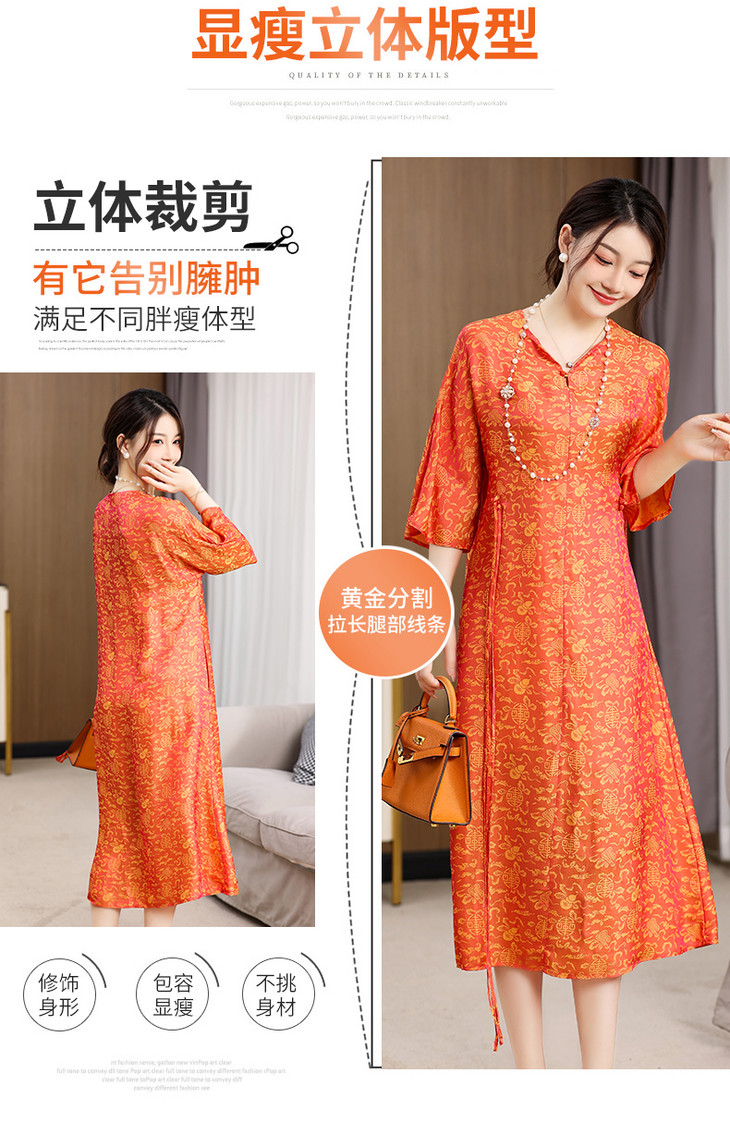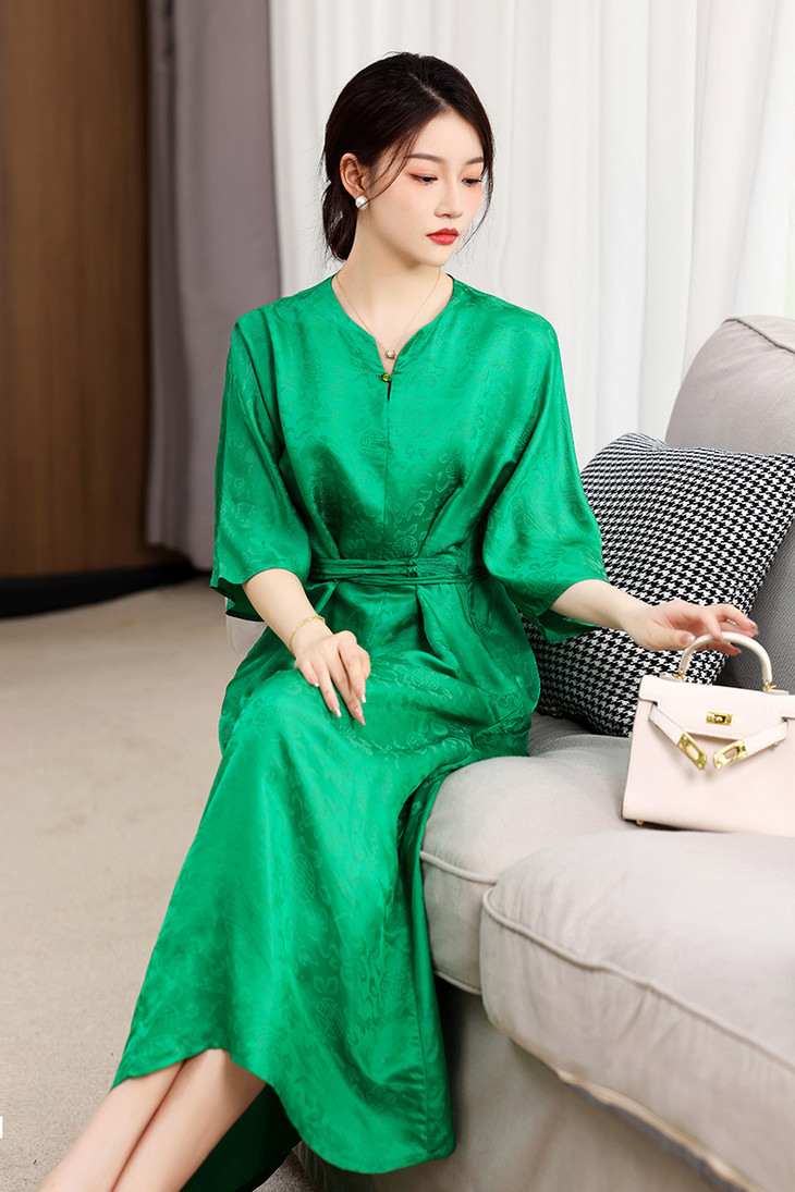 LX22033 2022夏季新款时尚新中式中袖V领系带葫芦(福禄)真丝提花连衣裙