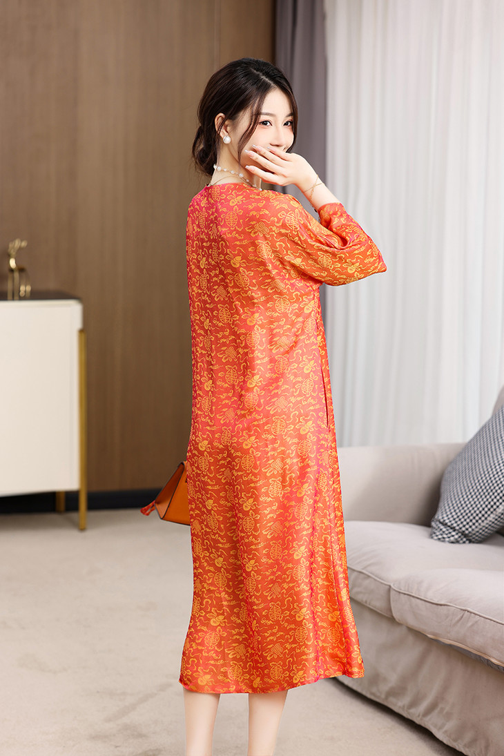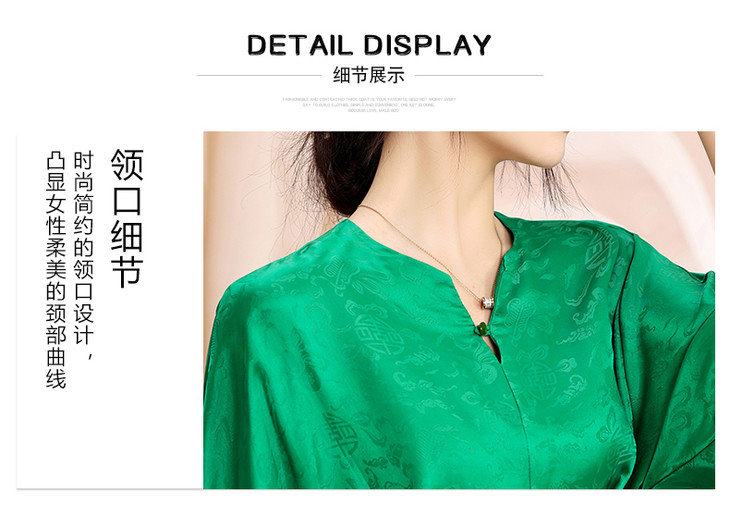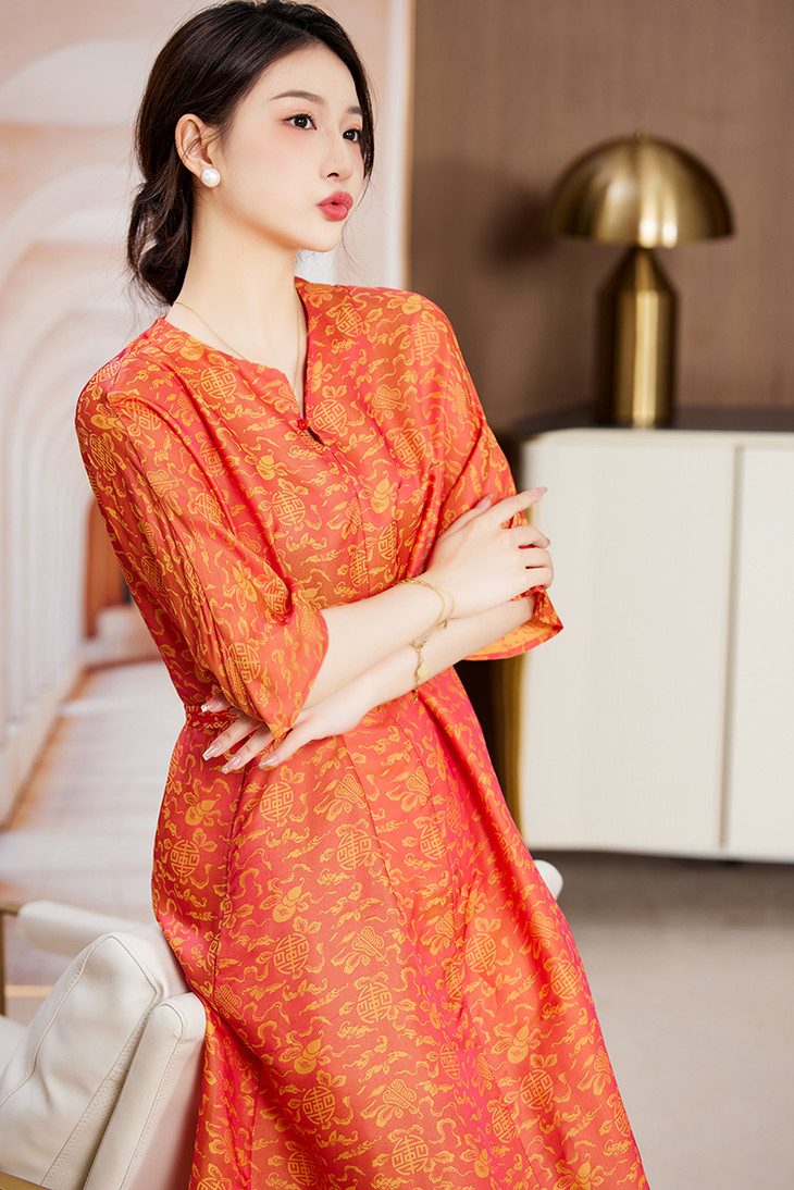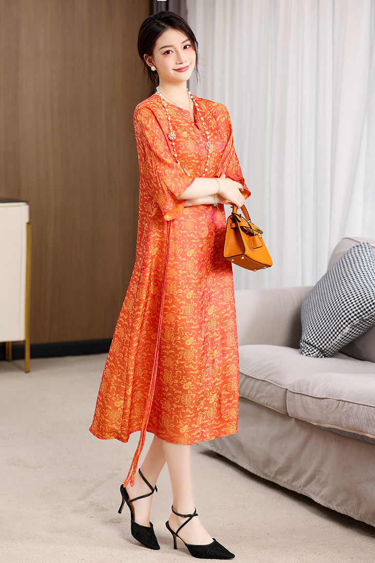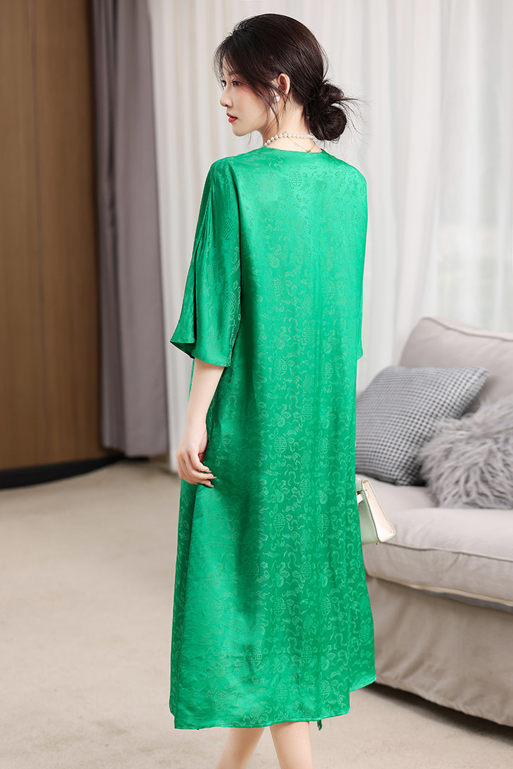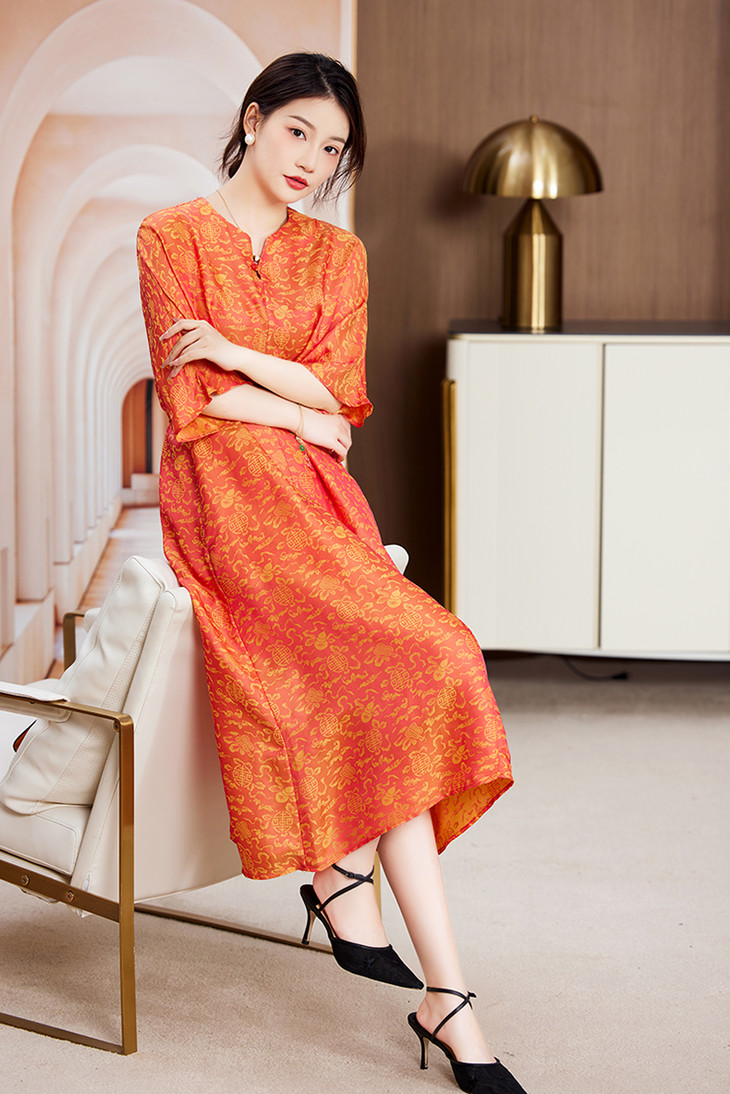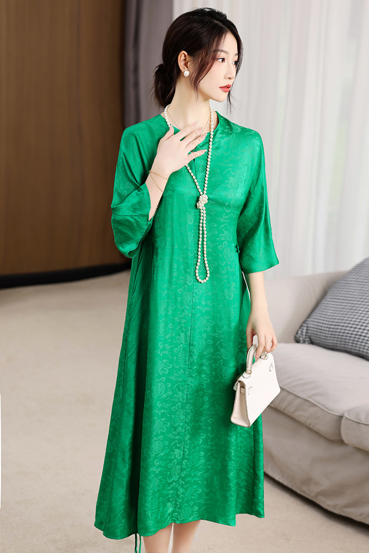 LX22033 2022夏季新款时尚新中式中袖V领系带葫芦(福禄)真丝提花连衣裙