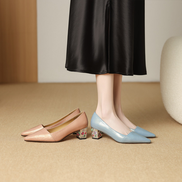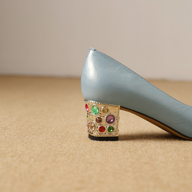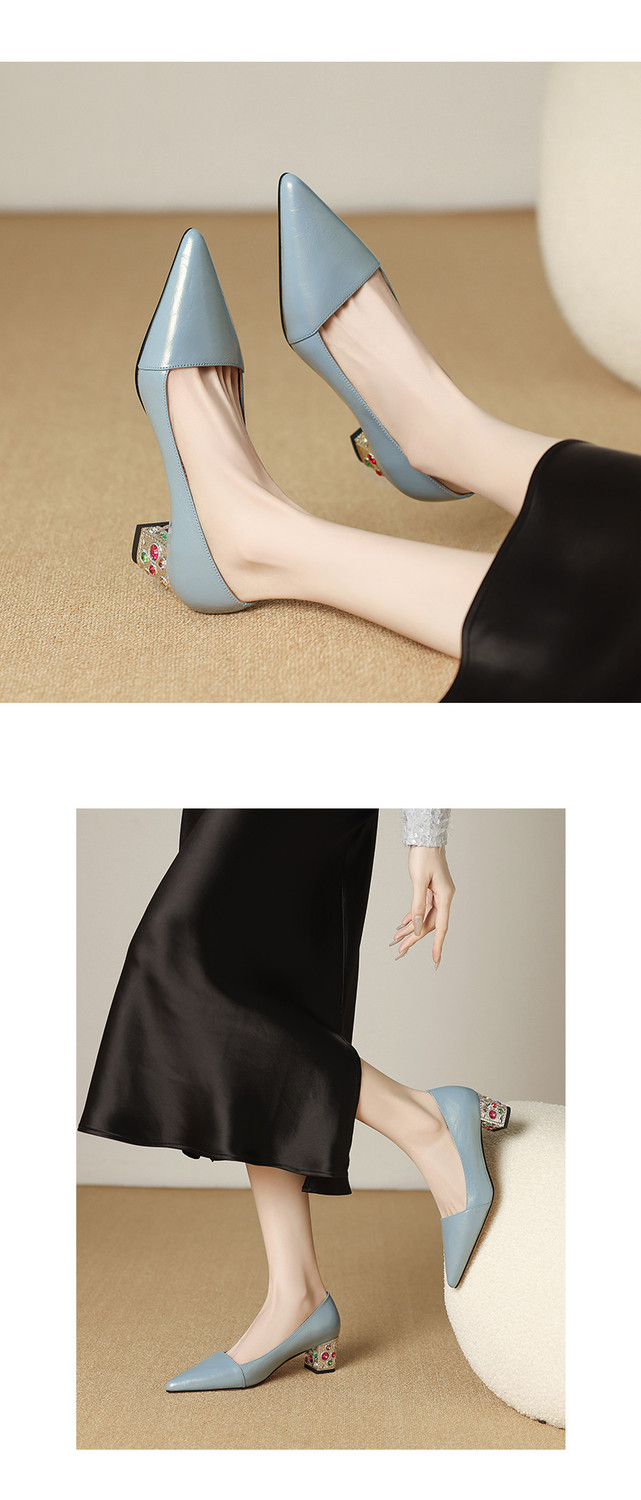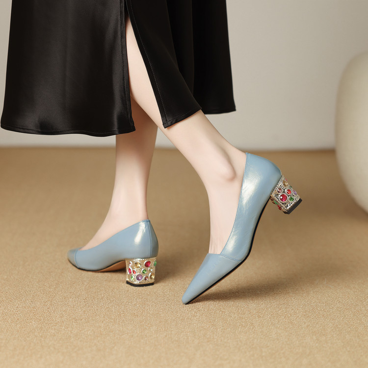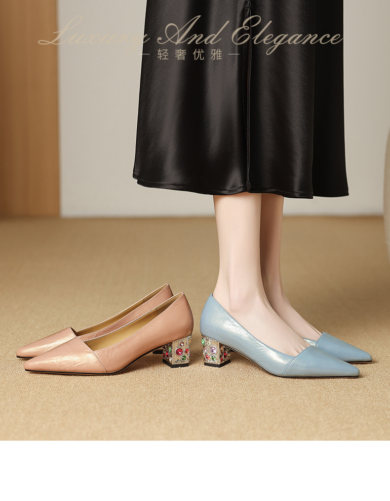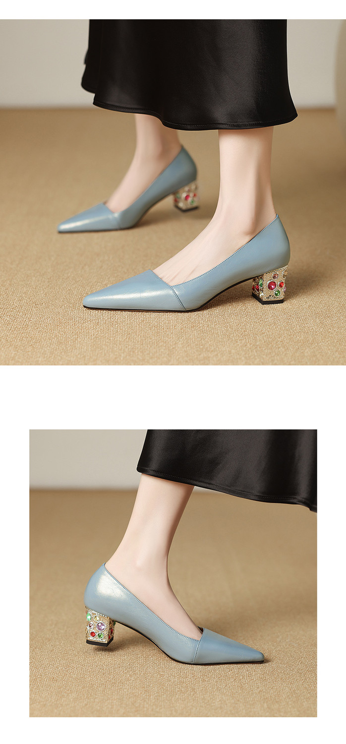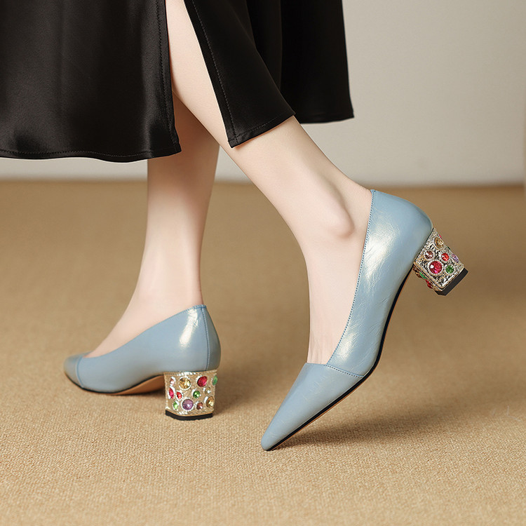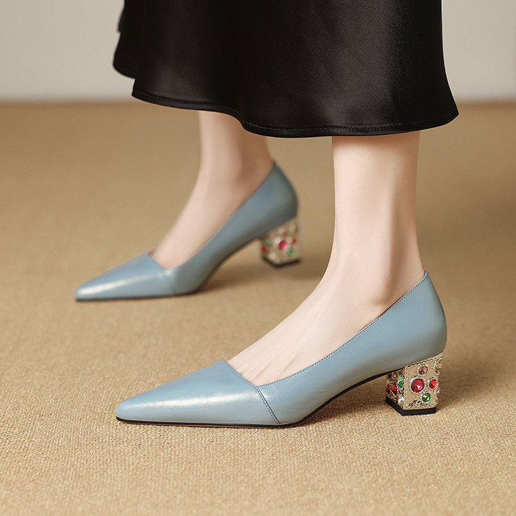 【预售5天】法式复古风粗跟单鞋真皮蓝色尖头水钻高跟鞋春夏时尚中跟单鞋MLS&A1021