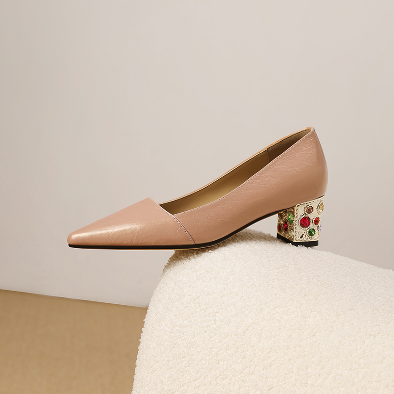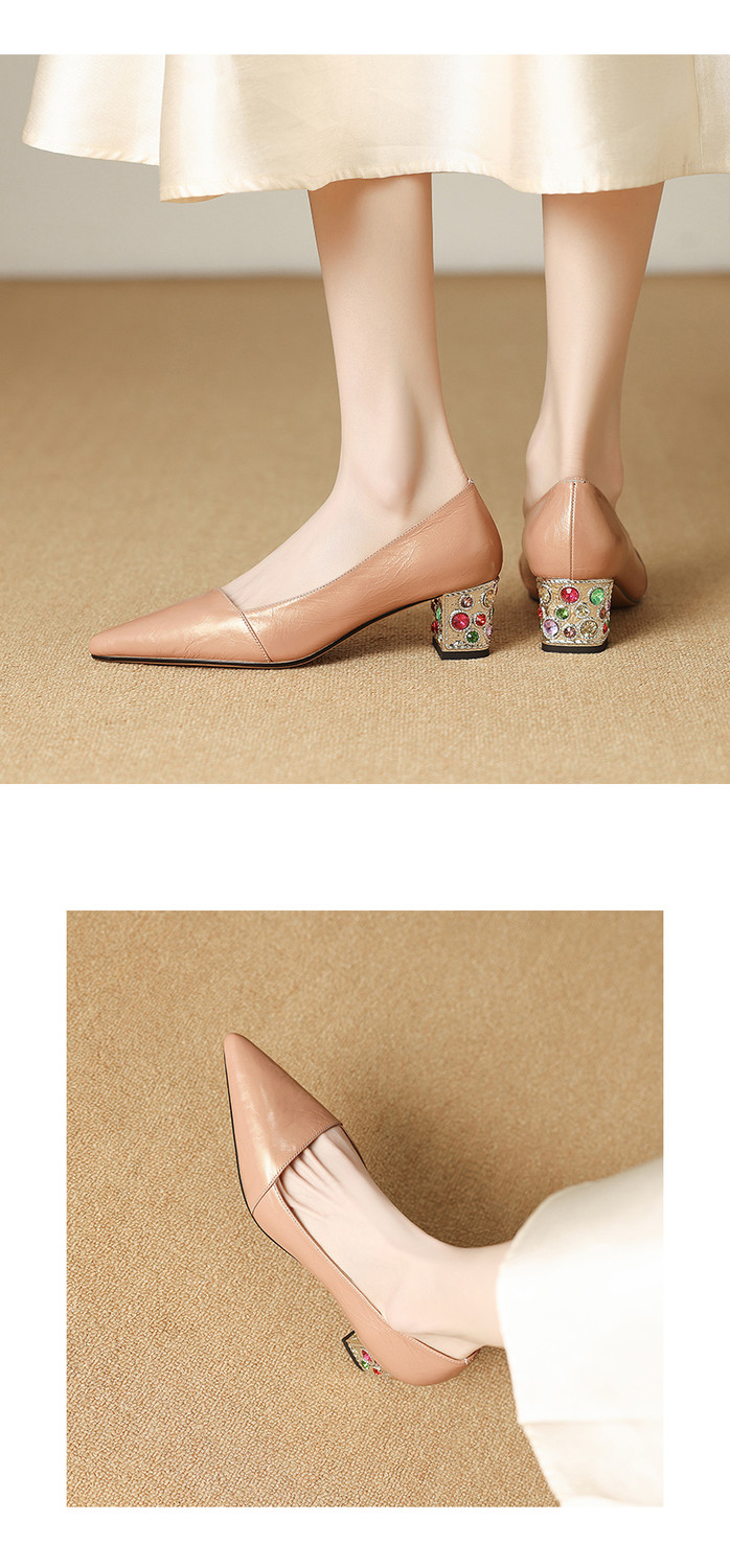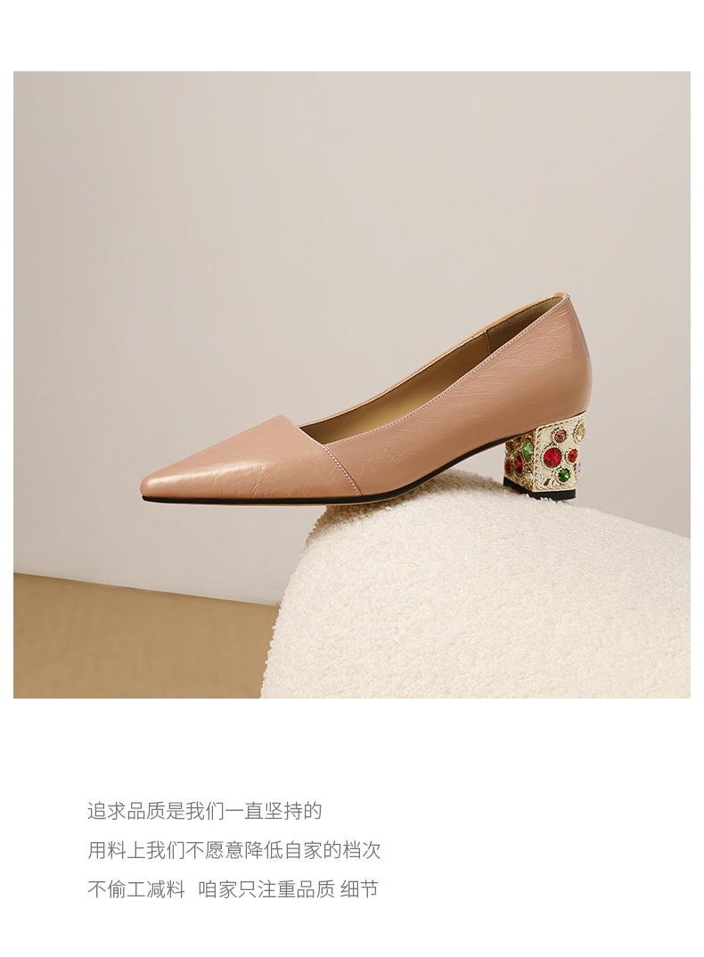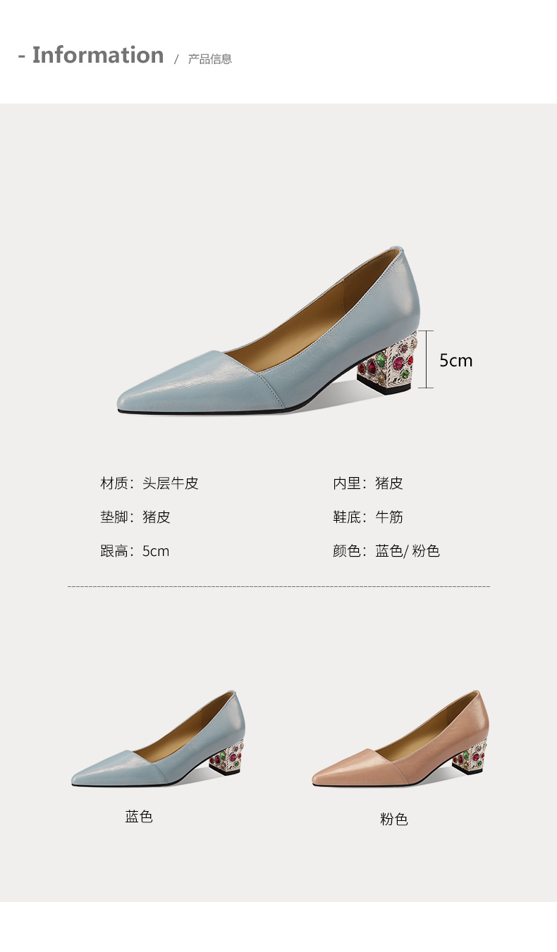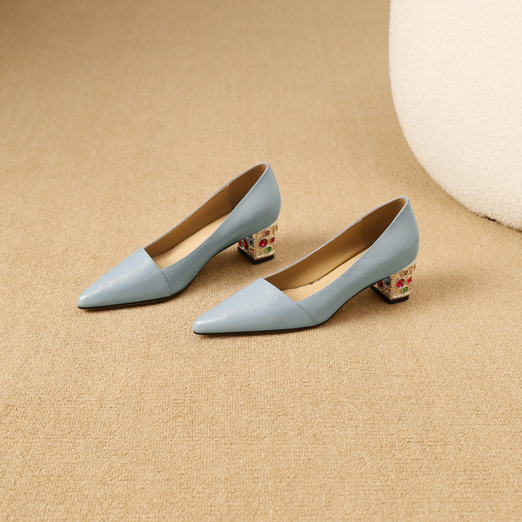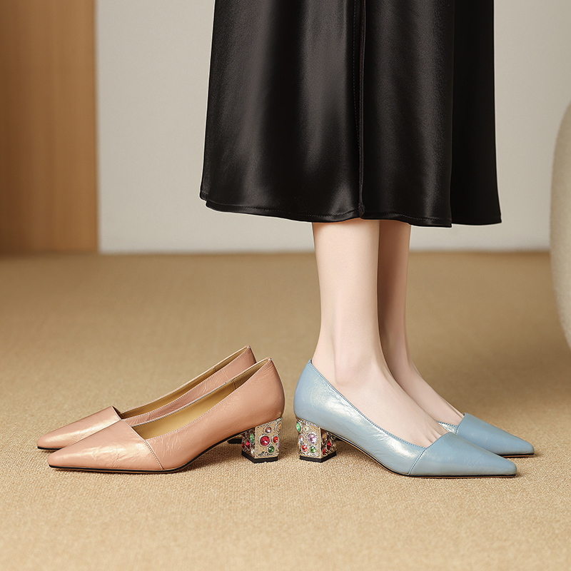 【预售5天】法式复古风粗跟单鞋真皮蓝色尖头水钻高跟鞋春夏时尚中跟单鞋MLS&A1021