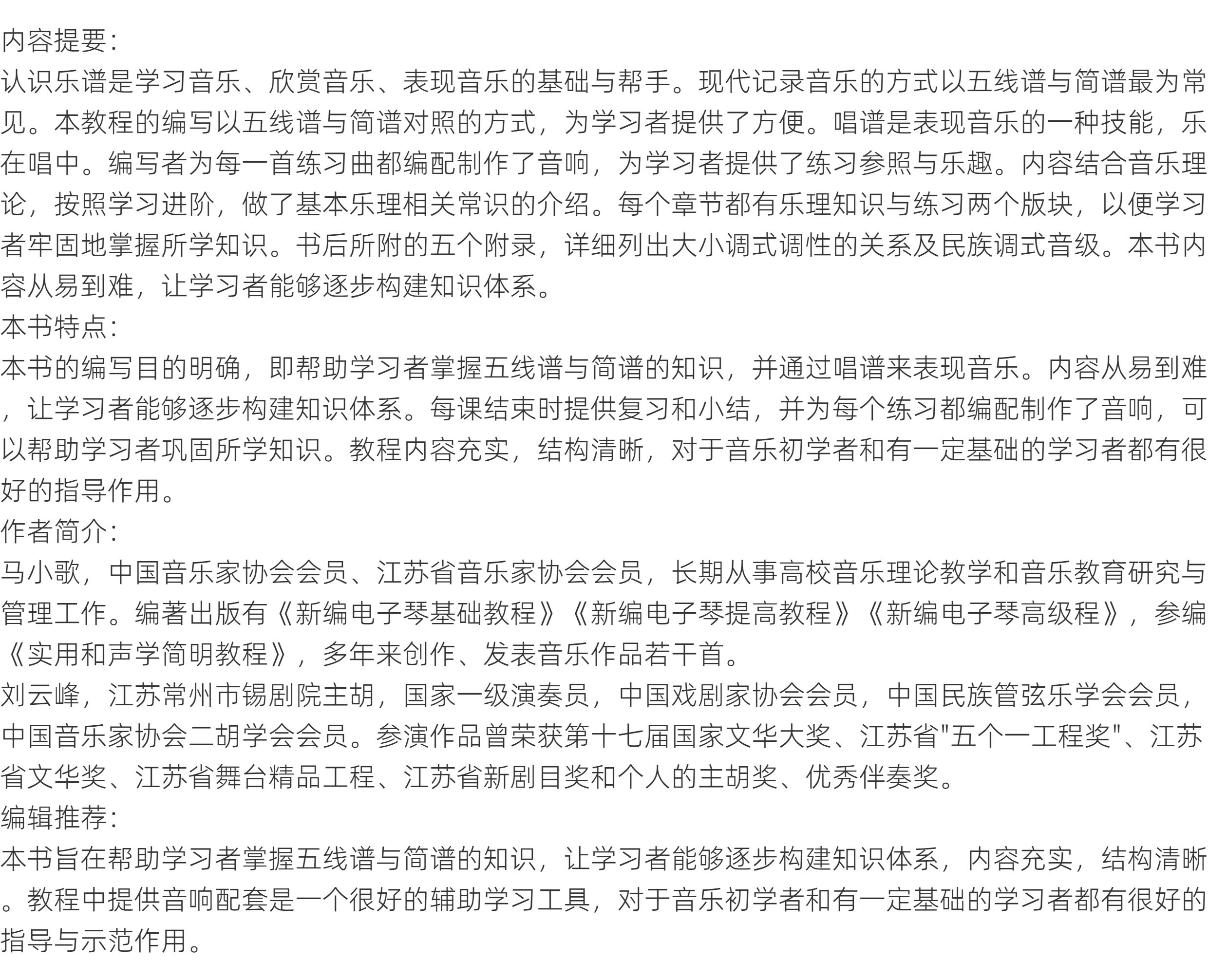 识谱与唱谱 线谱简谱同步学习配套音频边听边唱 认识乐谱是学习音乐欣赏音乐表现音乐的基础与帮手 江苏凤凰教育出版社