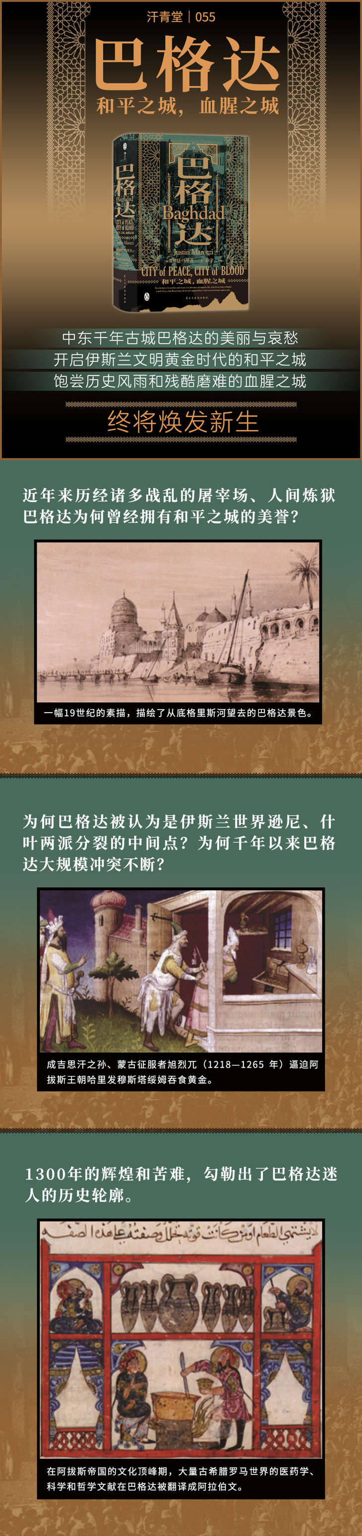 然而,巴格达的历史也有其血腥残酷的一面。这座城市经常遭受瘟疫、饥荒和洪水的侵袭;经历过大量恐怖的外敌入侵和军事占领;也时常需要忍受独裁者的残暴统治。因此,巴格达的历史也是其统治者和征服者的历史,例如奥斯曼帝国的苏丹、波斯沙阿、成吉思汗之孙旭烈兀、“上帝之鞭”帖木儿。当然,本书还生动地讲述了从奴隶到士兵等普通民众所经受的漫长而艰辛的生活。作者贾斯廷·马罗齐通过流畅的文笔和富有新意的视角叙述了巴格达1300多年的辉煌和苦难,勾勒出了巴格达这座城市迷人的历史轮廓。