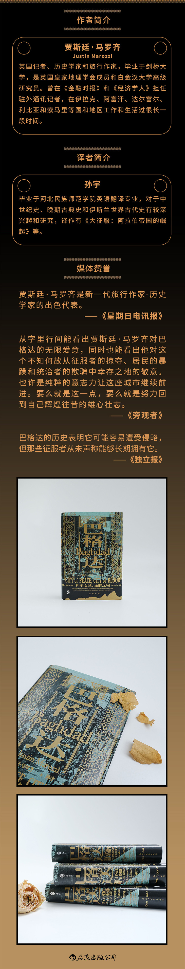 从字里行间能看出贾斯廷·马罗齐对巴格达的无限爱意,同时也能看出他对这个不知何故从征服者的掠夺、居民的暴躁和统治者的欺骗中幸存之地的敬意。也许是纯粹的意志力让这座城市继续前进。要么就是这一点,要么就是努力回到自己辉煌往昔的雄心壮志。 ——《旁观者》
