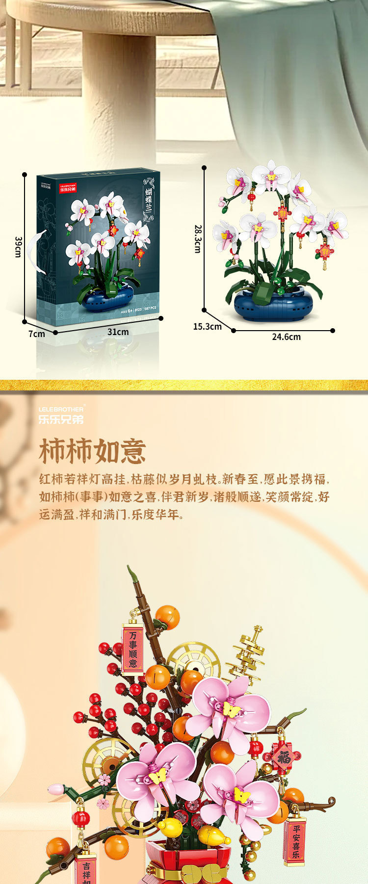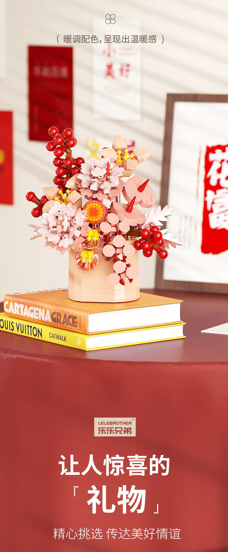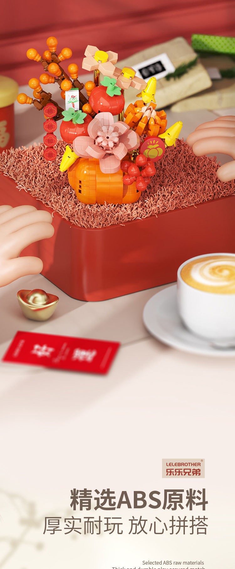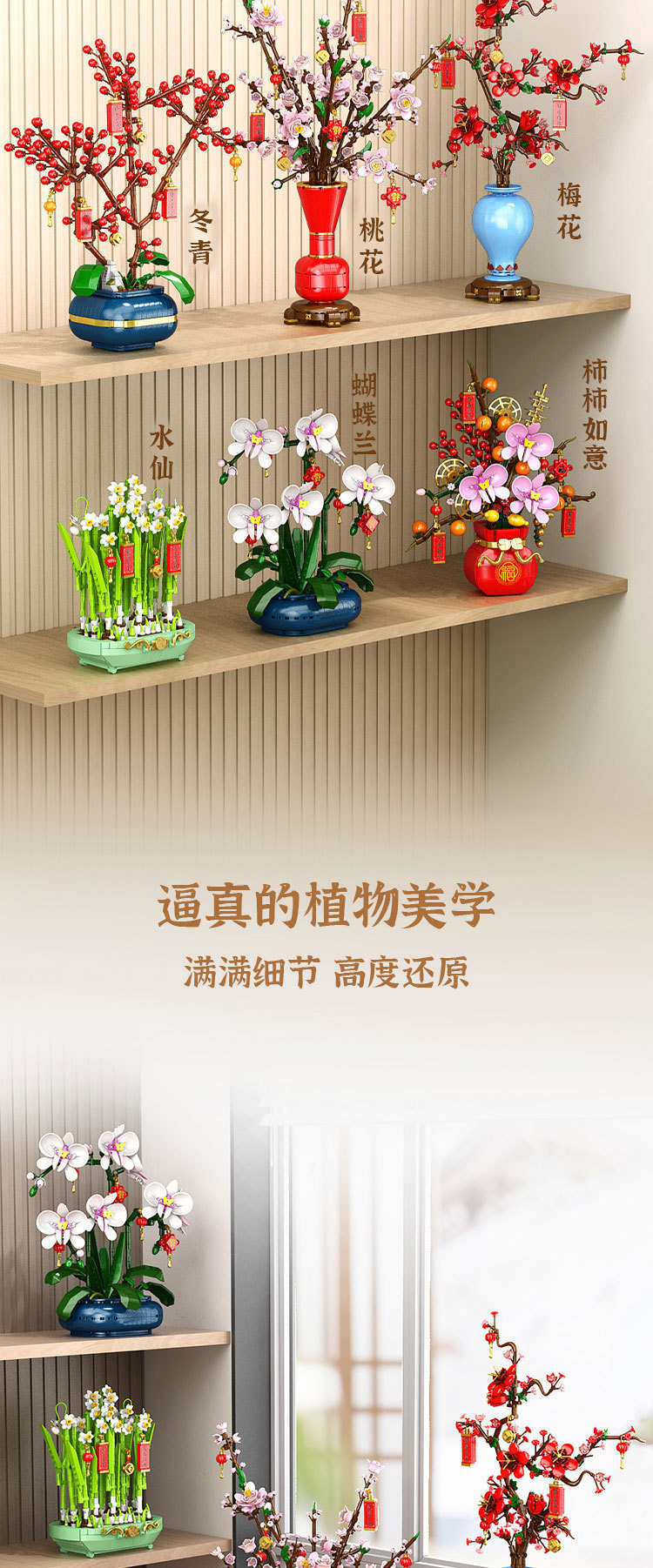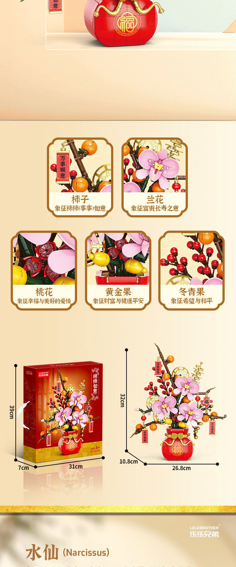 新年春节盆花积木摆件礼物柿柿如意金桔树摆件拼装积木儿童玩具