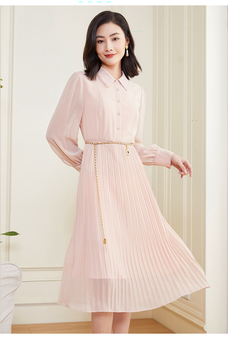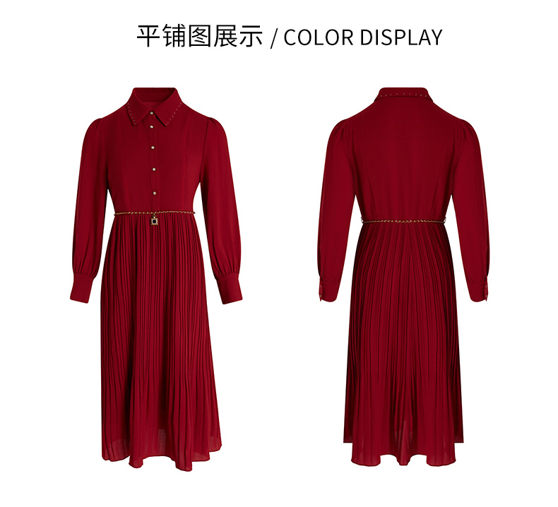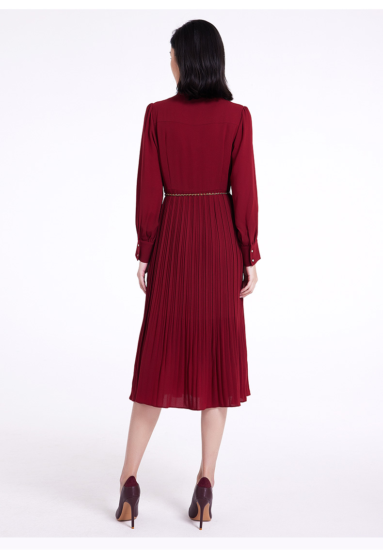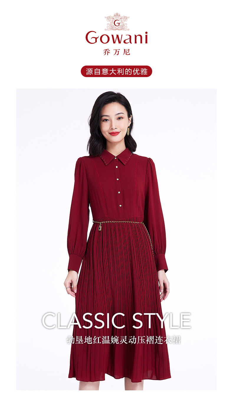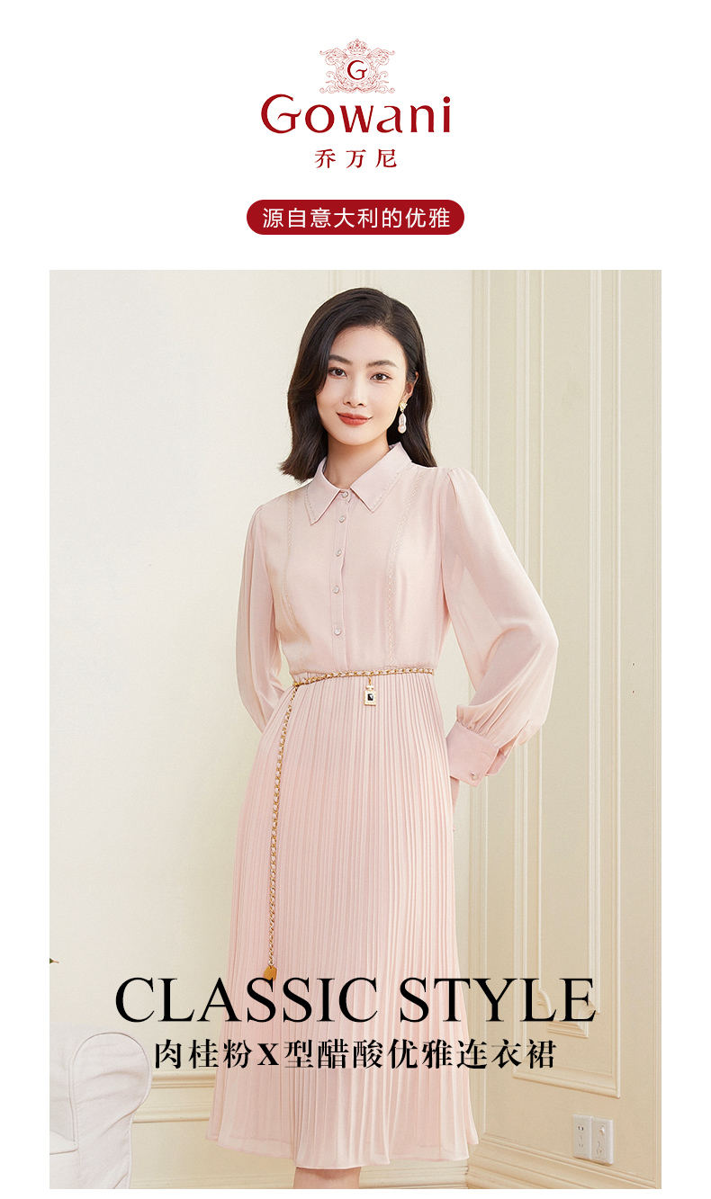 乔万尼春款连衣裙新款长袖收腰百褶长裙EF3E867