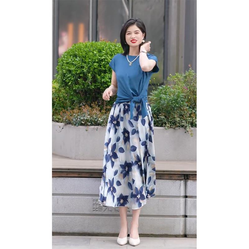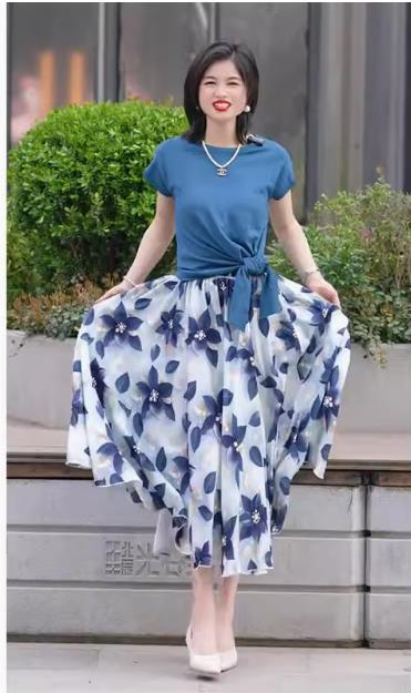 松弛感显瘦遮肚子减龄休闲,印花半身裙t恤两件套装LJX-548