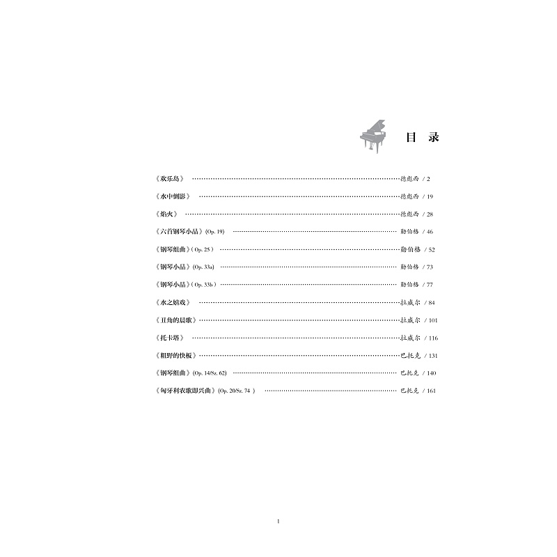 出于方便读者按时间线索对本书作品进行查阅的考量,本书是按照作曲家出生时间的先后顺序排列目录。为了方便读者更快捷地了解作曲家及其作品,本书对于选编的作曲家及其作品进行了文字简介。本书还在每一首作品简介中附有链接对应作品音频资料的二维码,以便读者以最简明快捷的方式欣赏乐曲。期望本书的多维性架构能够更好地满足读者学习和鉴赏20世纪优秀的世界钢琴音乐文化成果的需要。