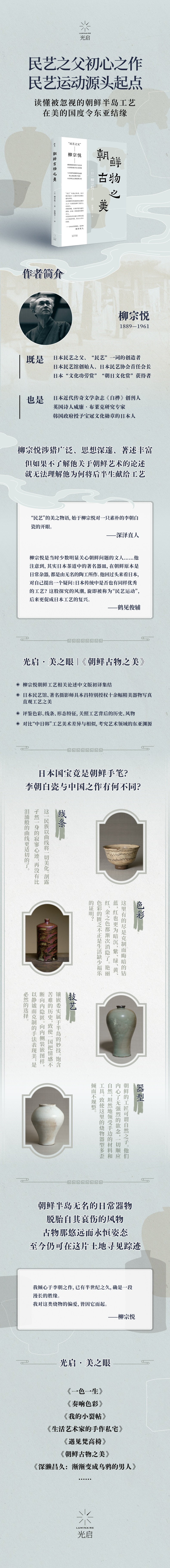 与朝鲜陶瓷器的邂逅,启发了日本著名美学家、民艺之父柳宗悦的美学探索,最终促成影响整个日本社会的“民艺运动”,波澜延宕至今。本书为柳宗悦研究朝鲜半岛器物的论述文集,亦为了解民艺思想的奠基之作。曾散缀于《白桦》《工艺》等重要文艺杂志的十数篇名作,解剖了朝鲜半岛工艺美术的特点及风格,对比了东亚三国工艺作品的相似与差异。对器物的品鉴,体现了柳宗悦在东亚历史风云变幻的年代,对普通民众生活的深刻理解,其美学思想超越了文化和地域,包含着深厚的人文主义情怀。