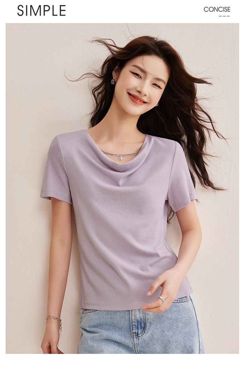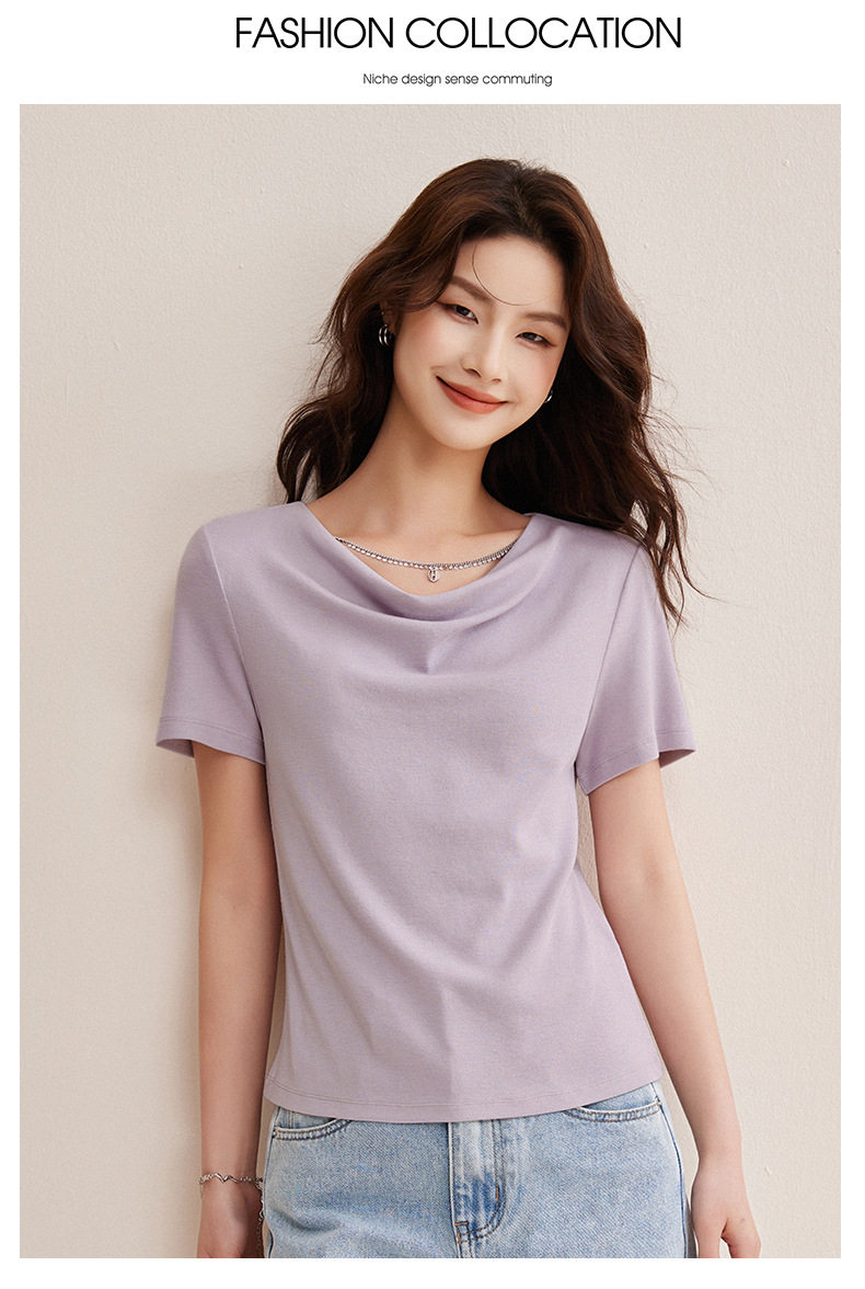 精仿羊绒美拉德复古咖色短袖t恤女高级感荡领修身内搭打底衫上衣  BY-W34 商品图0