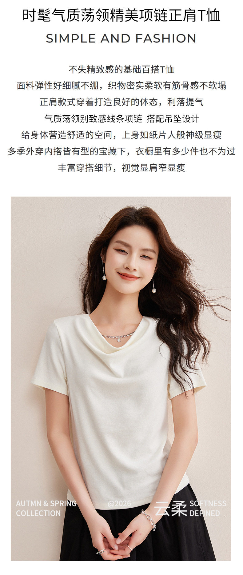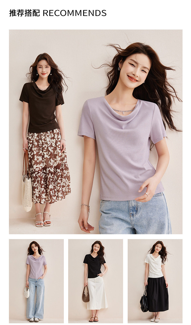 精仿羊绒美拉德复古咖色短袖t恤女高级感荡领修身内搭打底衫上衣  BY-W34 商品图2