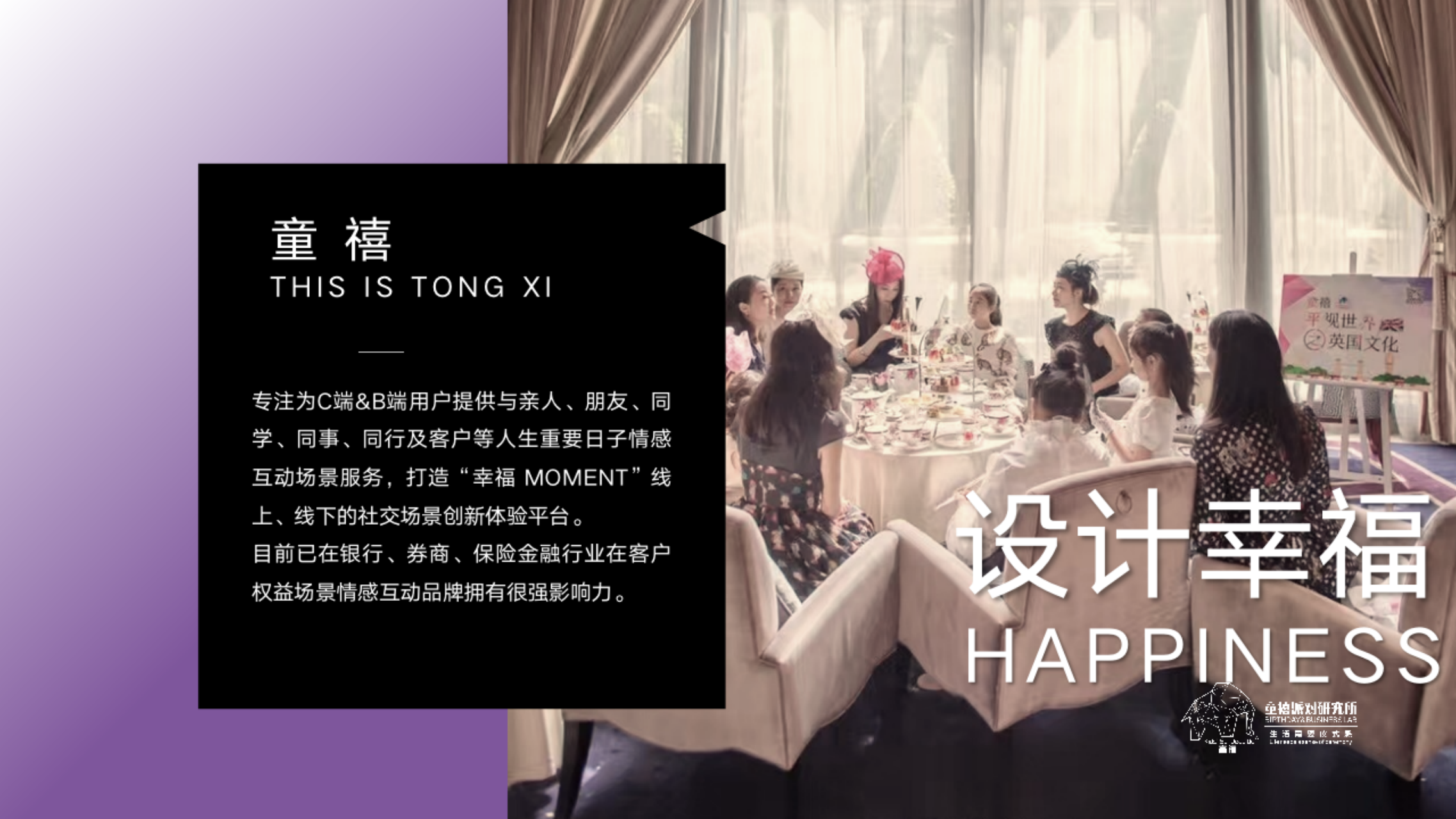 我们创办了“童禧”,她是一个潜心研究与开发“设计幸福”的未来机构,同时,也是一家致力探索和推动“派对文化在人与人,个人与家庭,个人与社区,个人与企业之间的和谐关系的派对研究所。