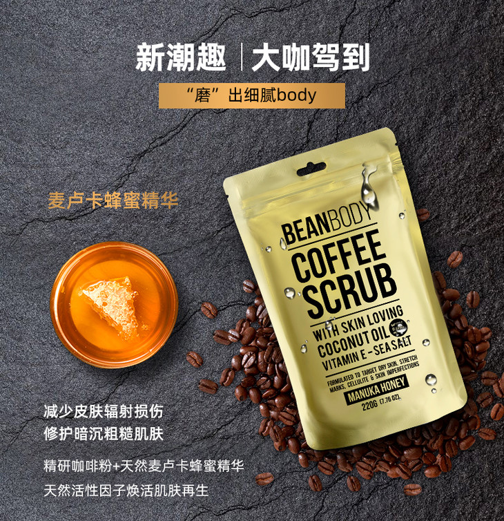 现货 beanbody去角质鸡皮磨砂膏麦卢卡蜂蜜咖啡按摩沐浴盐全身嫩白