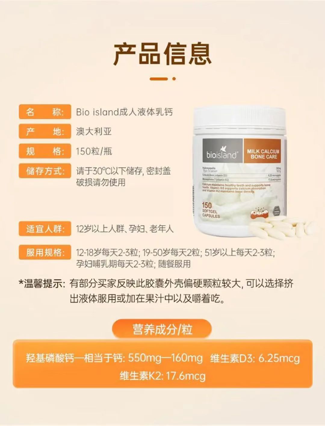 【跨境】澳洲bio island佰澳朗德 牛乳钙胶囊 150粒/瓶