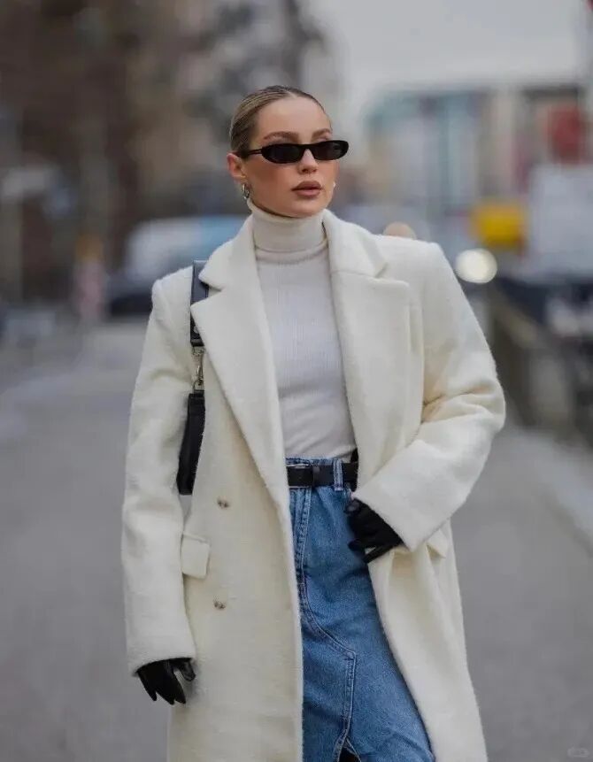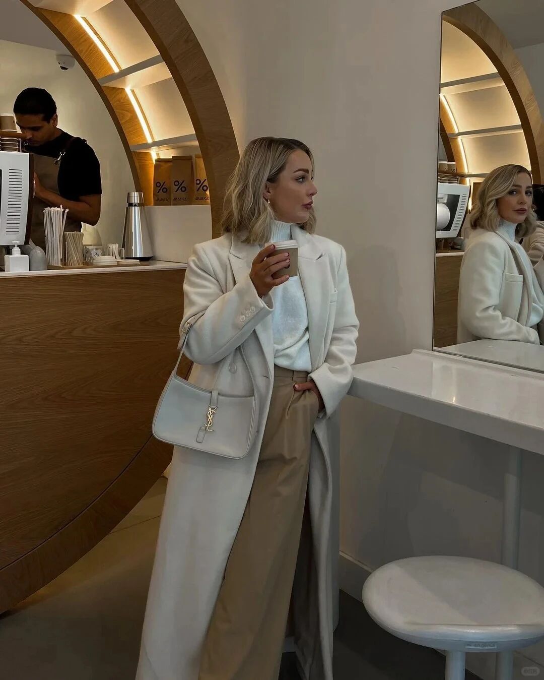 如果是职场穿搭,在颜色选择上,米白大衣会比纯白更温柔一些,裤子的颜色可以是燕麦、卡其色这类中性色,跟白色大衣搭在一起,整体干净又柔和。内搭白色高领打底衫,下装搭配一条卡其色阔腿裤,给人一种不经意的洒脱感。