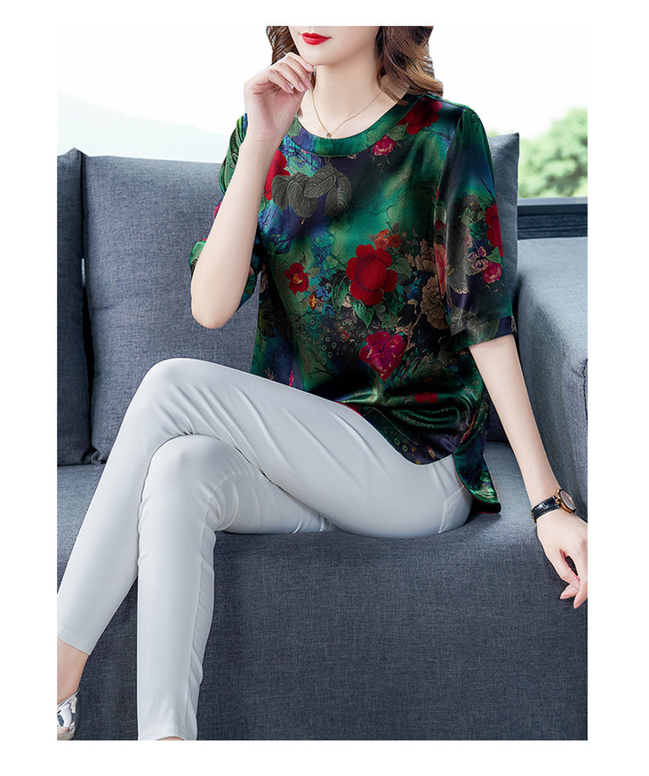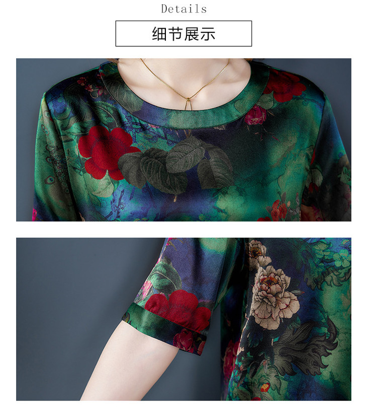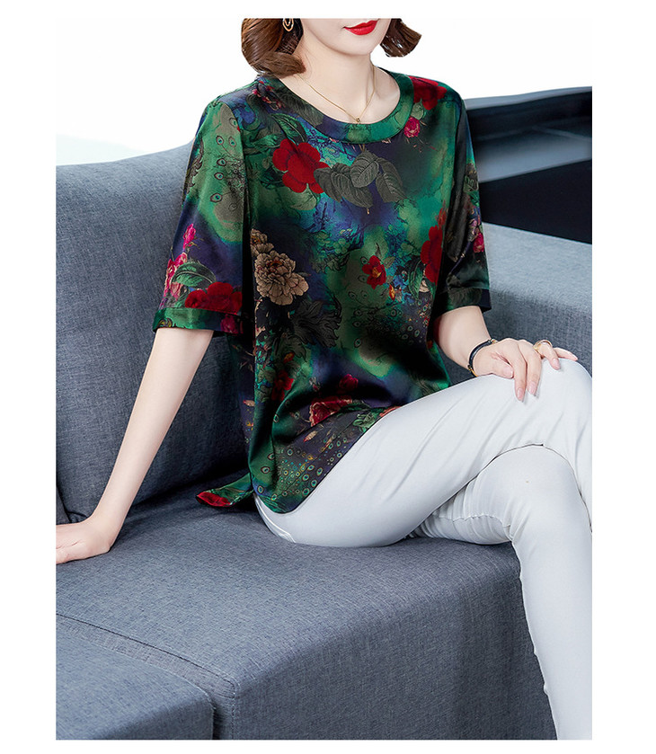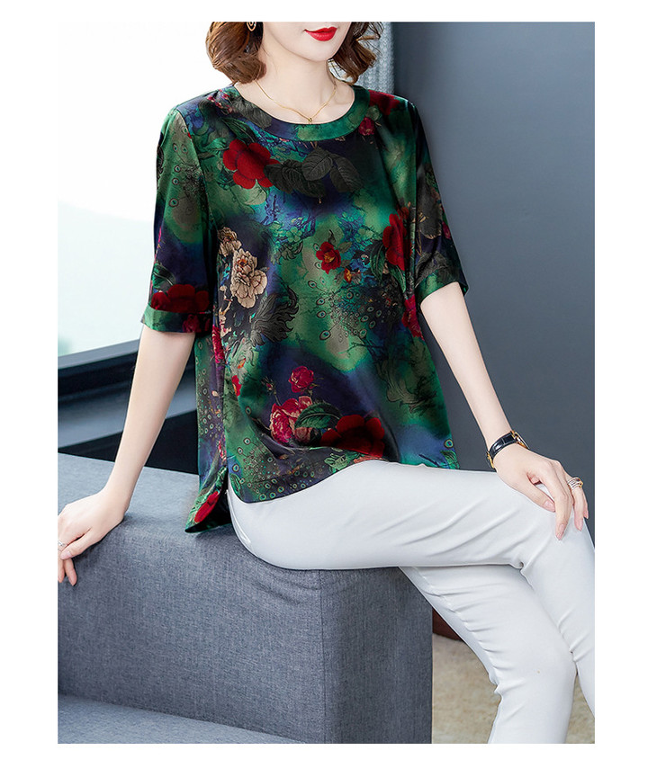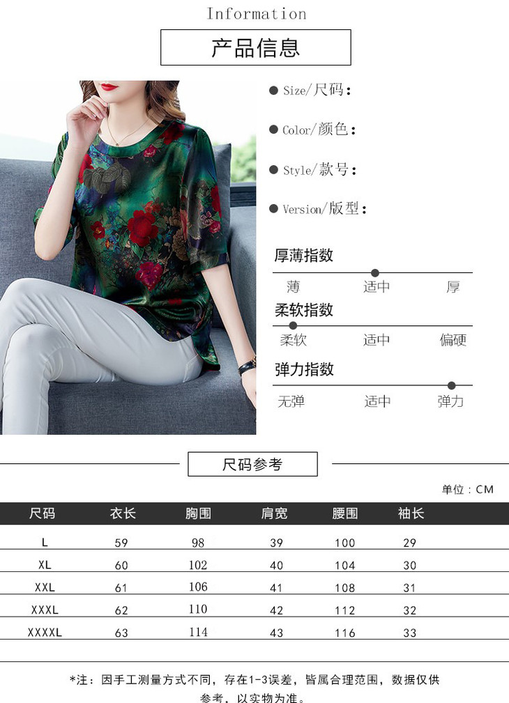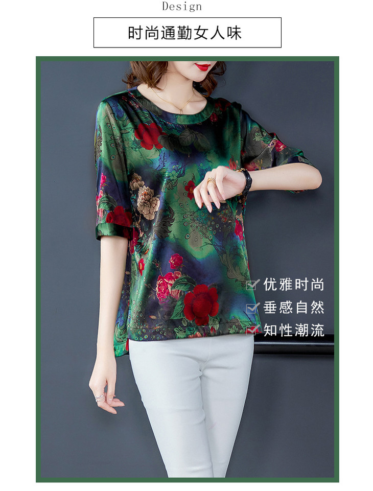 AHM-6822夏新款仿真丝印花中袖T恤圆领大码妈妈装
