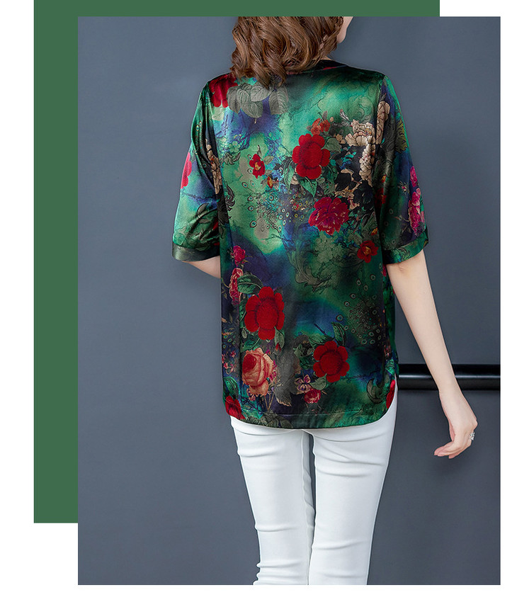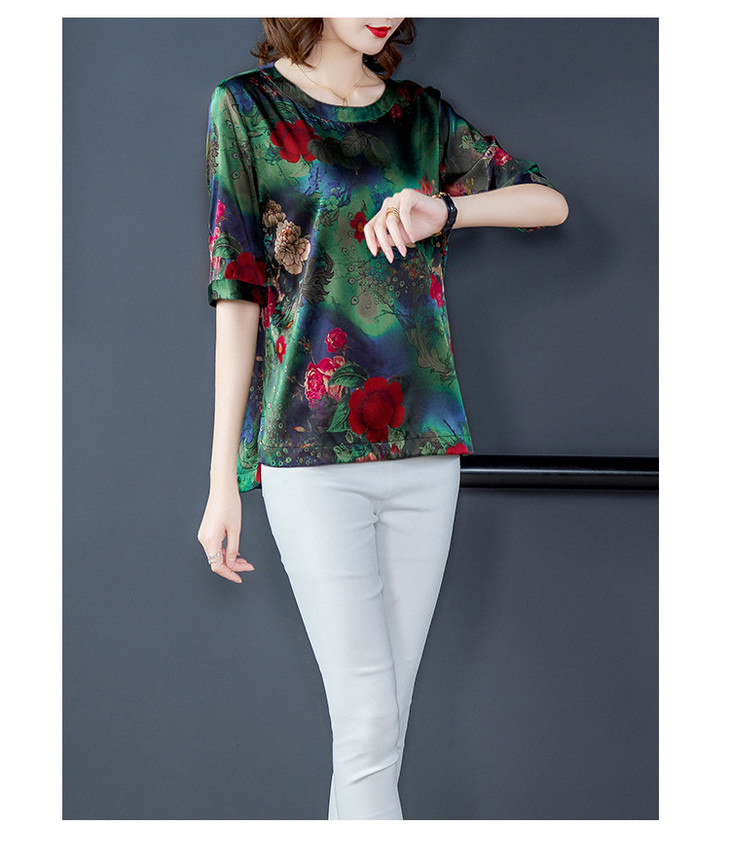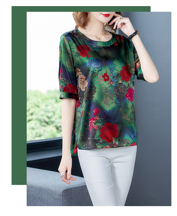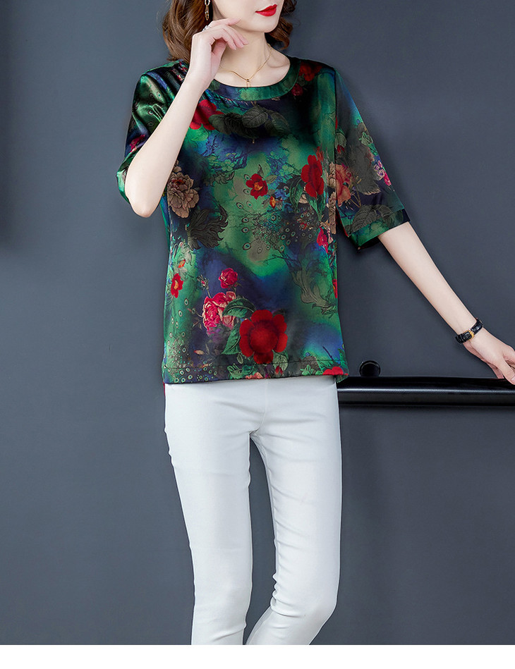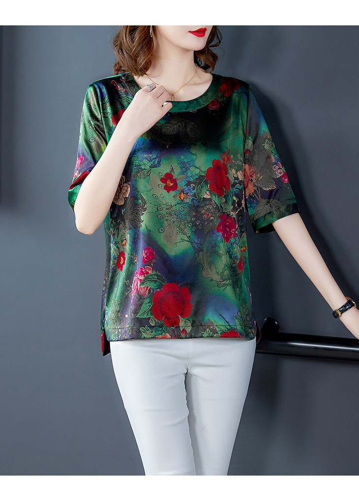 AHM-6822夏新款仿真丝印花中袖T恤圆领大码妈妈装
