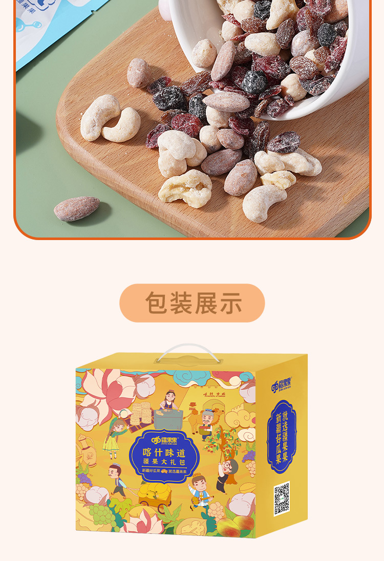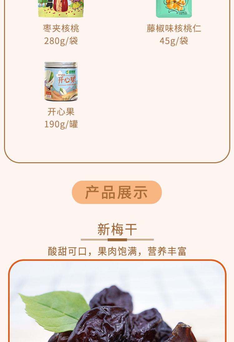 【疆果果】新疆特产 南疆印象礼盒A款: 新梅干150g*1 红枣脆片128g*1 玫瑰香葡萄干260g*1 益生菌每日坚果175g*1 枣夹核桃280g*1 开心果190g*1 藤椒味核桃仁45g*3