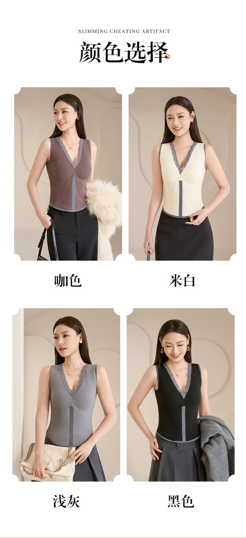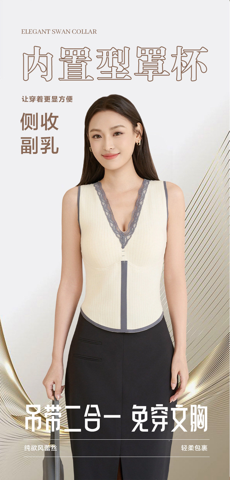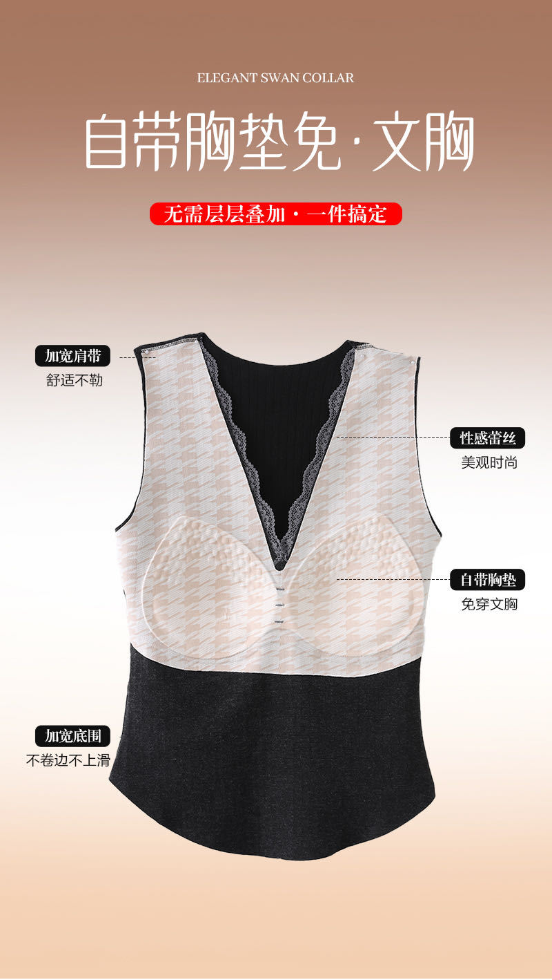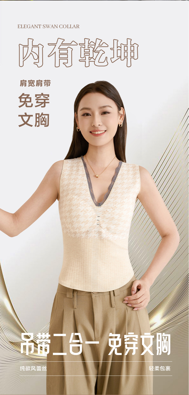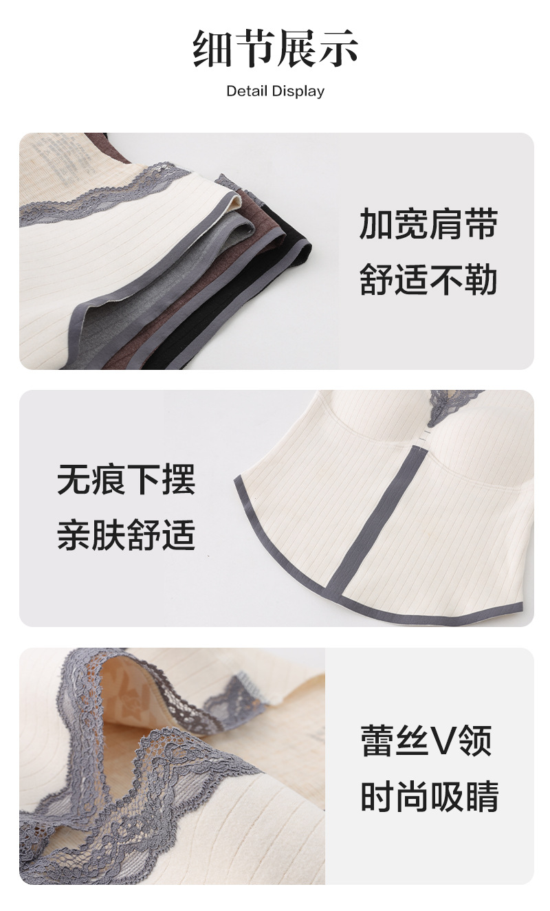 雀说蕾丝边V领阳离子无痕美背无钢圈性感舒适外穿条纹女士保暖背心女ALWT75