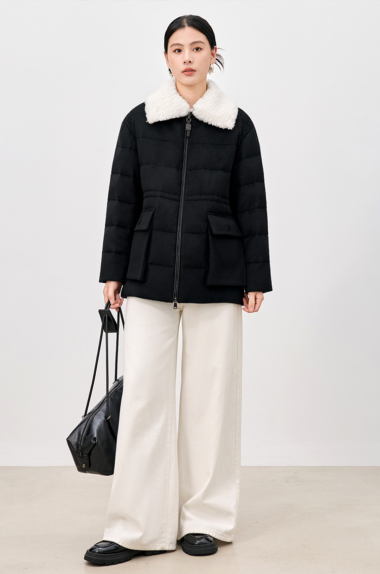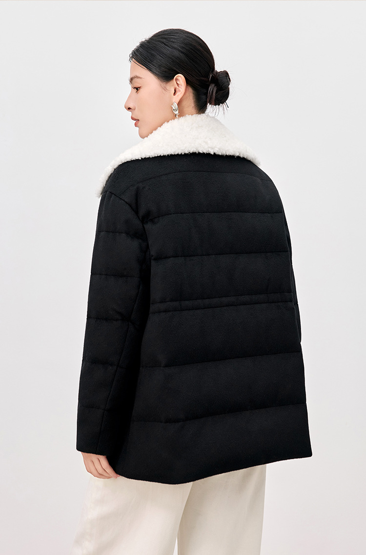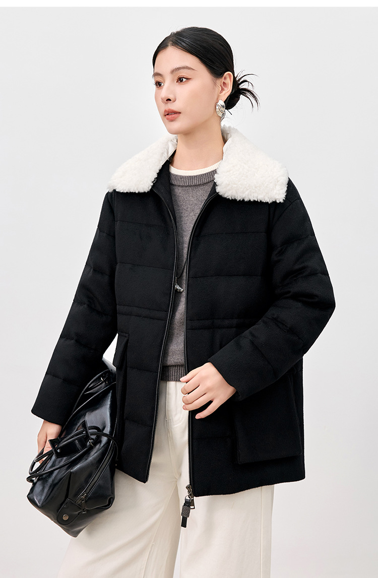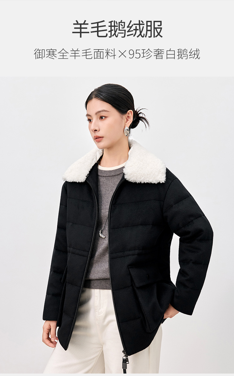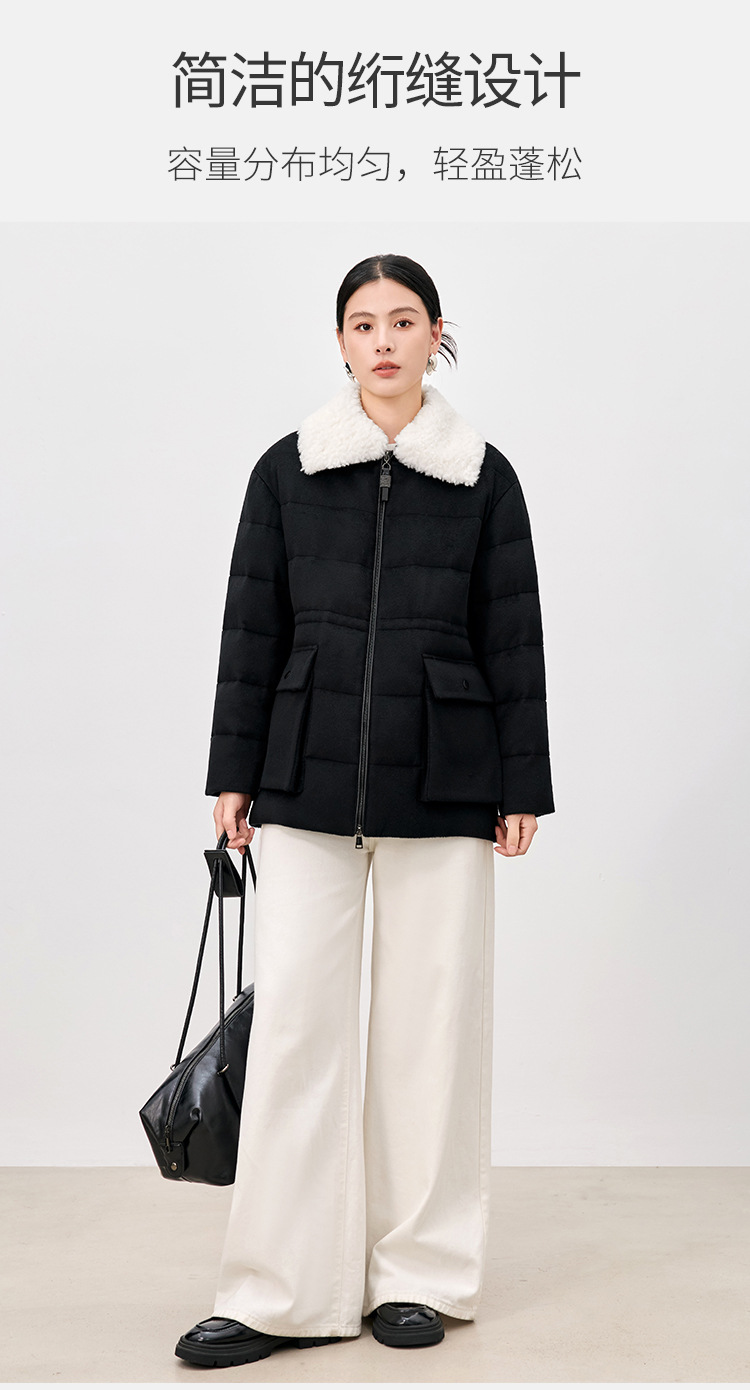 QS翻领毛领鹅绒服女25冬季新款简约日常保暖纯色设计感羊毛外套8516