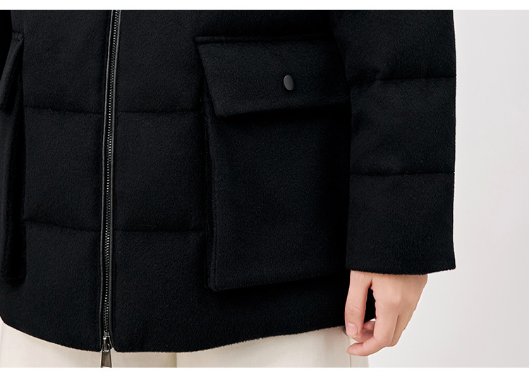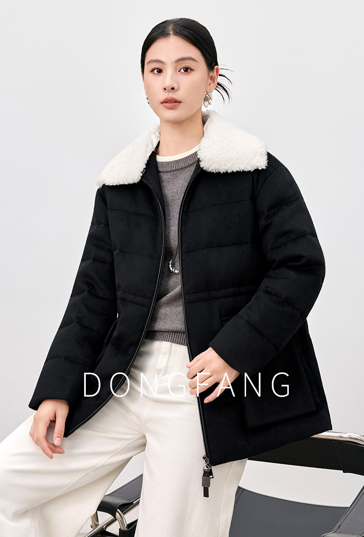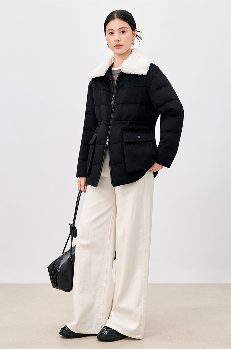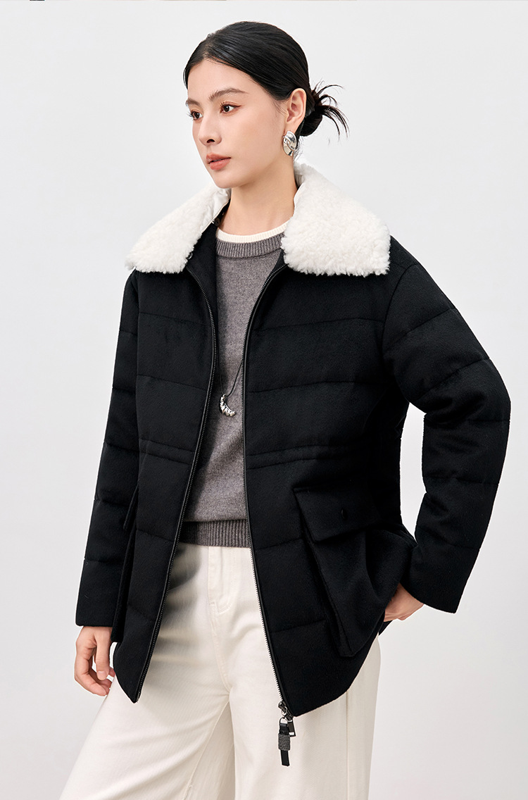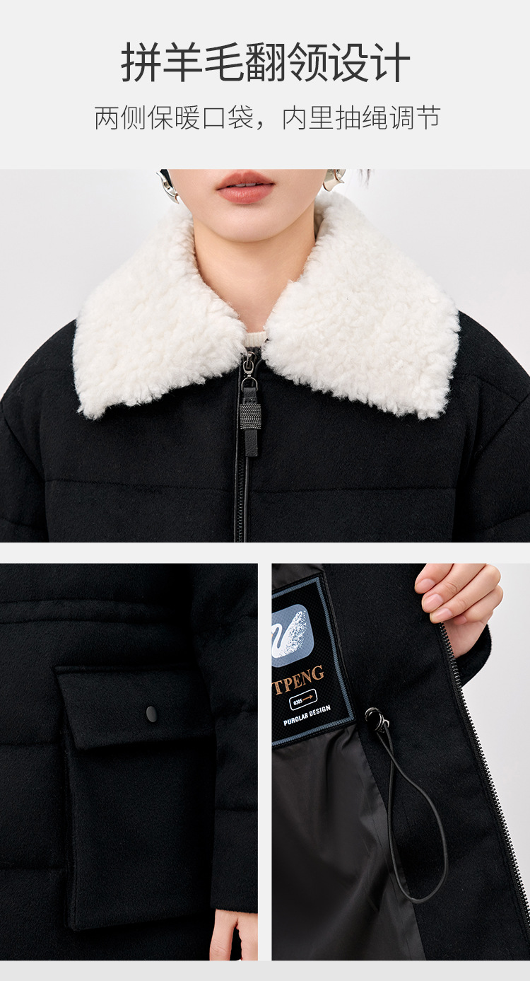 QS翻领毛领鹅绒服女25冬季新款简约日常保暖纯色设计感羊毛外套8516