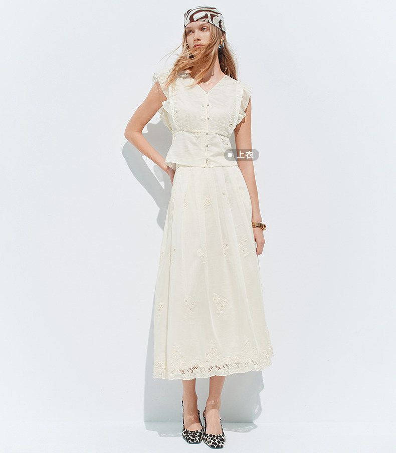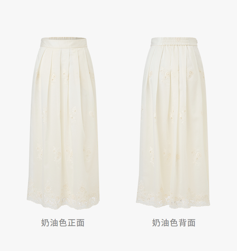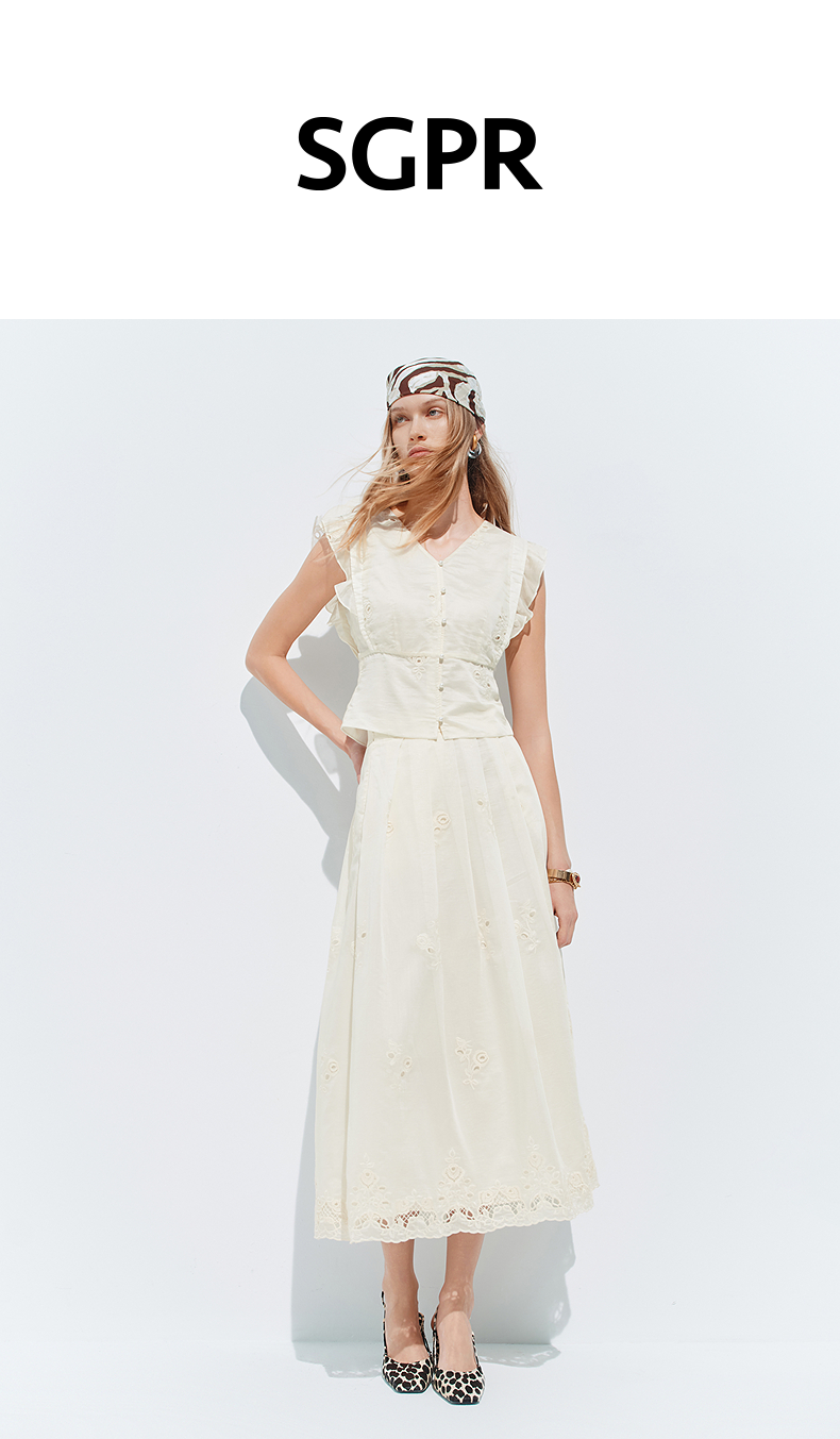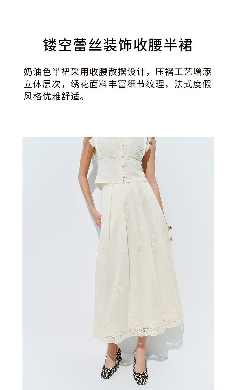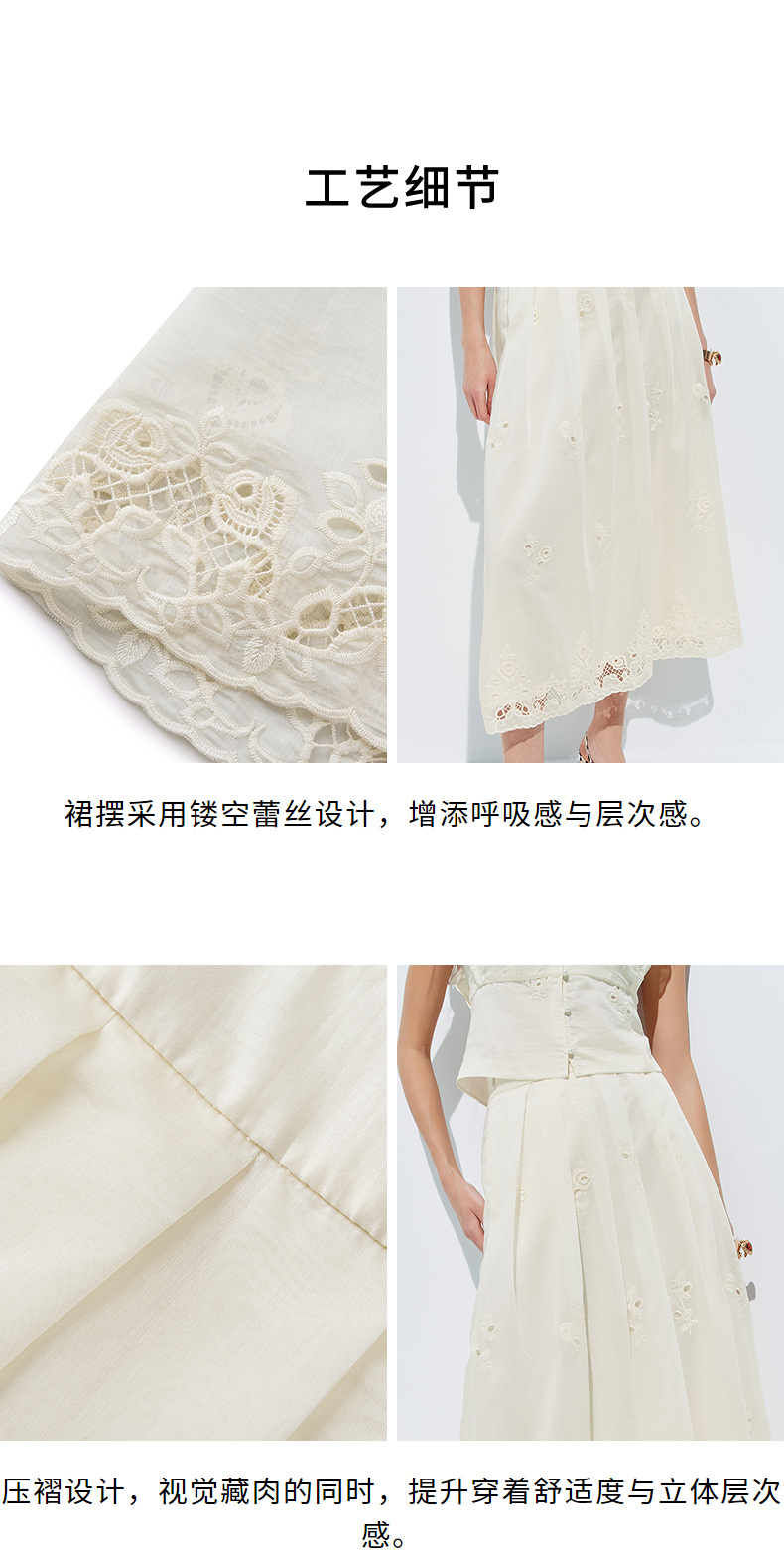 【SGPR】奶油白色半身裙2026年夏季新款高腰压褶半裙镂空蕾丝长裙(货号:MU80SK016)