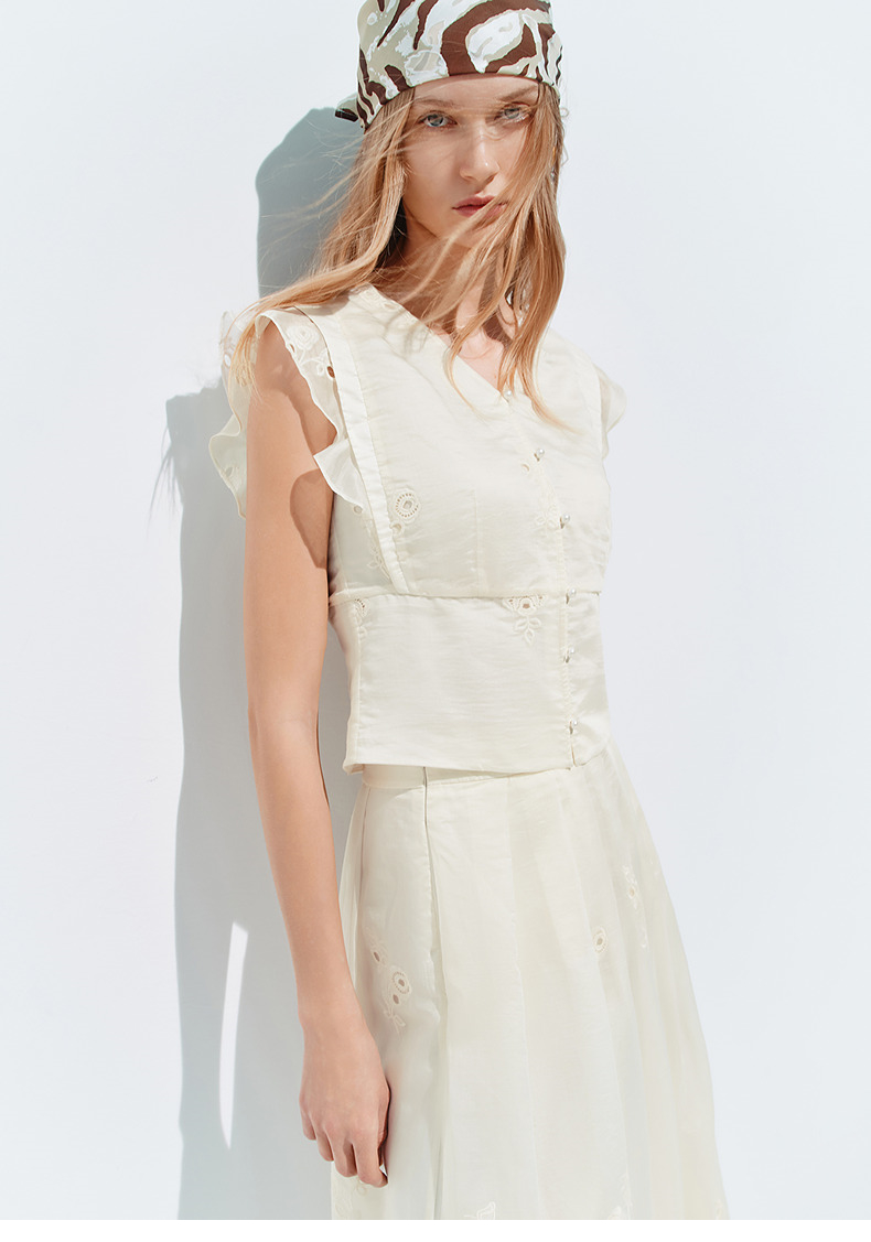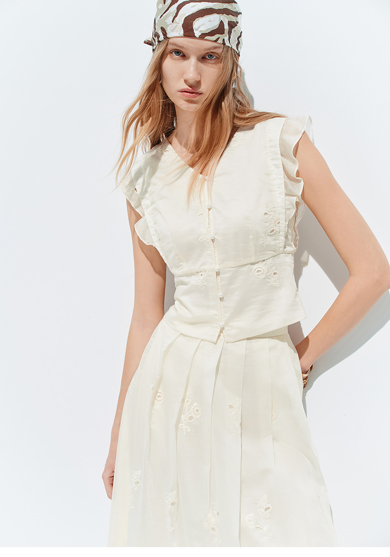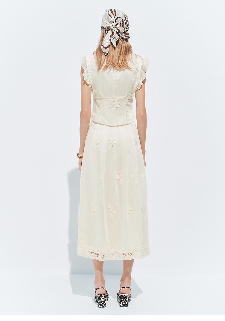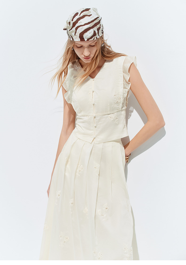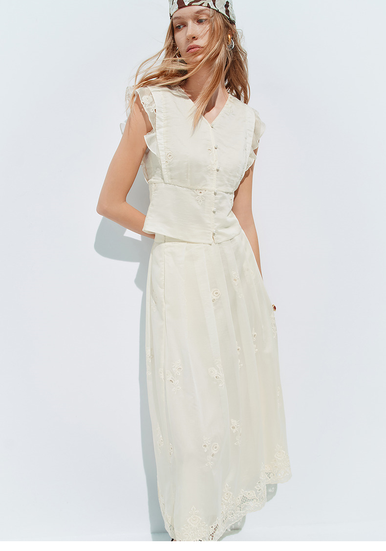 【SGPR】奶油白色半身裙2026年夏季新款高腰压褶半裙镂空蕾丝长裙(货号:MU80SK016)
