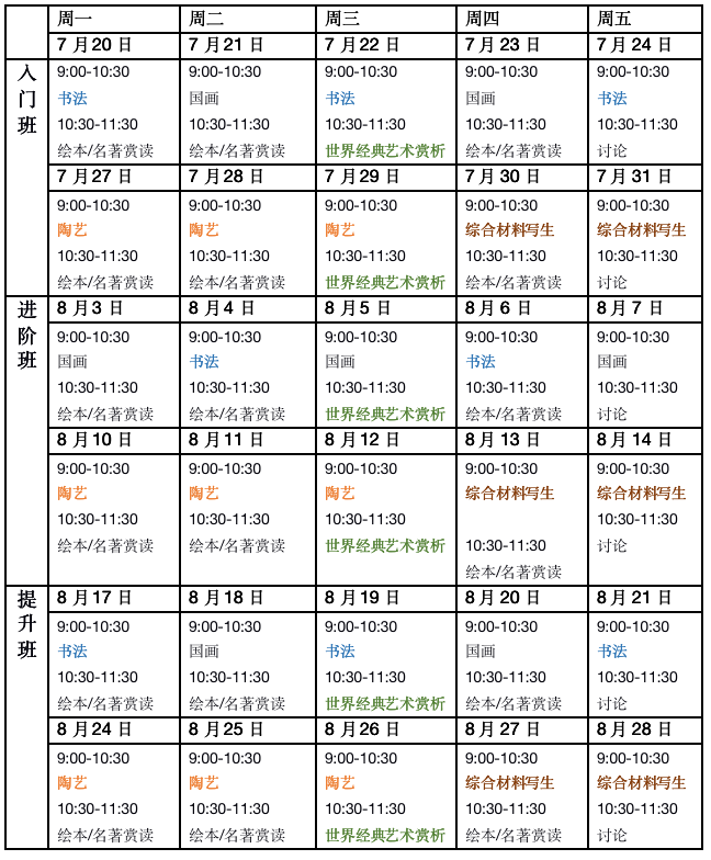 →艺术绘画由四部分课程组成,国画、书法、陶艺、综合材料写生。授课老师有国画和陶艺研究生背景,设计入门、进阶、提升三个层次课程,学员能够在学习过程中逐渐提升眼界和动手能力。