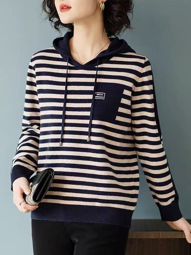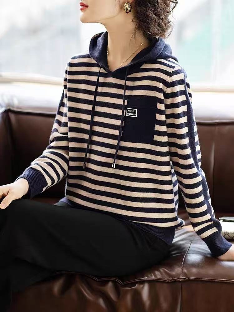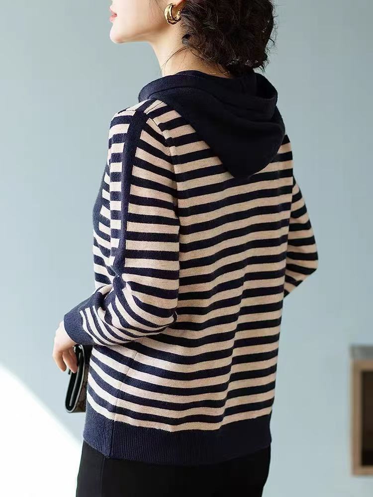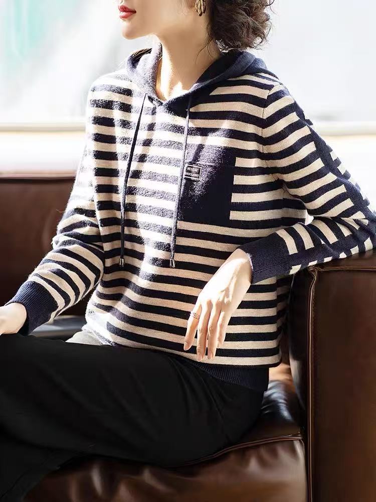 【孤品捡漏】G26藏青➕卡其条纹连帽针织衫-喜出