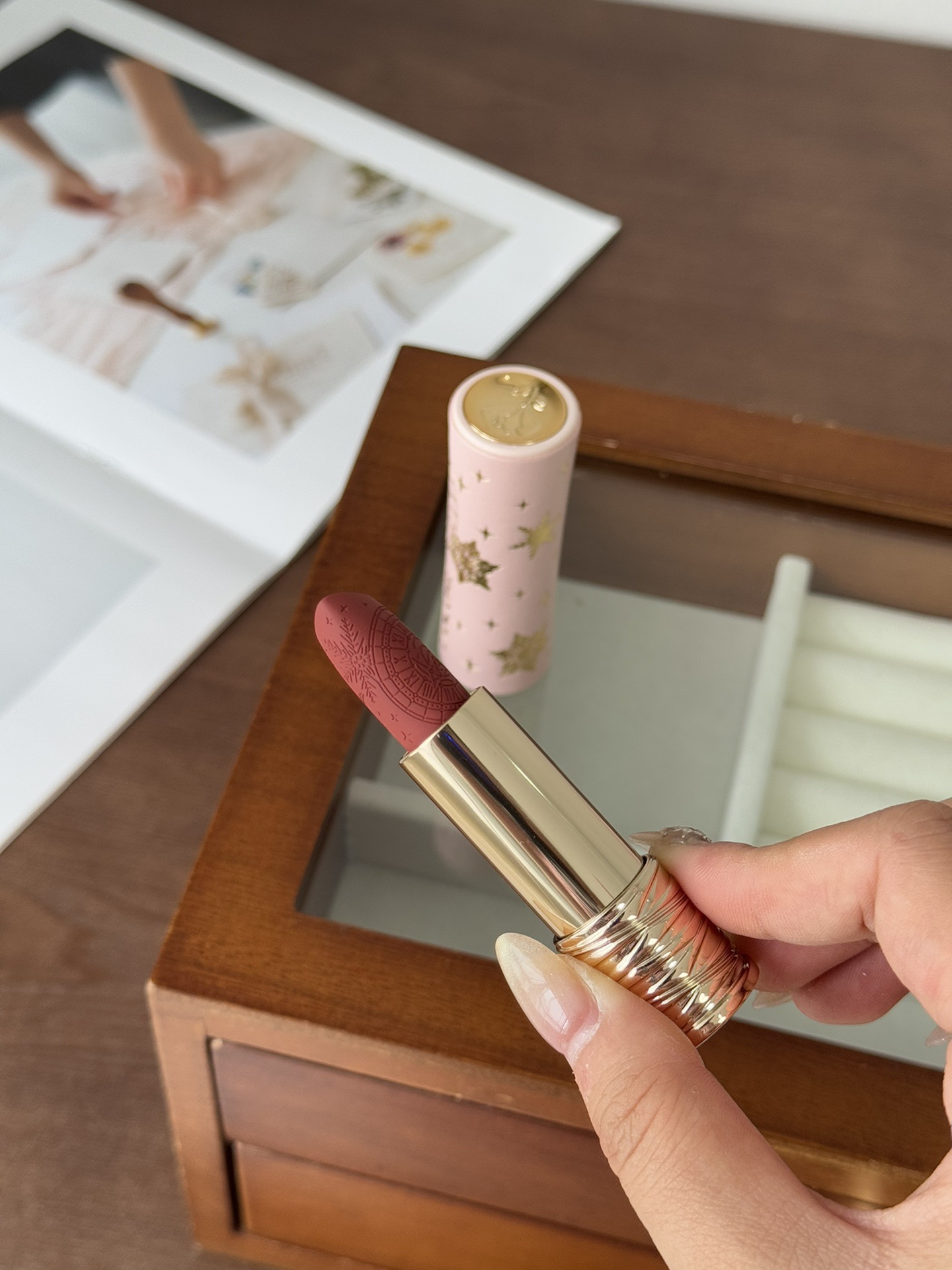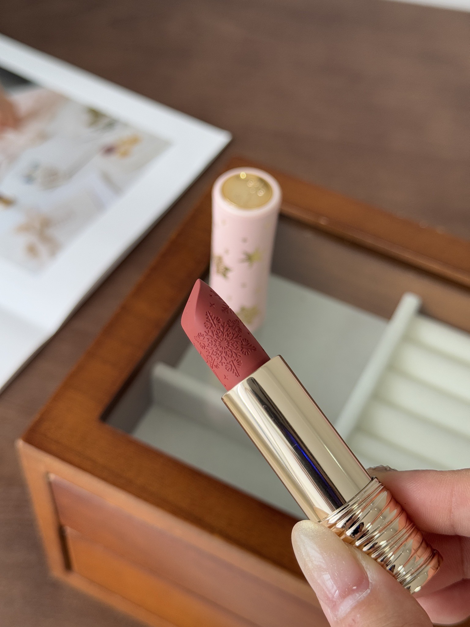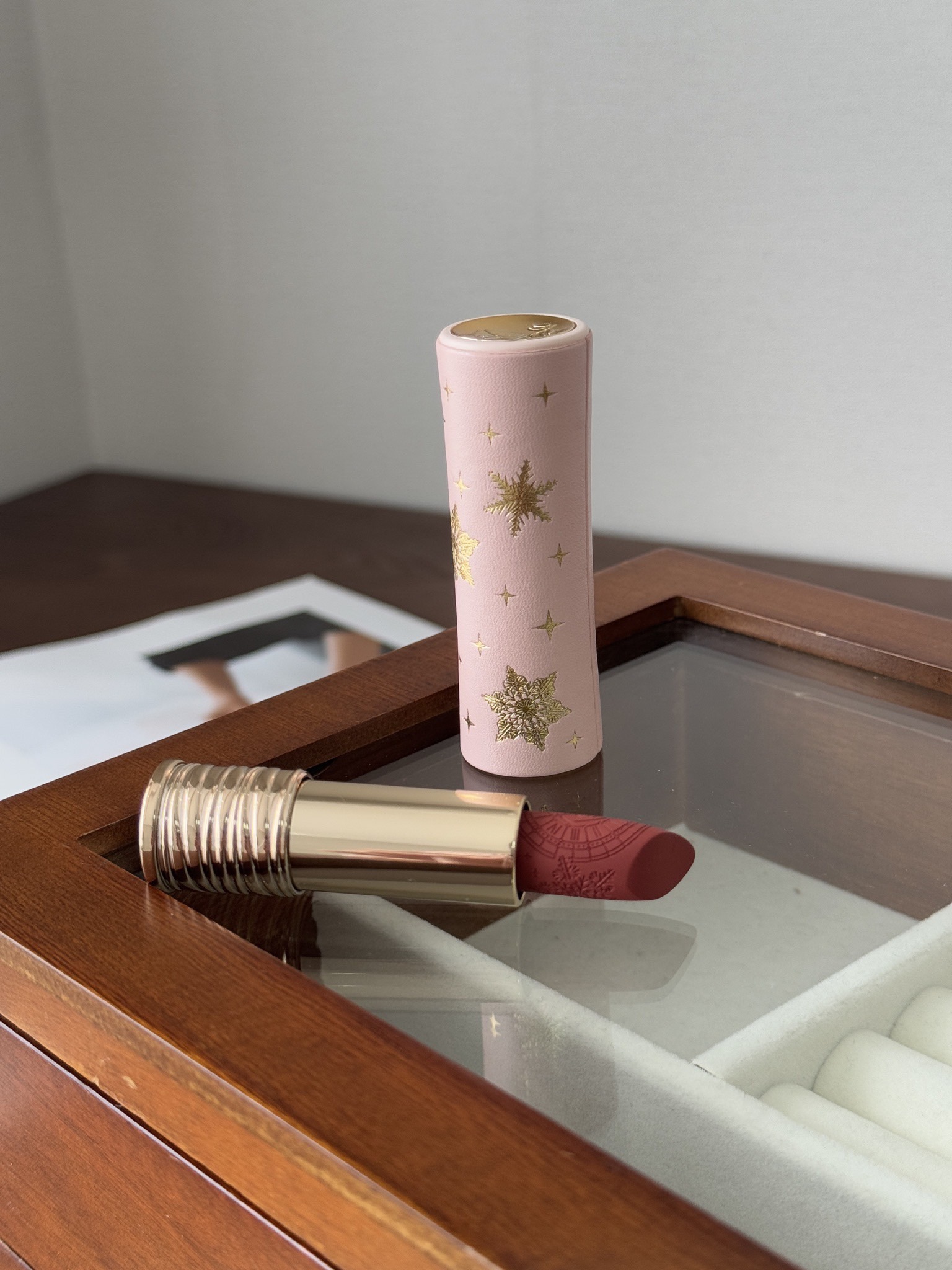 开合式的礼盒设计仪式感十足,打开的瞬间像拆一份专属的节日惊喜;单支口红的包装也延续了礼盒的精致纹样,细节处尽显用心