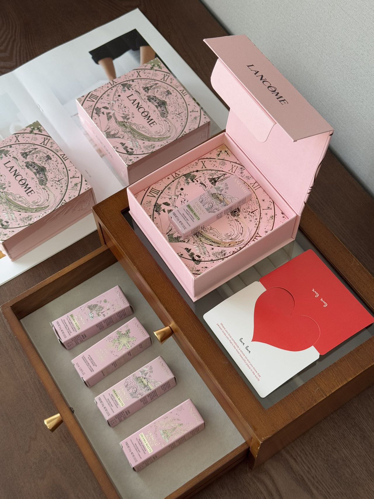 礼盒以温柔的樱花粉为主调,搭配复古的时钟与花纹图案,满满的法式浪漫感。