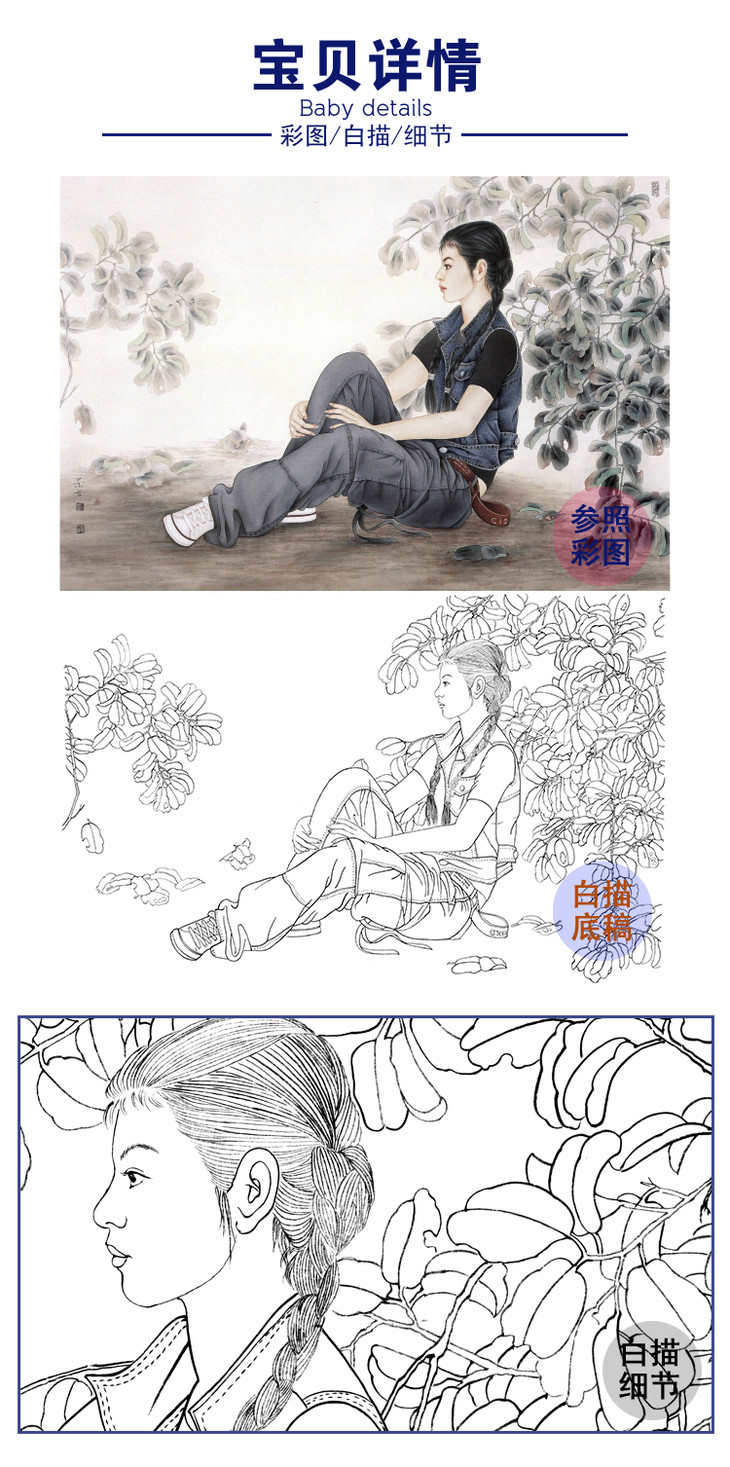 崔景哲横幅工笔现代仕女人物白描底稿-B005