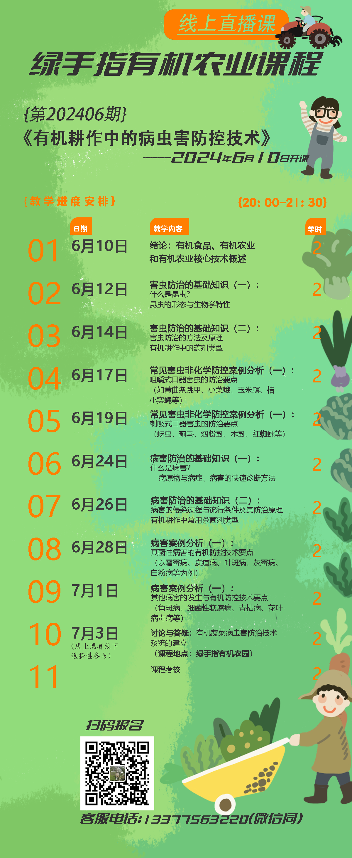 课程亮点:针对有机农人的系统科班体系的课程,了解昆虫的习性,了解真菌细菌病毒病害的不同表现和防治原理,了解有机农业能用的植保产品,了解什么虫态下针对性使用植保可以达到预期的效果。