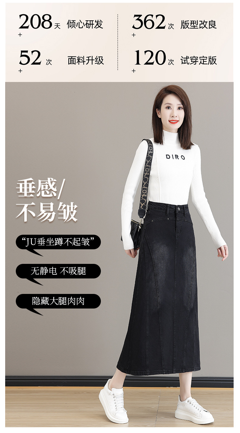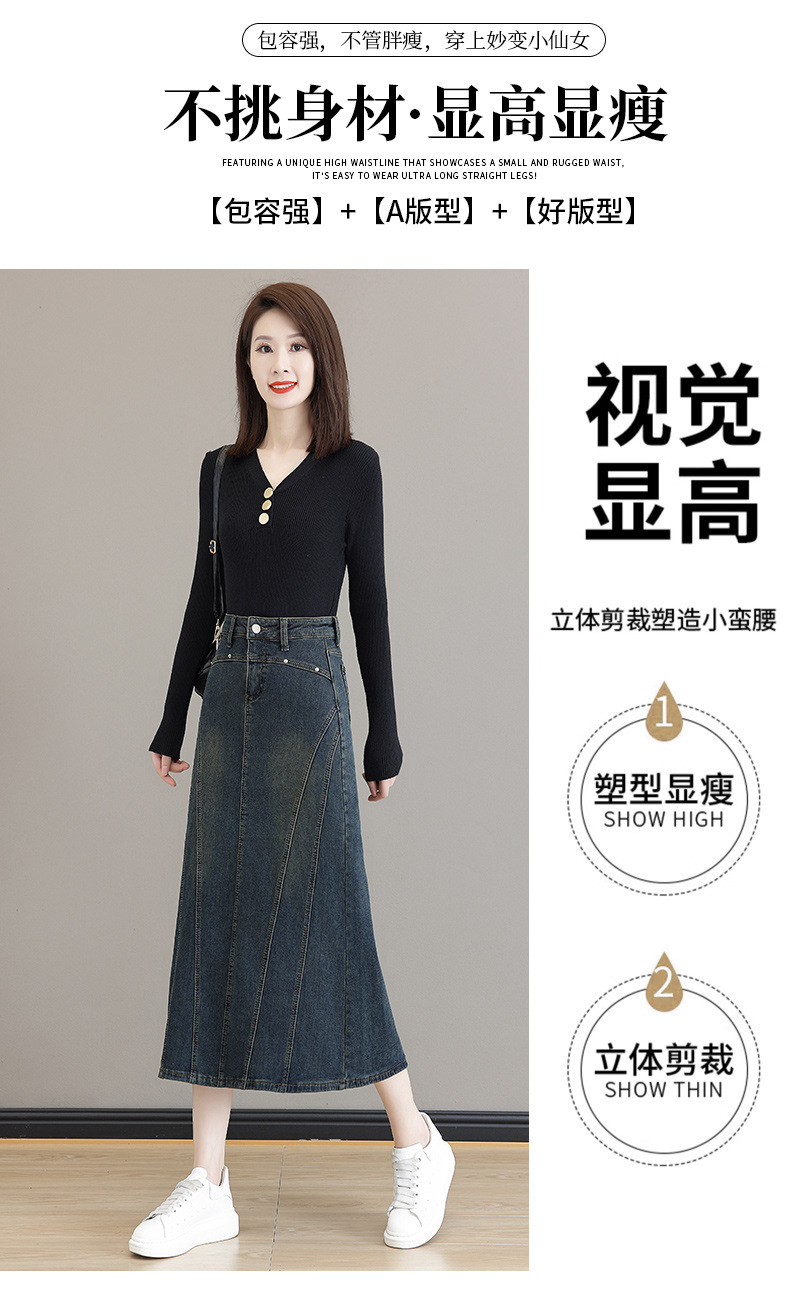 KKM-563-63复古风修身半身裙女2023秋冬新款a字中长款高腰加绒加厚牛仔a字裙 商品图2
