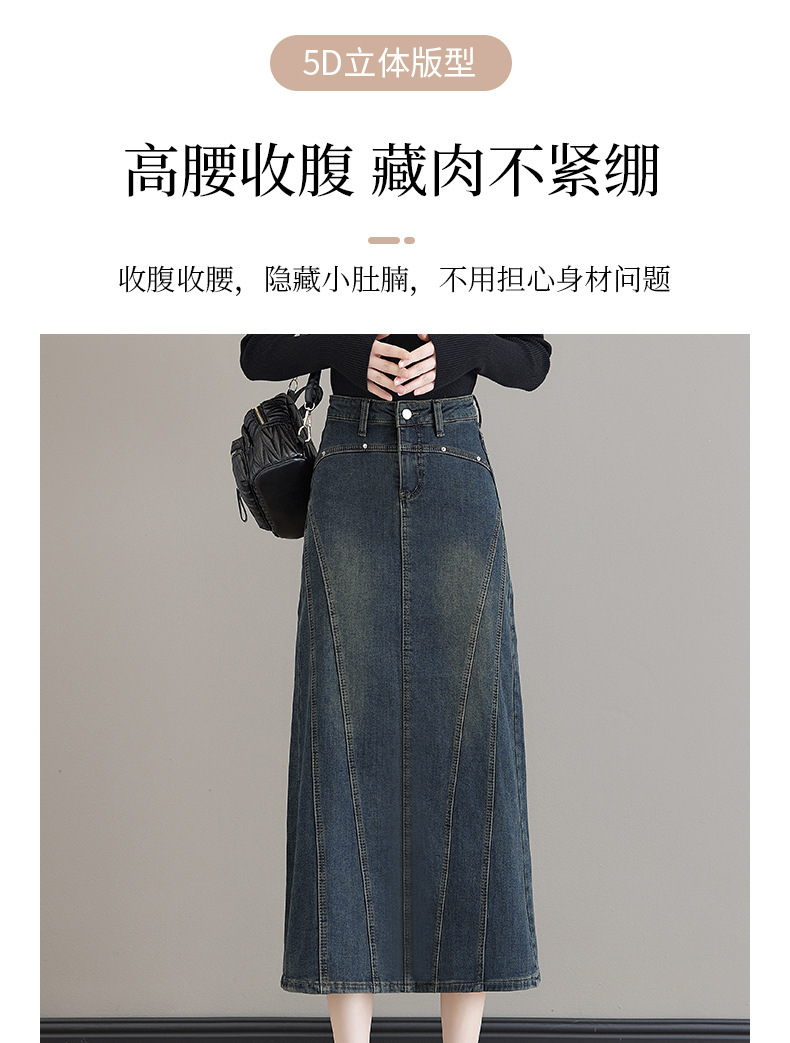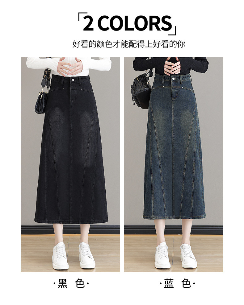 KKM-563-63复古风修身半身裙女2023秋冬新款a字中长款高腰加绒加厚牛仔a字裙 商品图1