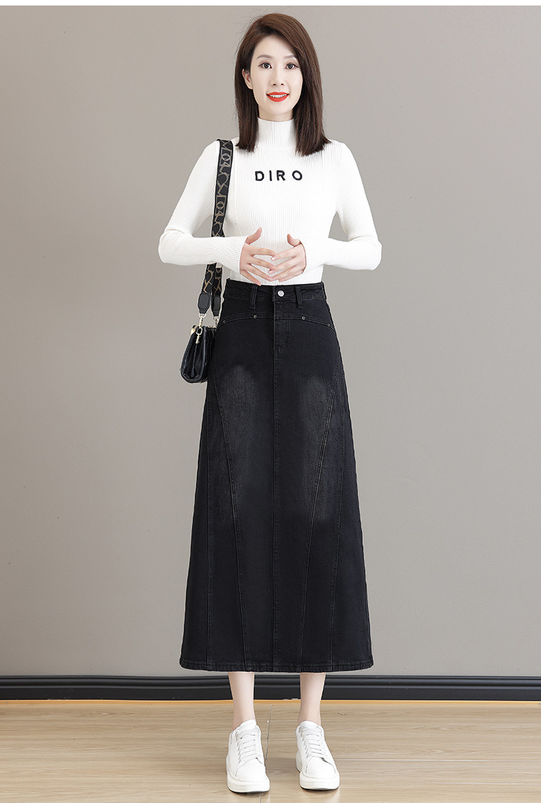 KKM-563-63复古风修身半身裙女2023秋冬新款a字中长款高腰加绒加厚牛仔a字裙 商品图0