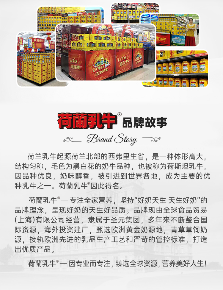 - 荷兰乳牛品牌于1990年进入中国,相伴31年始终致力于为更多家庭奉上优种荷兰乳牛带来的营养与美味。秉承“珍选至纯营养,传承经典醇香”的理念,打造一个覆盖全人群、多品类、高品质的国际化品牌。